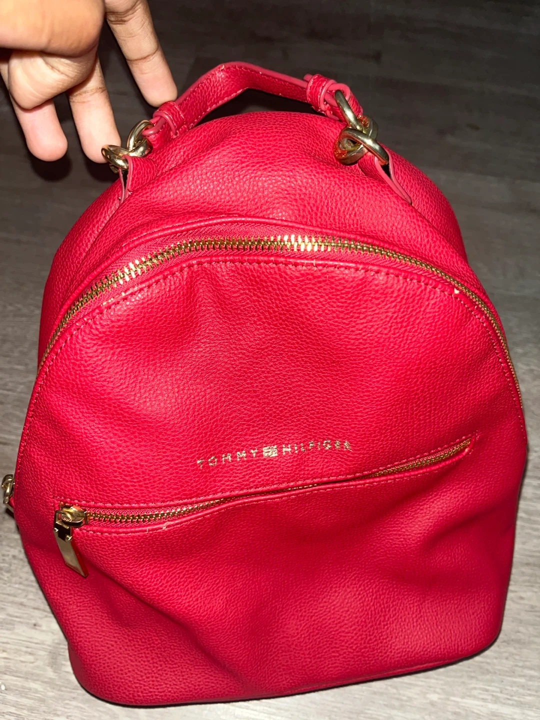 This is a cute red backpack from Tommy Hilfiger! It's a great size for everyday use and the colour is so vibrant. It has a front zipper pocket and adjustable straps. Cheap price because it’s Christmas 😊.