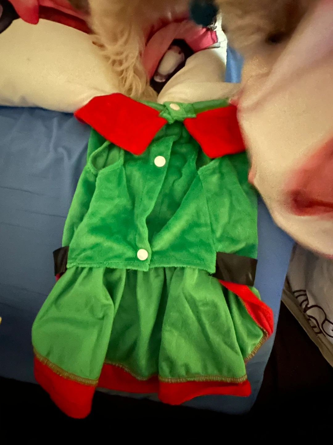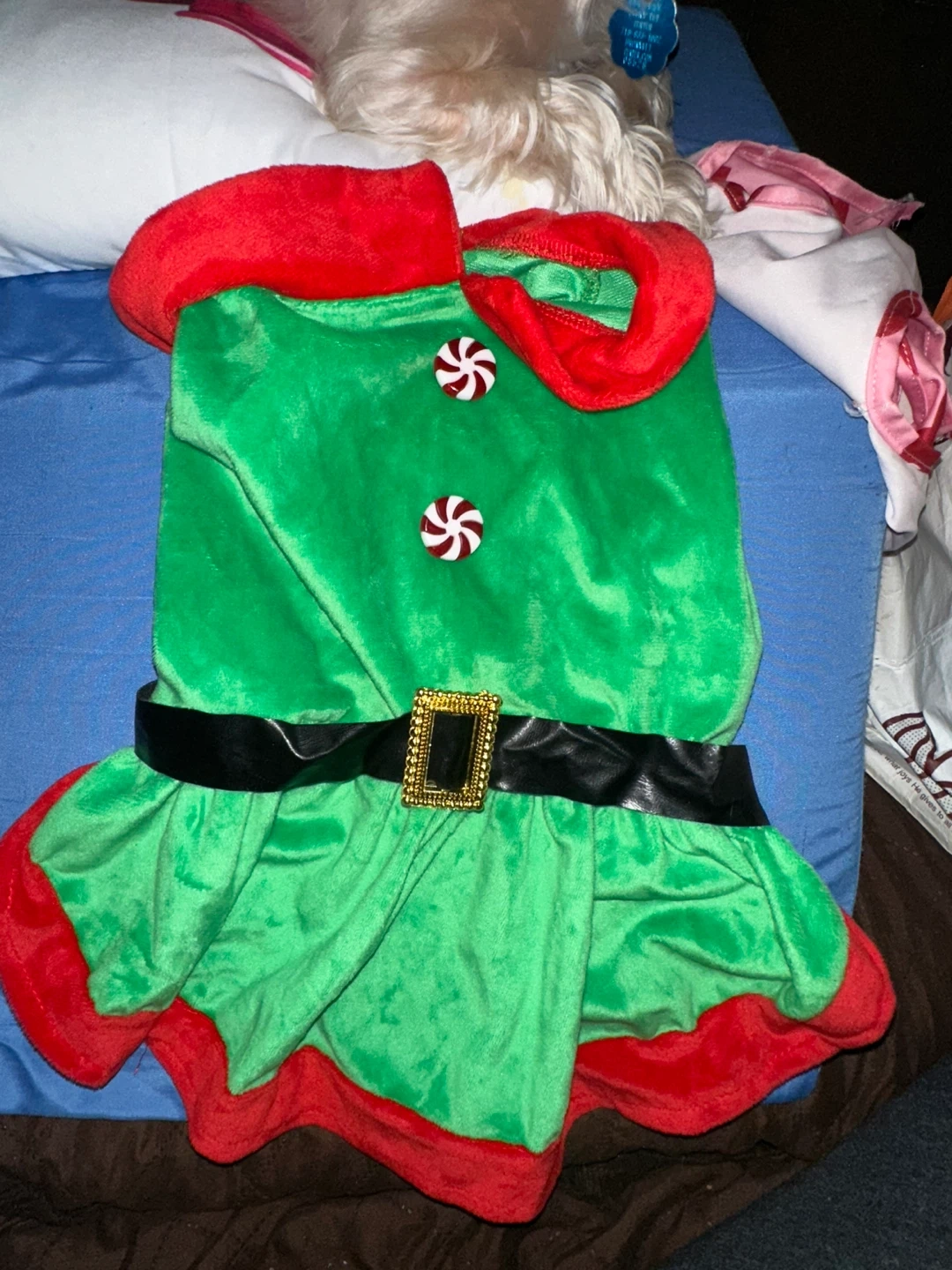 This adorable elf costume is perfect for your furry friend this holiday season! It's made of soft, plush material for comfort and features a cute candy cane button detail. Fits most small to medium dogs.