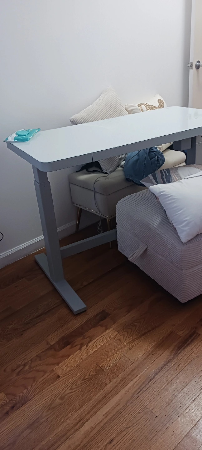 Selling an adjustable standing desk! It's in great condition and ready for a new home. It has a sleek design that would fit into any home office. It can be adjusted to different heights for sitting or standing.