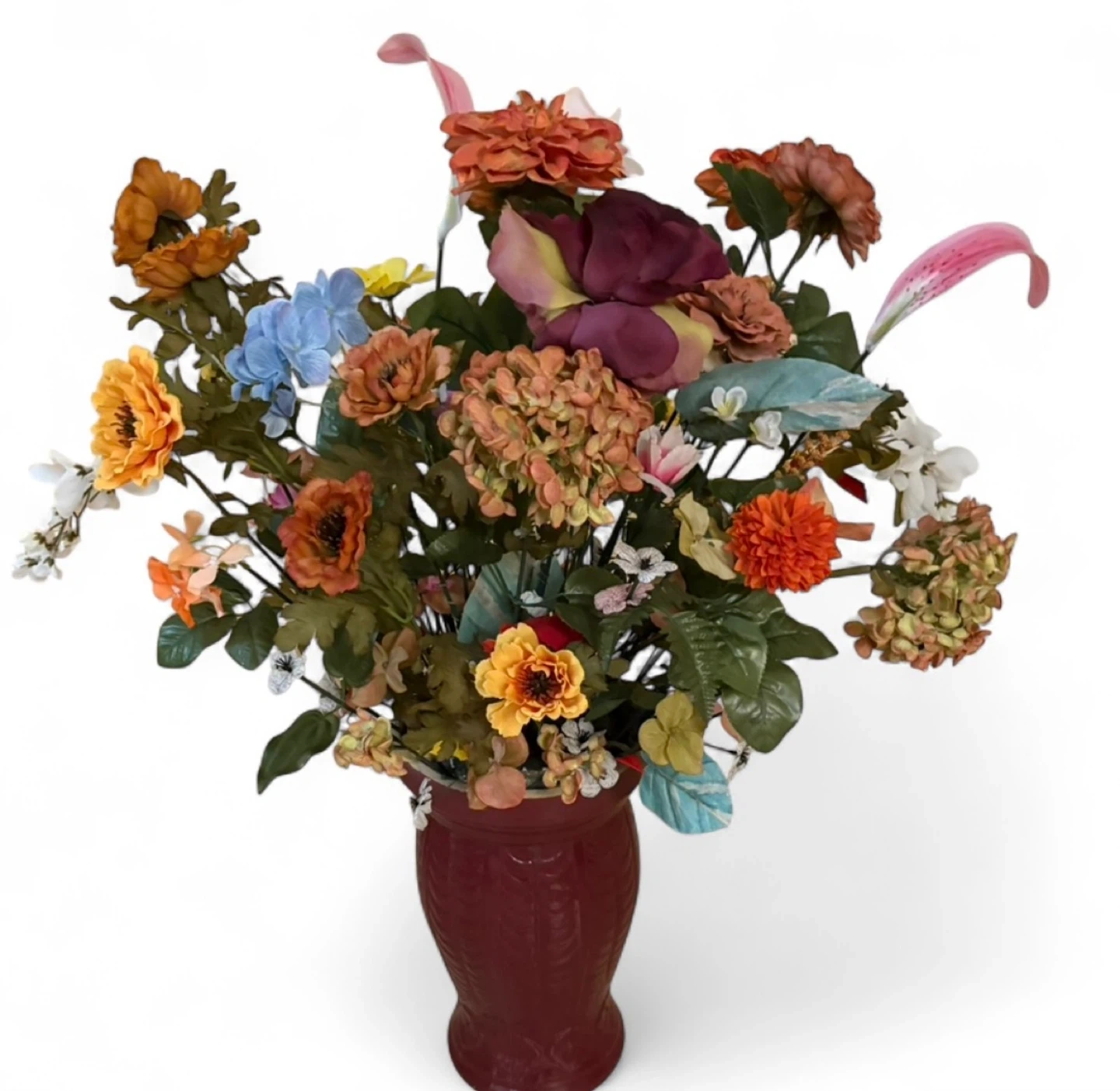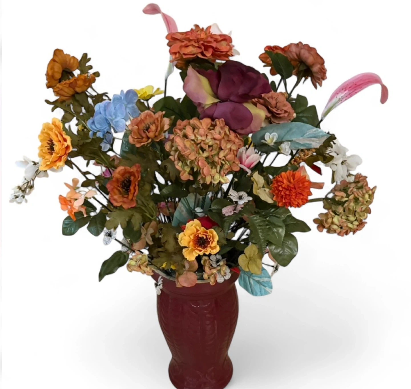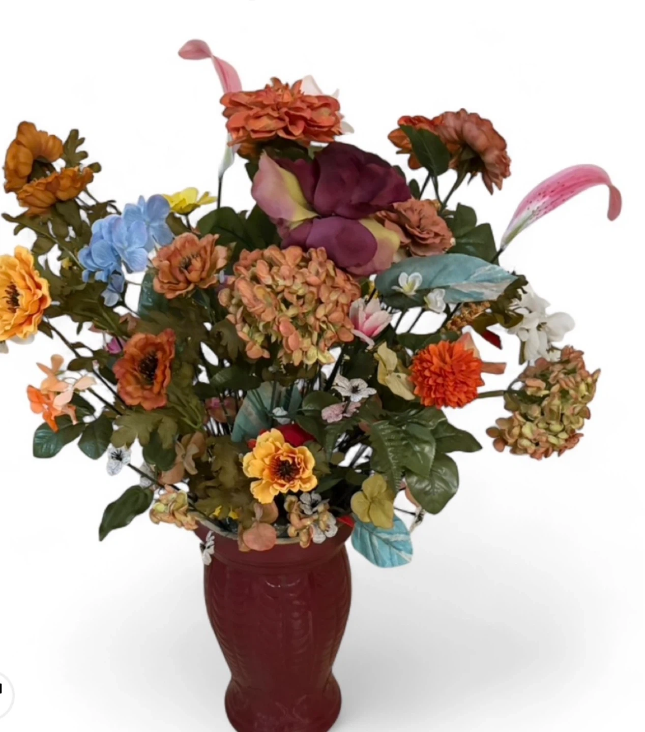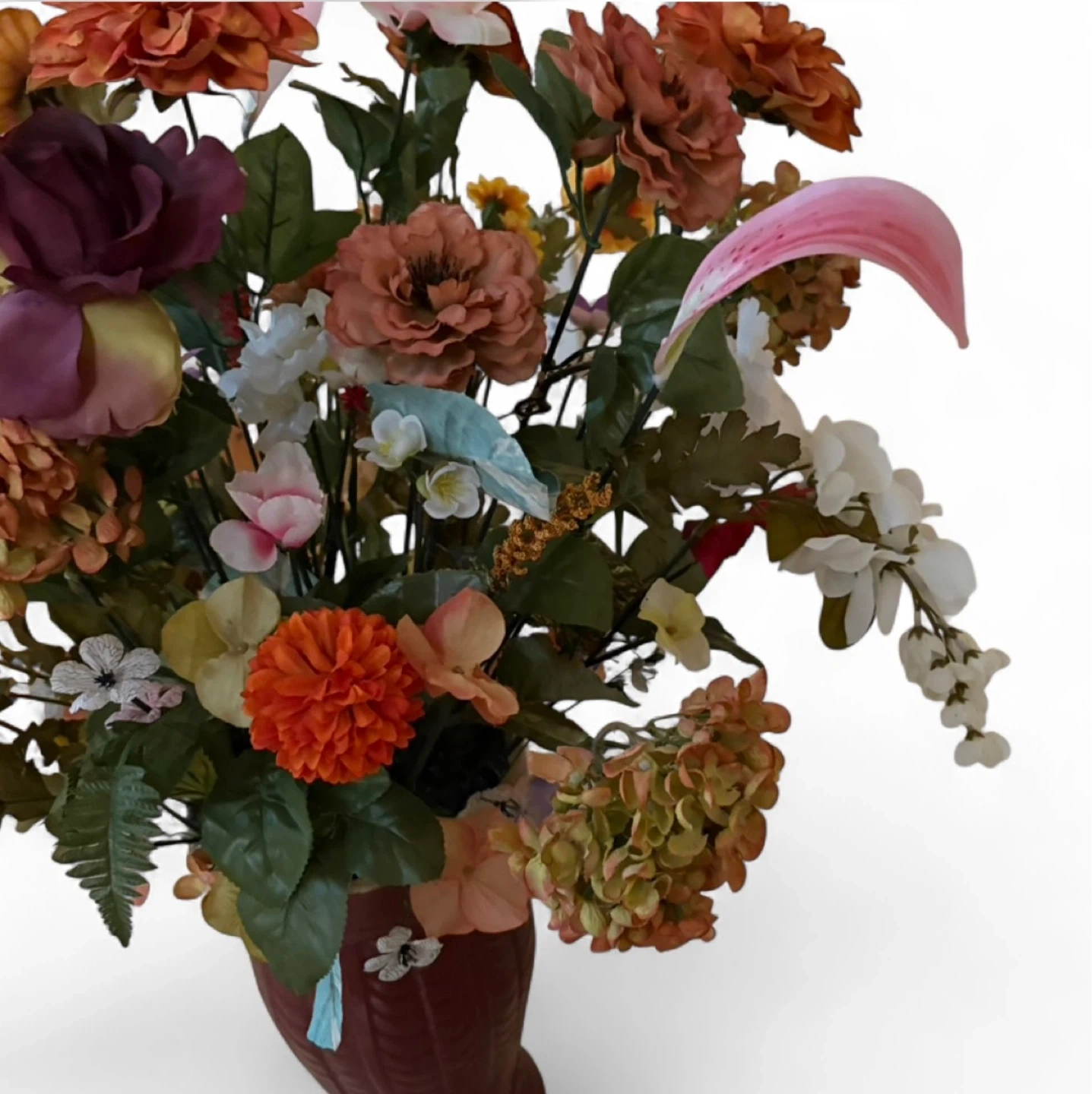 This vibrant artificial floral arrangement showcases a variety of colorful blooms and greenery. It's arranged in a decorative red vase. This piece adds a pop of color to any room!