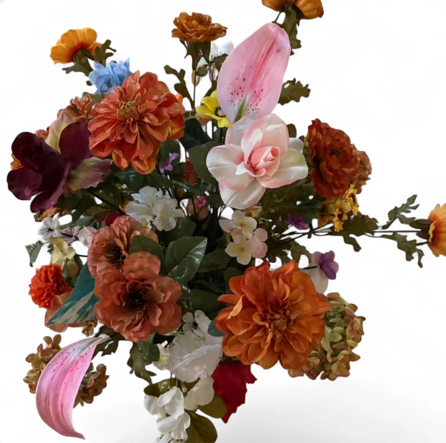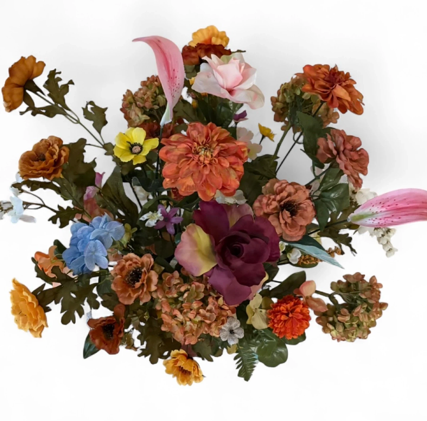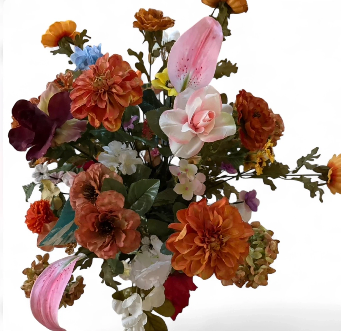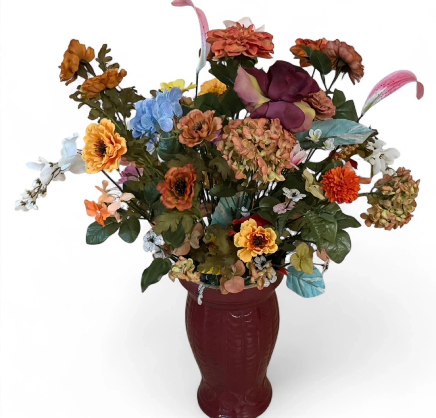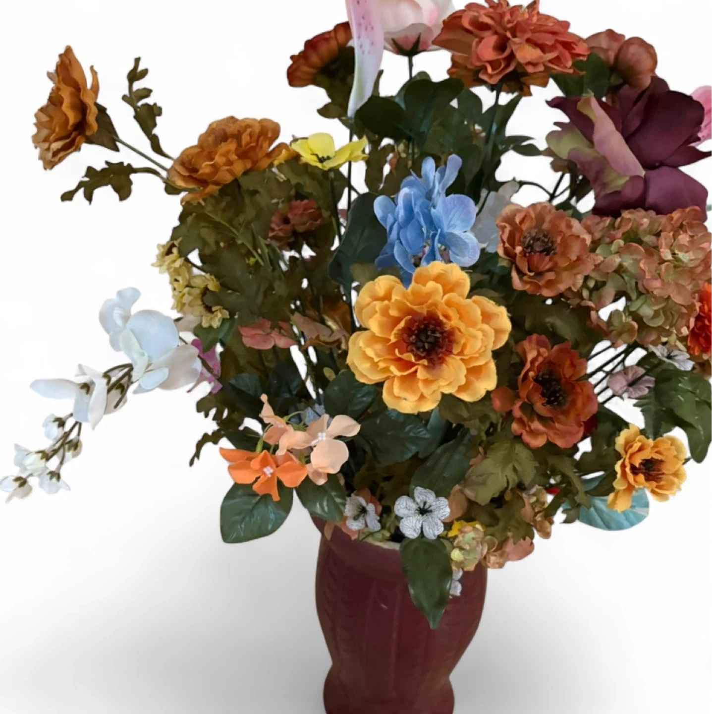 This vibrant artificial floral arrangement showcases a variety of colorful blooms and greenery. It's arranged in a decorative red vase. This piece adds a pop of color to any room!