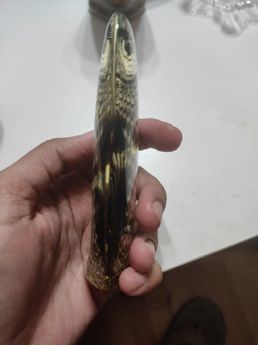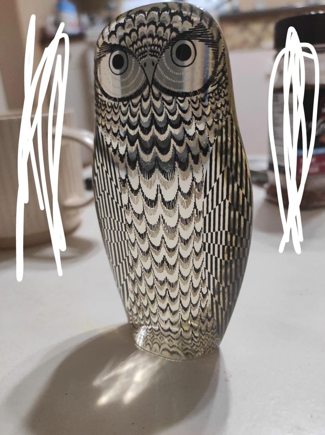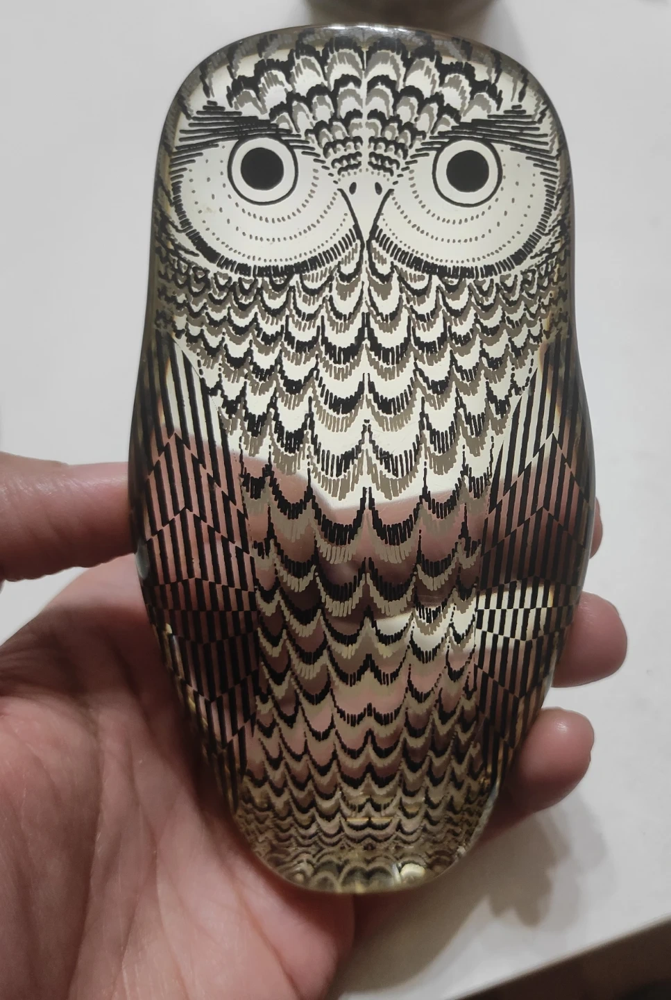 This item is a vintage Abraham Palatnik lucite owl sculpture, likely from his Artemis collection made in Brazil during the 1970s. The figurine is known for its Op Art style and often features detailed patterned illustrations trapped within a clear acrylic body.