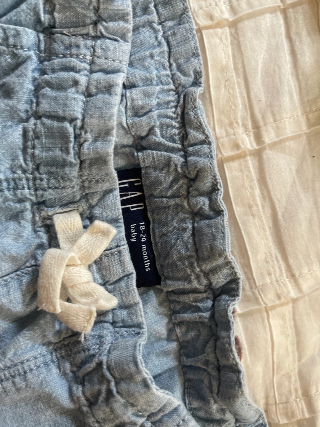 These are a pair of Gap Baby pants in a light blue color. They are sized for 18-24 months. They have a comfortable elastic waistband. Linen cotton blend very nice pants for the summer. Pick up at 6262 N Harlem Ave