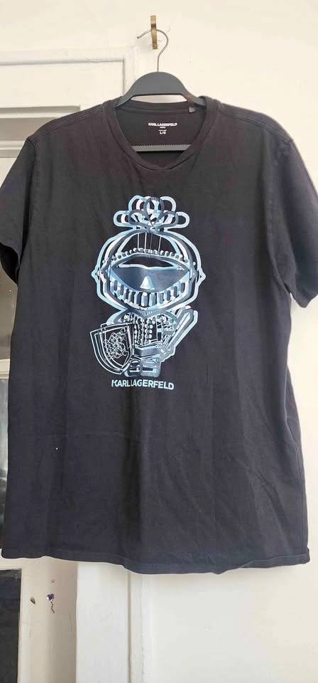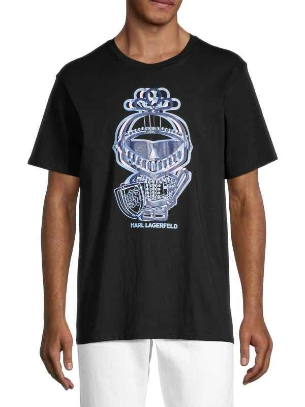 Design: The shirt features a graphic print of a stylized Karl Lagerfeld character wearing a knight's helmet and holding a shield. The graphic on this specific shirt has a tri-tone or outline effect.