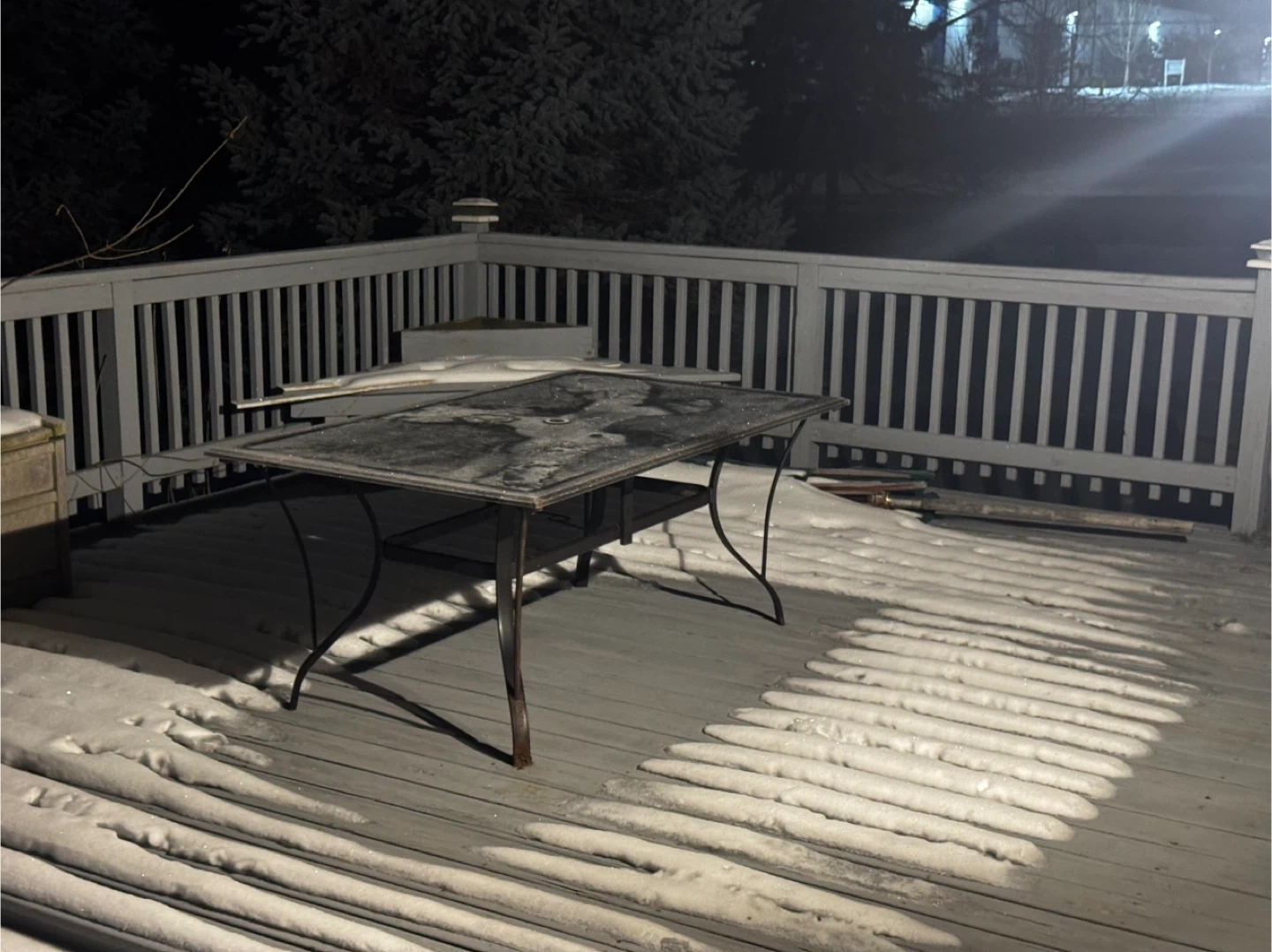This is a patio dining table with a metal frame and a glass tabletop. It has an ornamental design on the glass. The table's frame is black metal with curved legs. It's perfect for outdoor use on a deck or patio. Measures approximately 30" H x 40" W x 26" D.