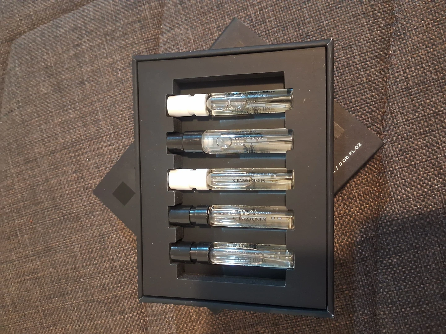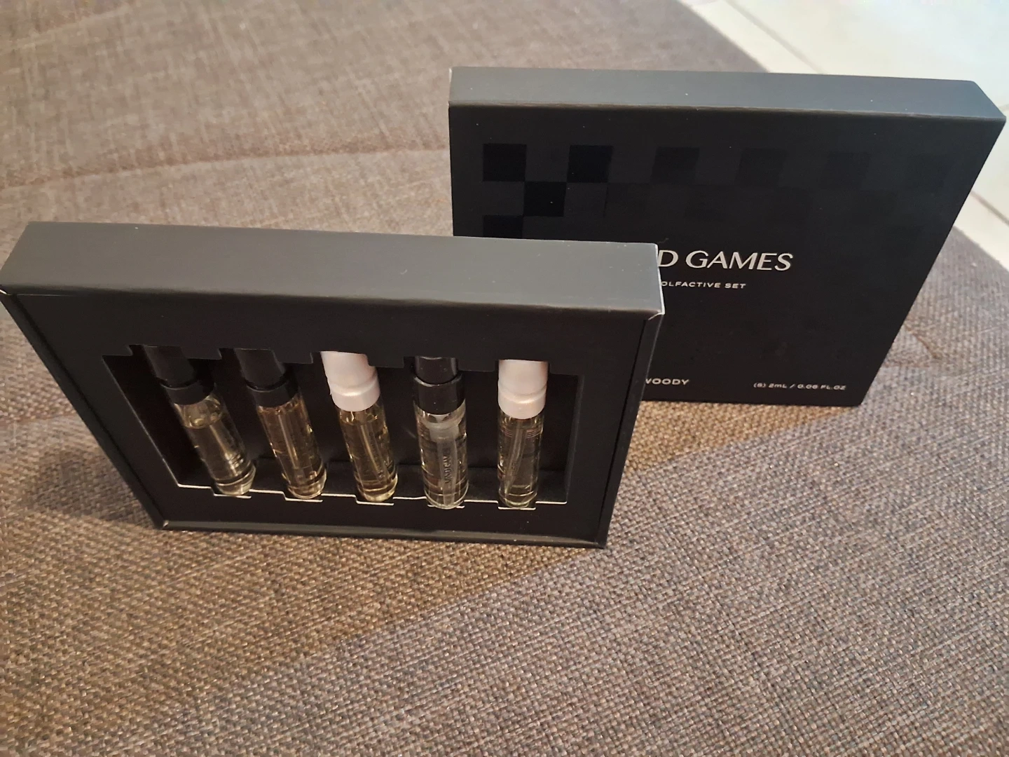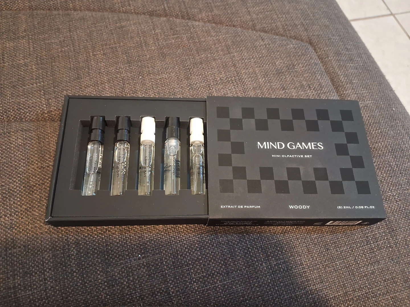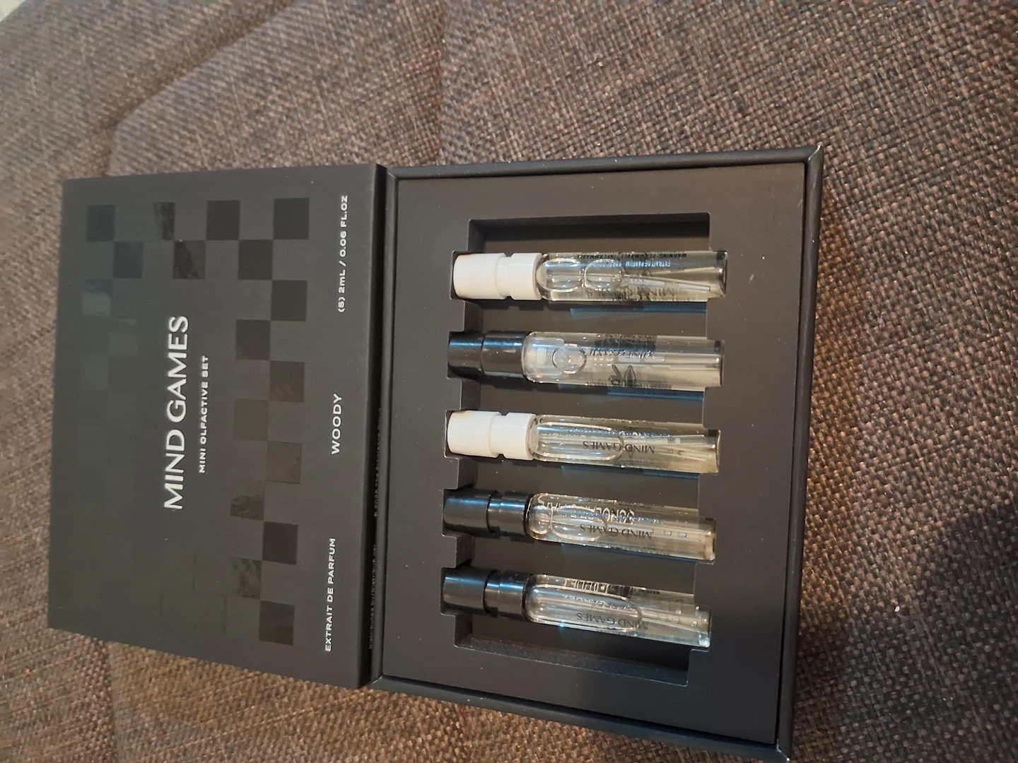 This is the Mind Games Mini Olfactive Set featuring woody scents. It includes five 2ml bottles of Extrait de Parfum. This set is perfect for trying out different fragrances.