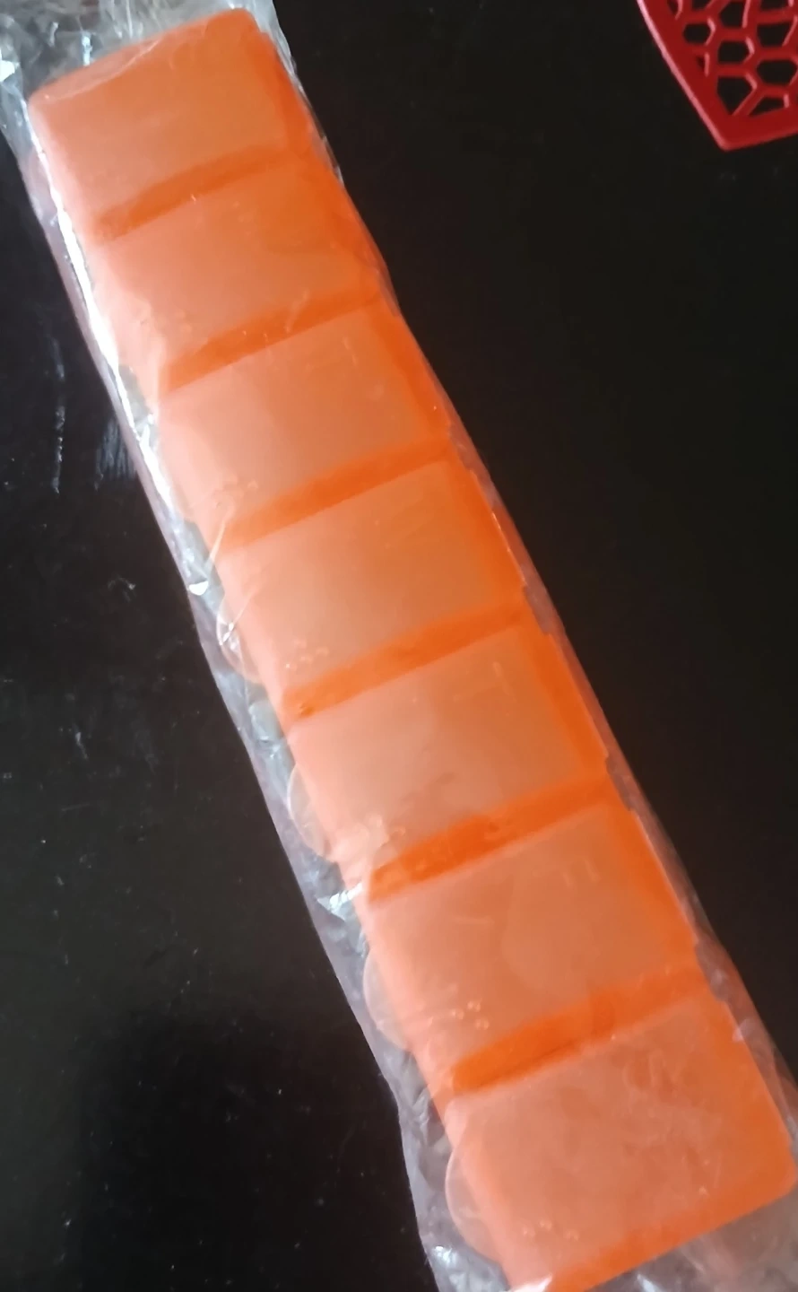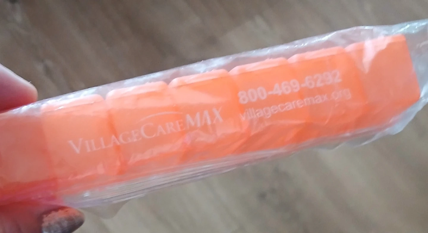 This is a VillageCareMAX pill organizer. It has seven compartments for daily medication. Organizer is orange plastic.