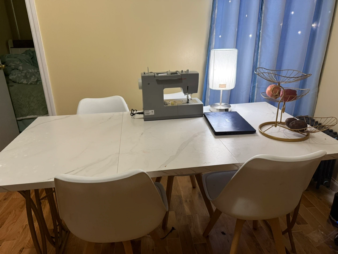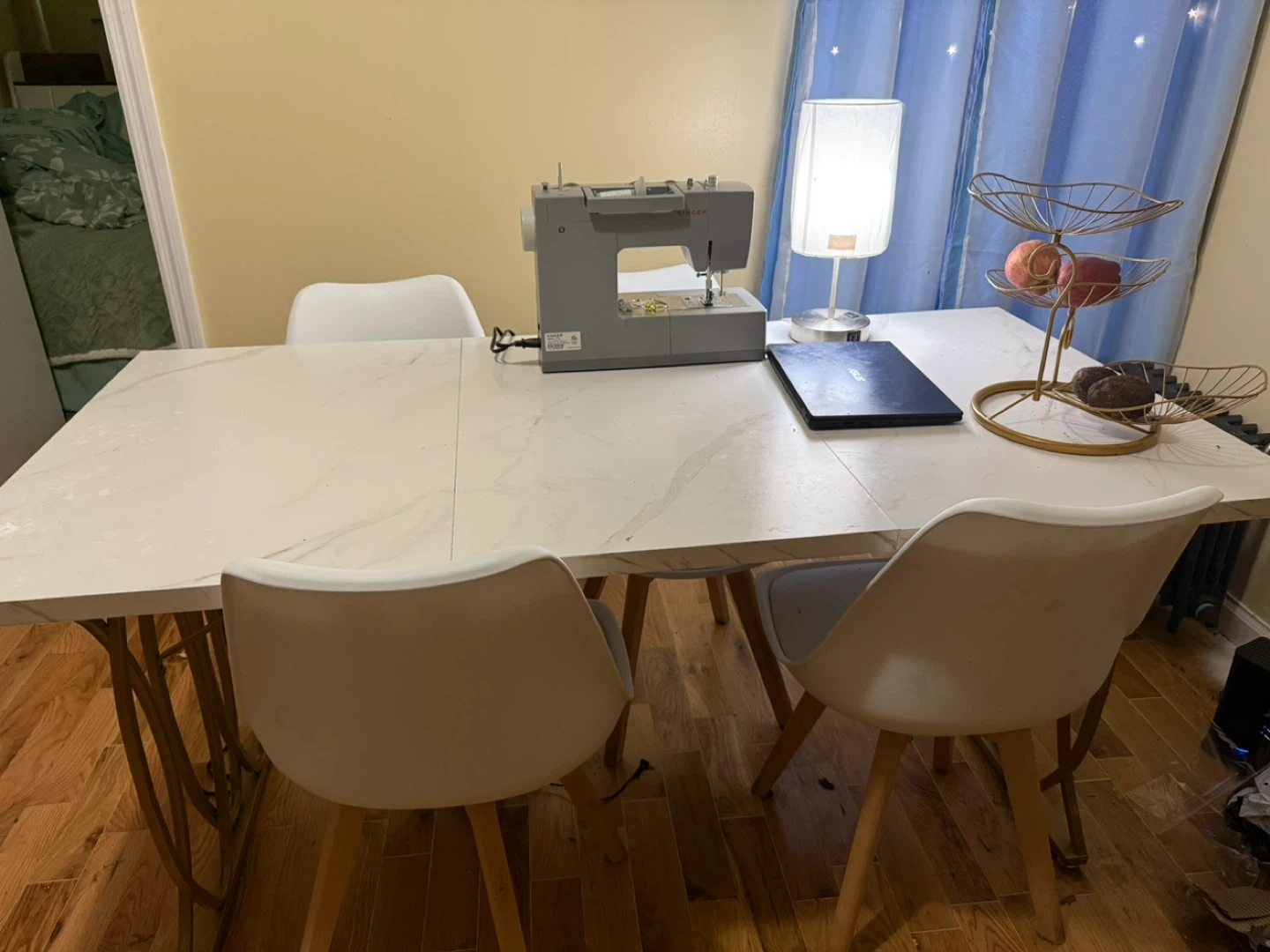 Selling a dining table with four chairs. The table has a white marble-like top and wooden legs. The chairs are white with wooden legs as well. It's in good condition and ready for a new home!