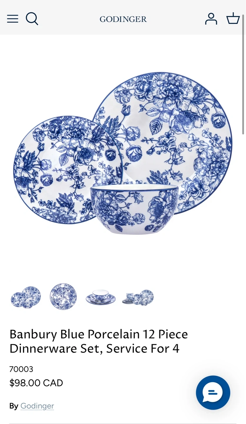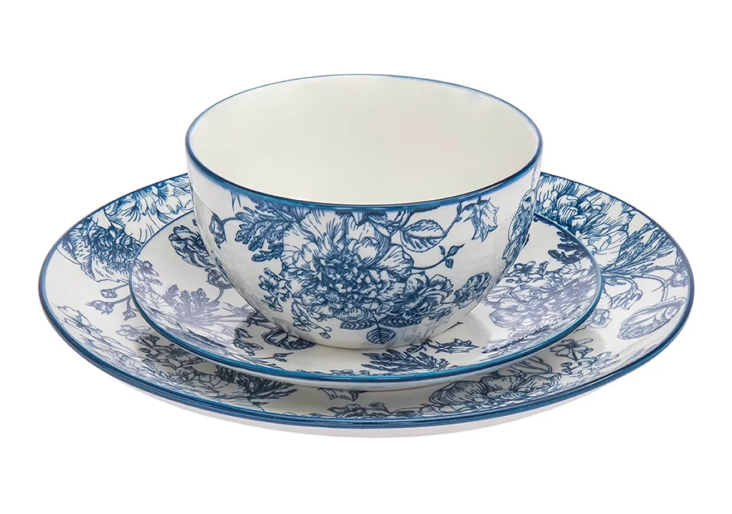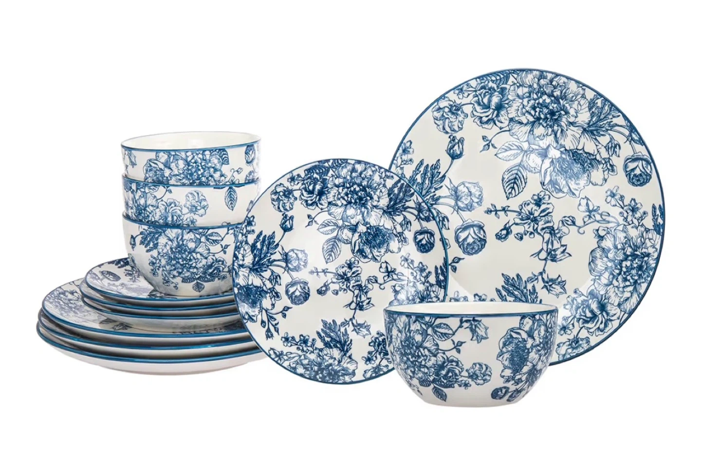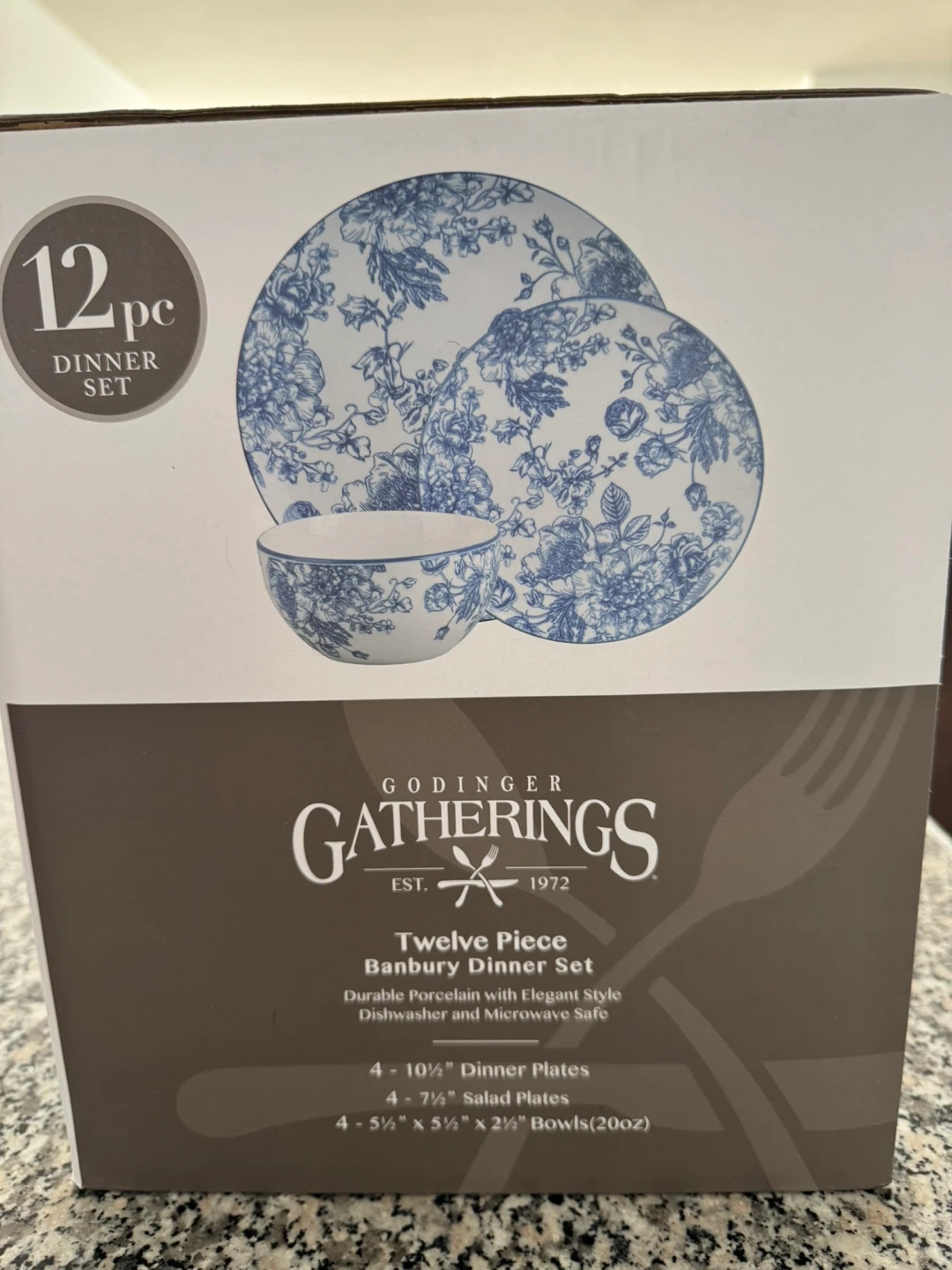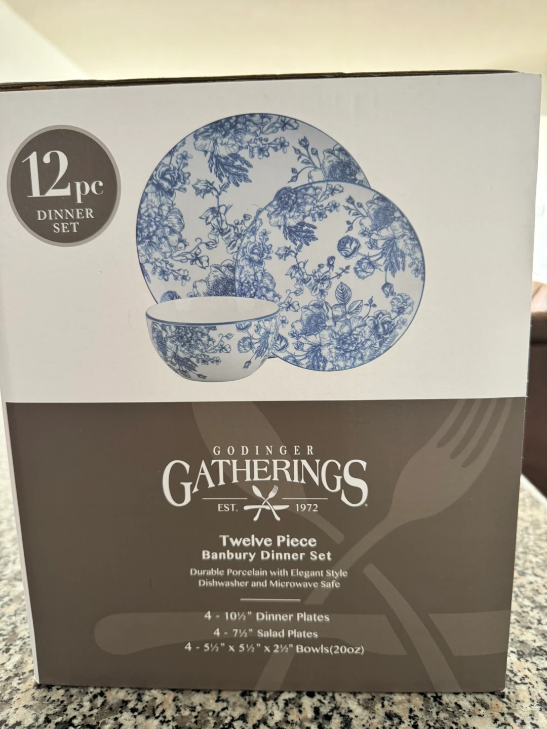 This is a 12-piece dinnerware set by Godinger Gatherings, part of the Banbury collection. It includes 4- 10½" dinner plates, 4- 7½" salad plates, and 4- 5½" x 2¼" bowls. The durable porcelain is dishwasher and microwave safe.