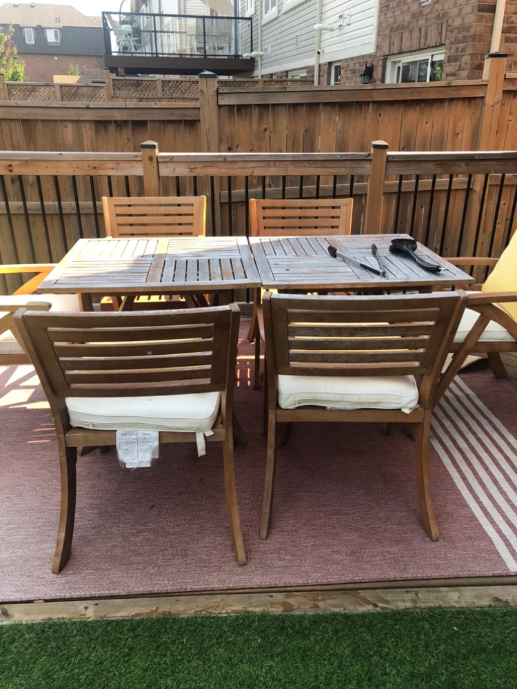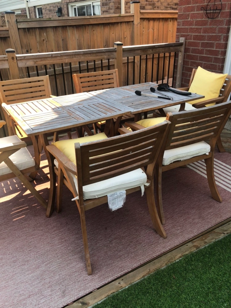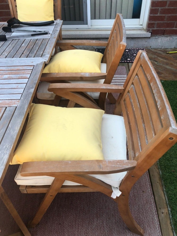 Easy to wash, wood top needs to be re-stained for summer use!
