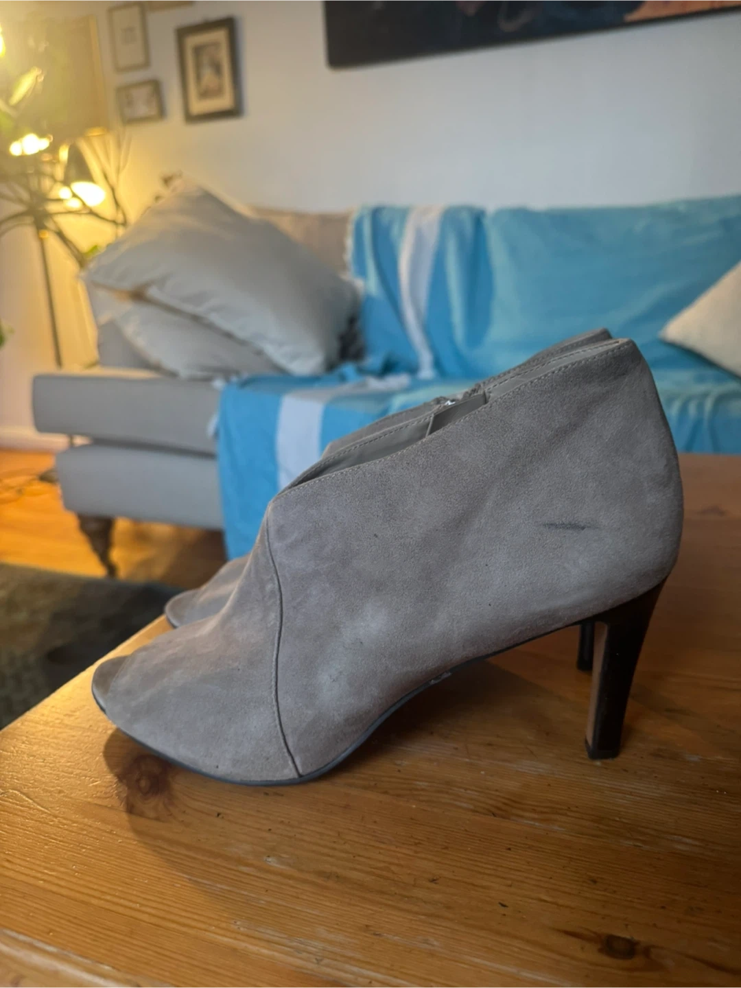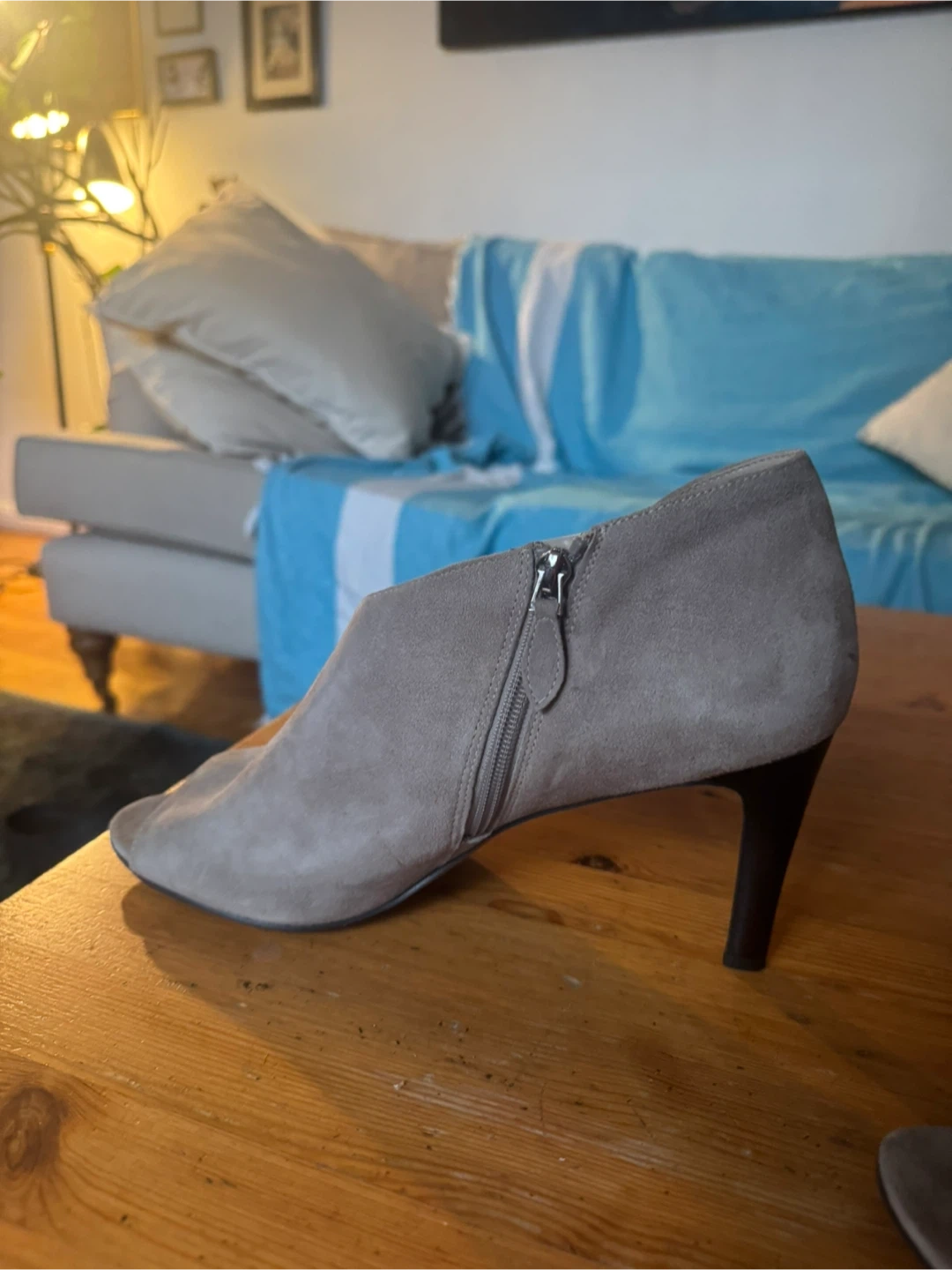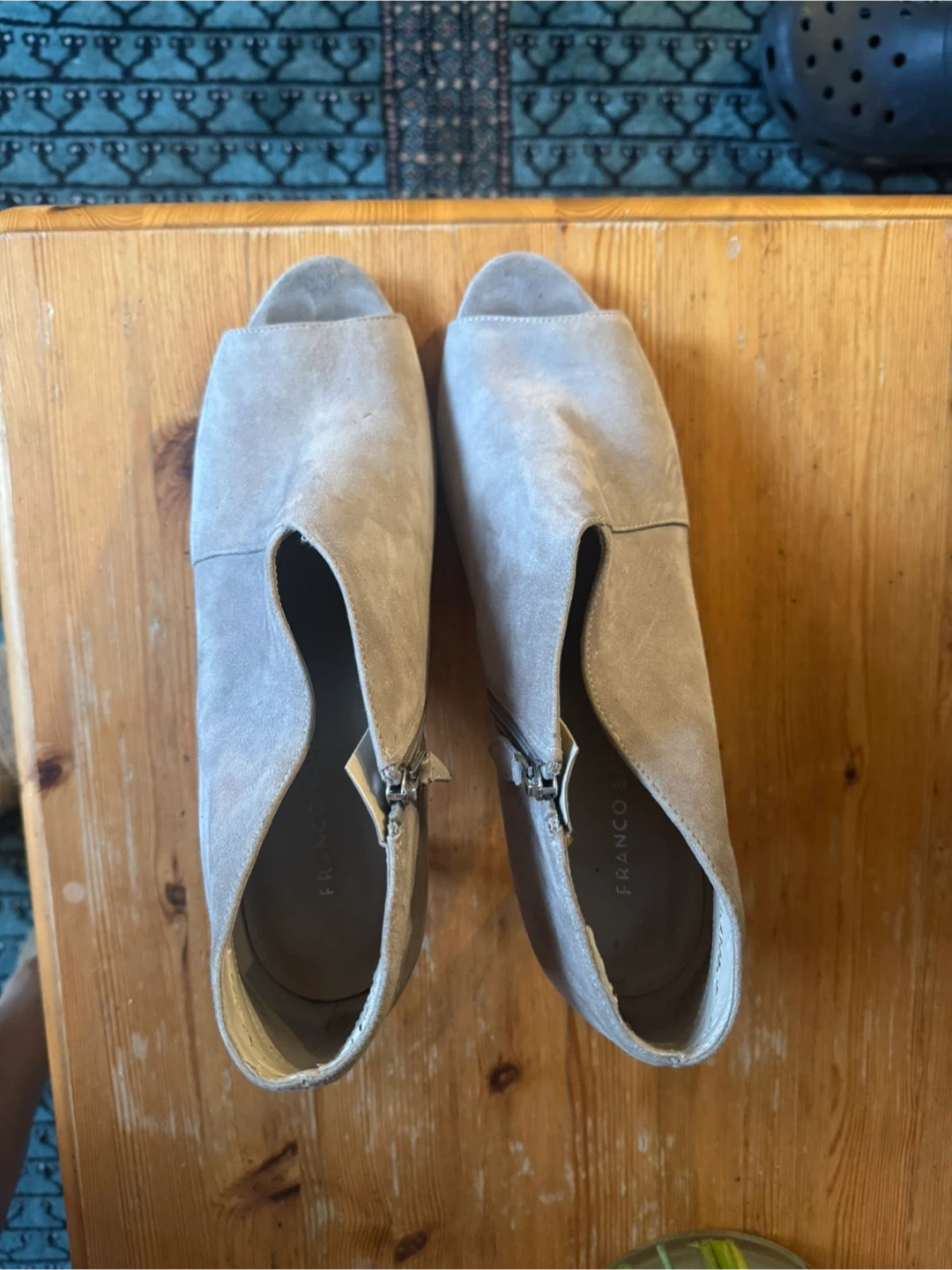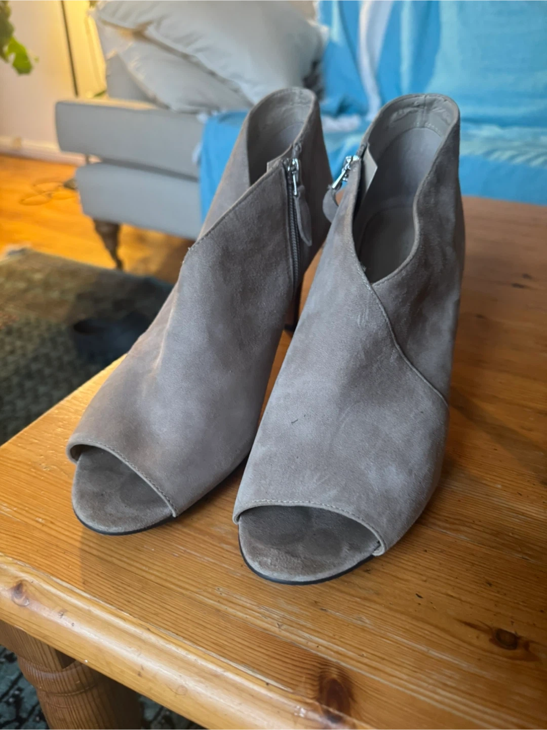 Franco Sarto taupe suede ankle booties with a peep toe and side zipper. These feature a stacked heel and are made of suede material. They're stylish and comfortable for everyday wear!