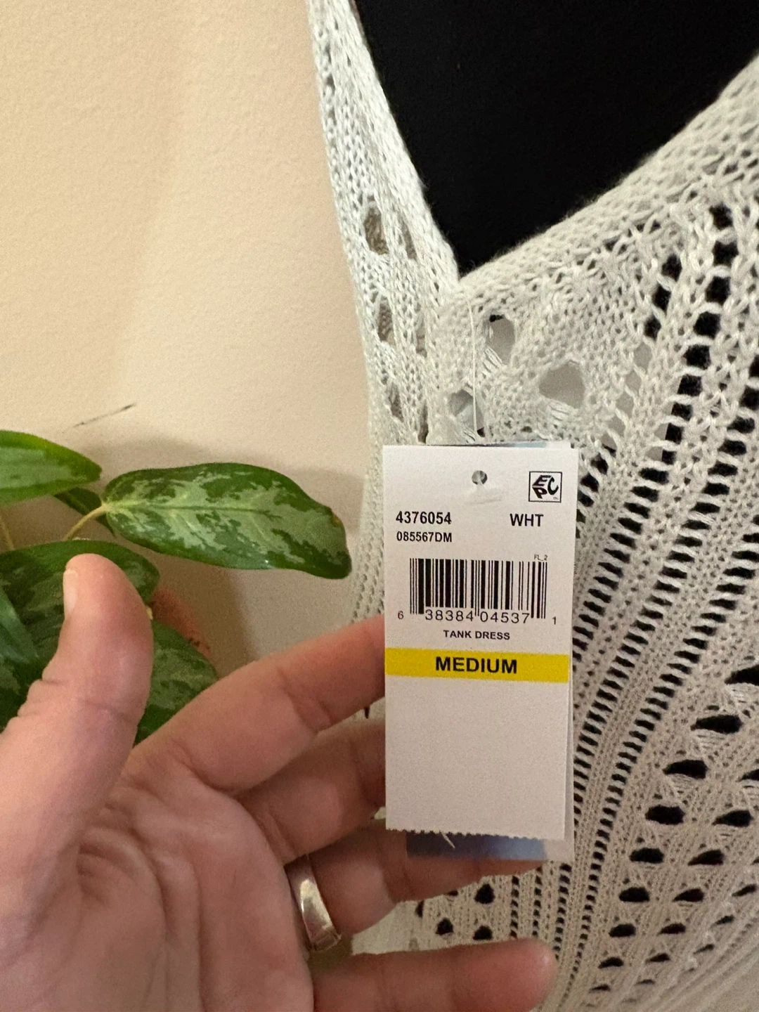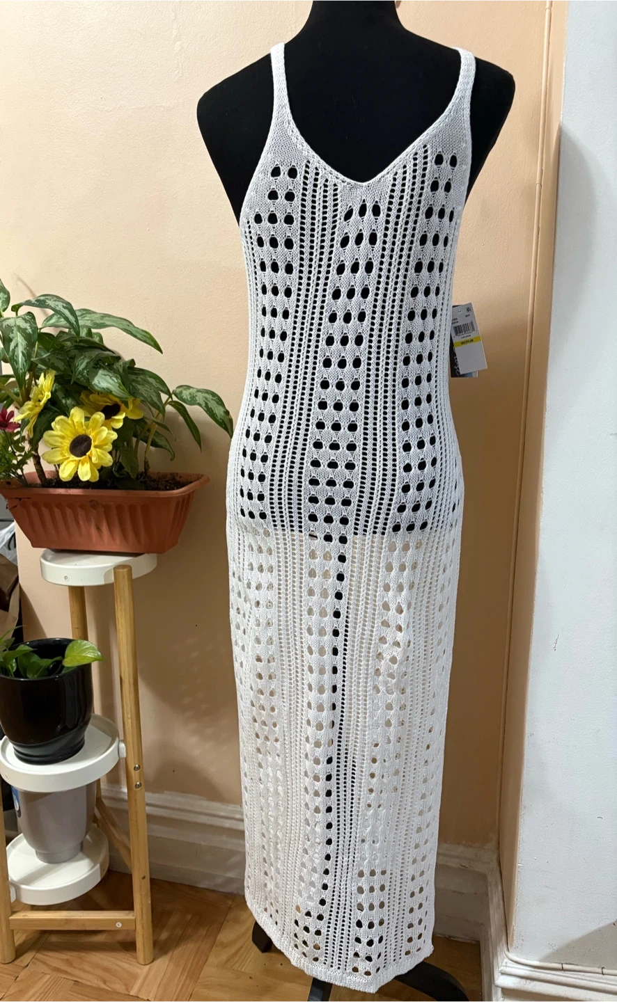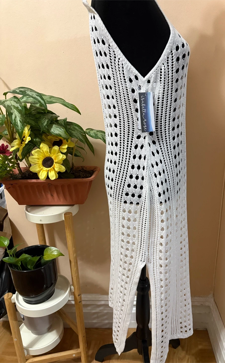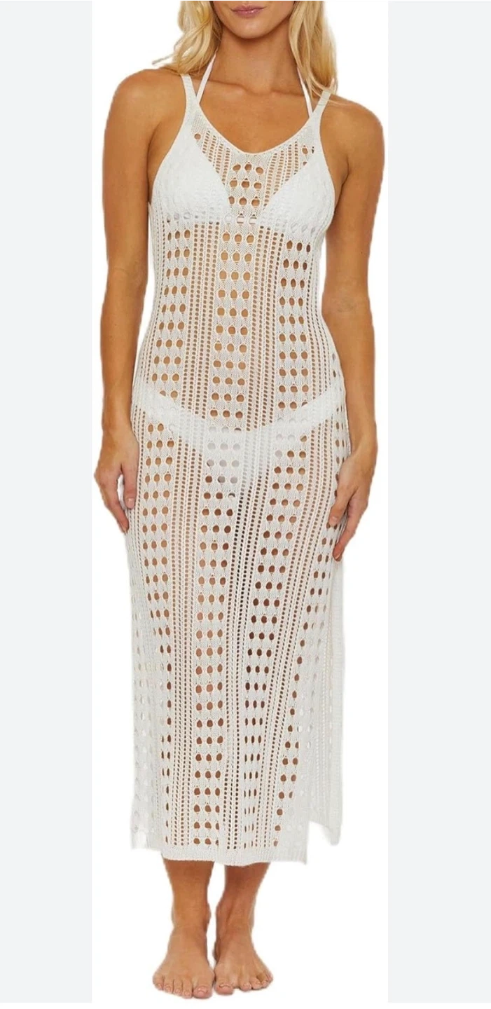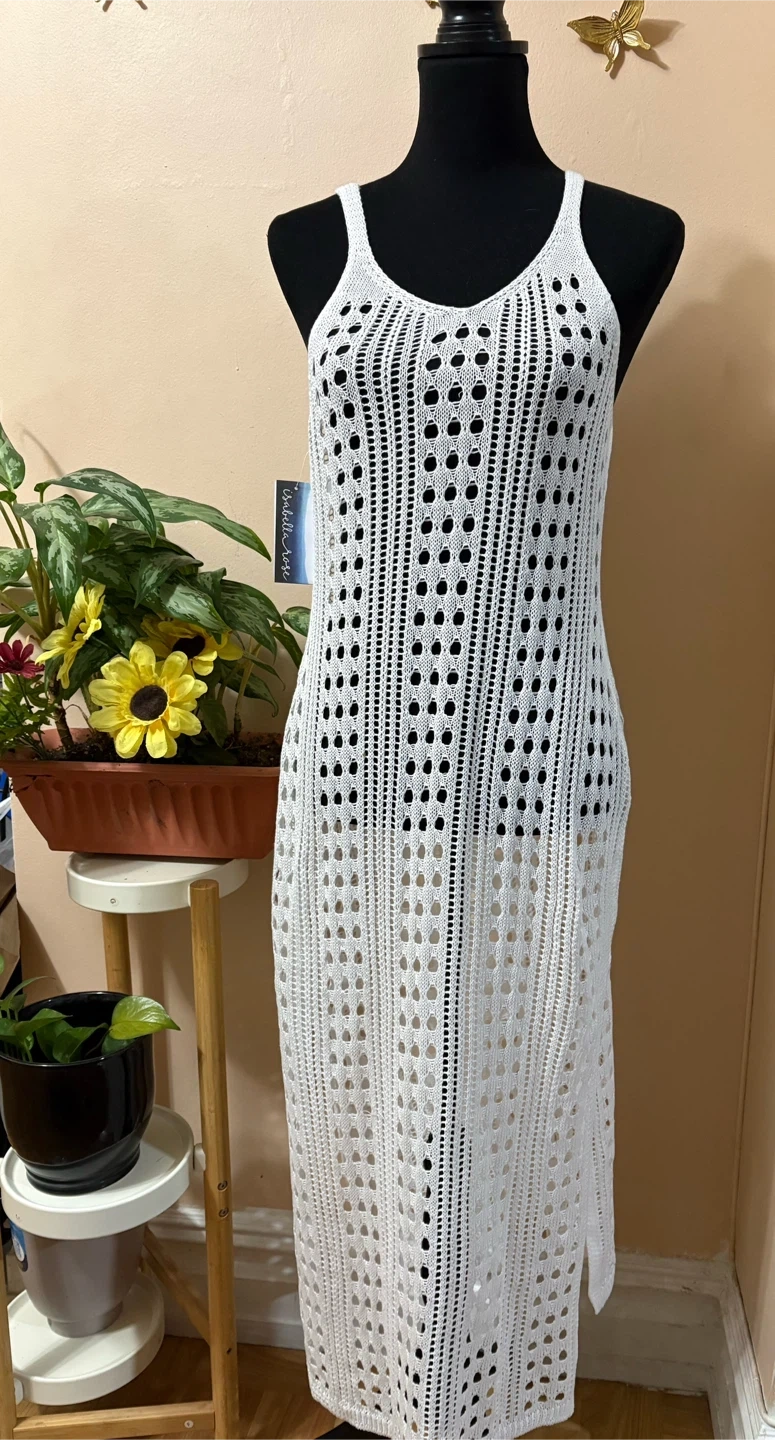 This Isabella Rose knit tank dress is white and size medium. It features a crocheted, open knit design with a V-neckline and a maxi length. Perfect for beachwear!