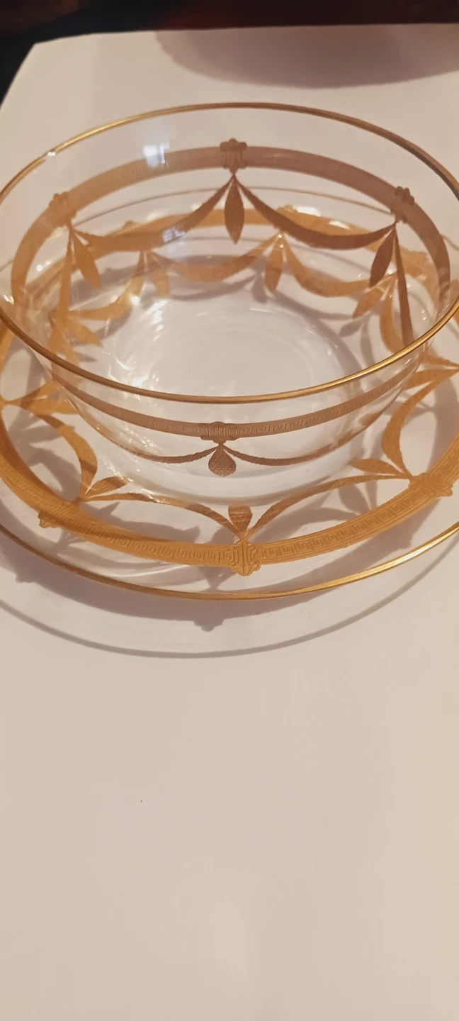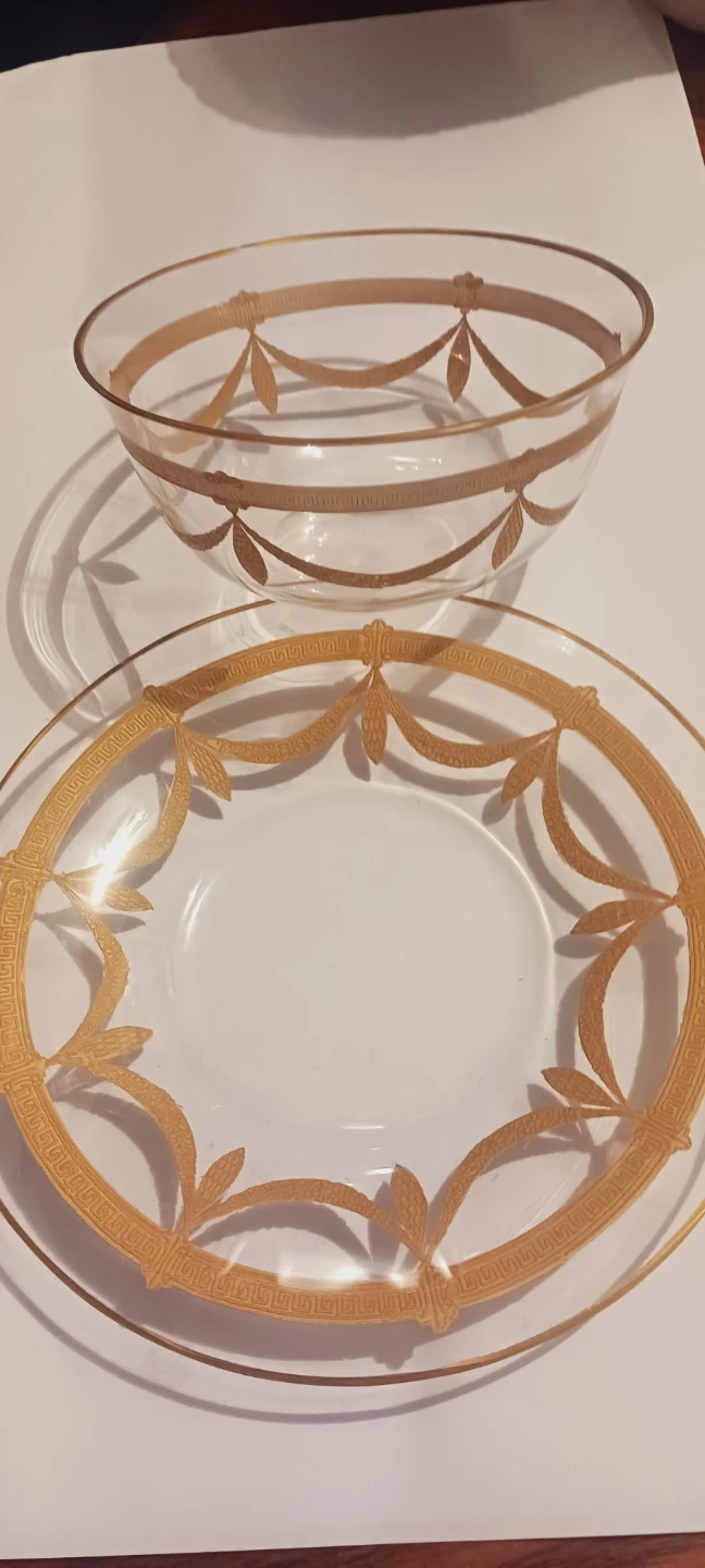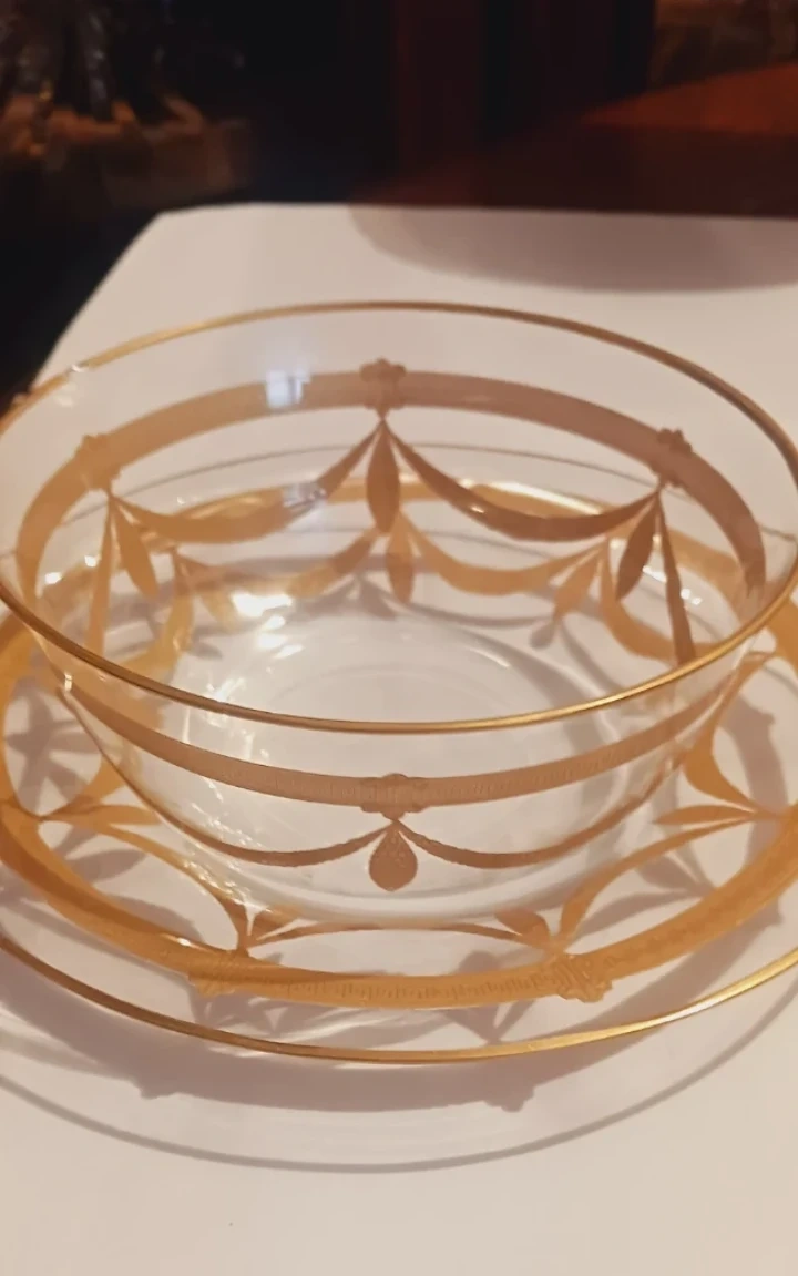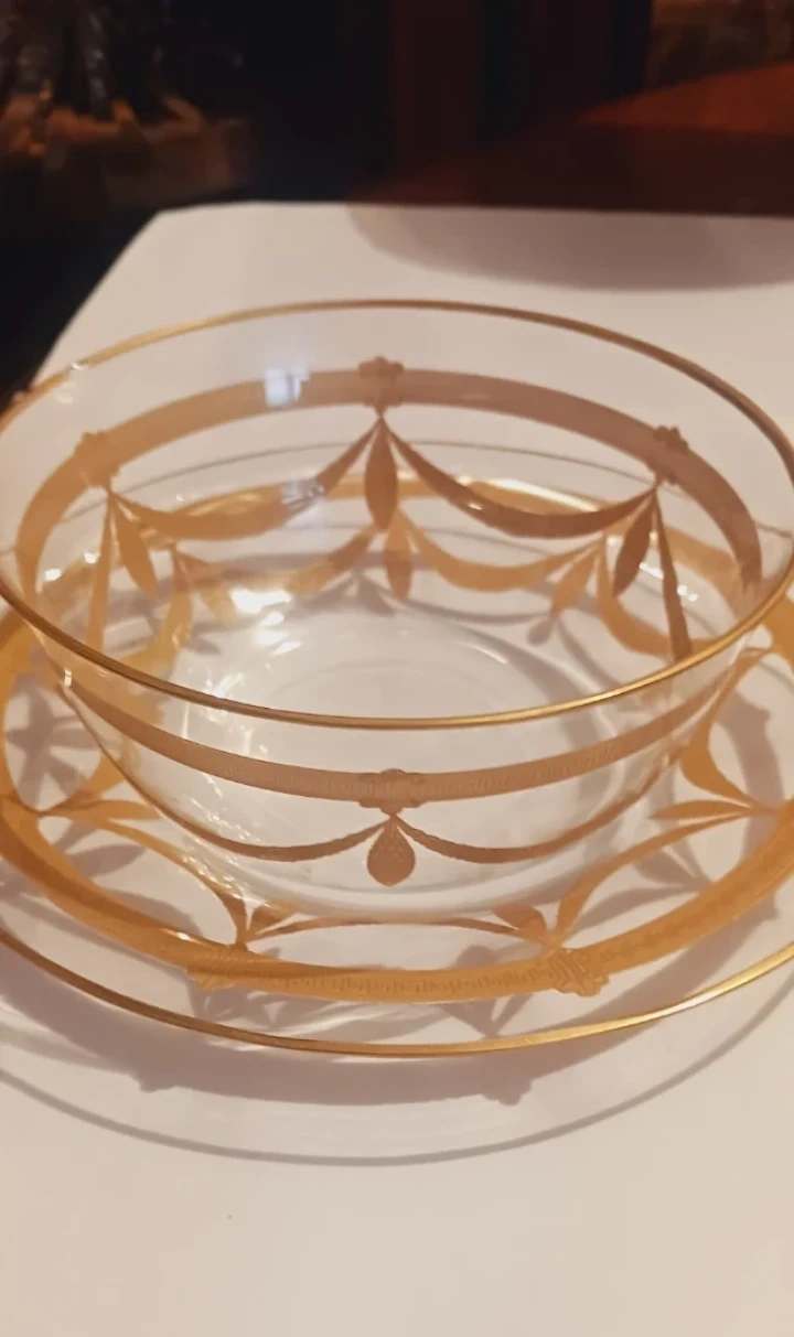 MOSER LOBMEYR ANTIQUE BOHEMIAN 1880s 19th CENTURY 24KARAT GOLD ETCHED BOWS & WREATHS DESIGN HANDPAINTED HANDBLOWN FINE CZECH CRYSTAL GLASS FINGER BOWL AND UNDERPLATE SET. It was made in 19th Century, 1880s in Austro- Hungarian Empire. Excellent condition. It's perfect for serving individual desserts, ice cream or small appetizers. The bowl is 5" diameter and 2" high and the underplate is 6" diameter. Made in Austro - Hungarian Empire !! MY PRICES ARE NEGOTIABLE !!