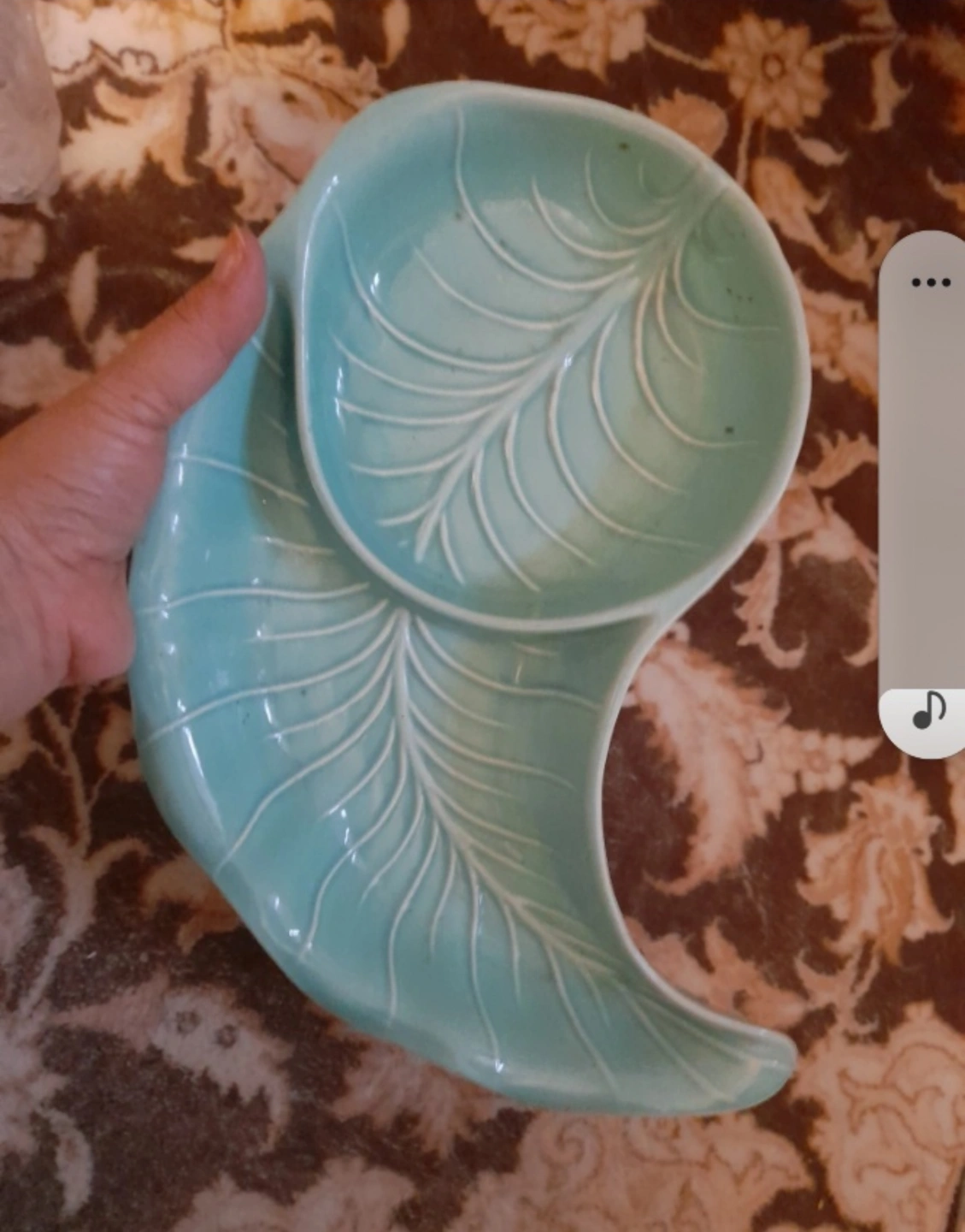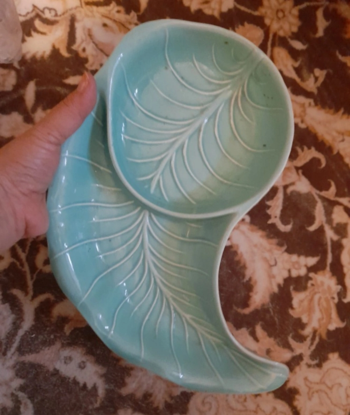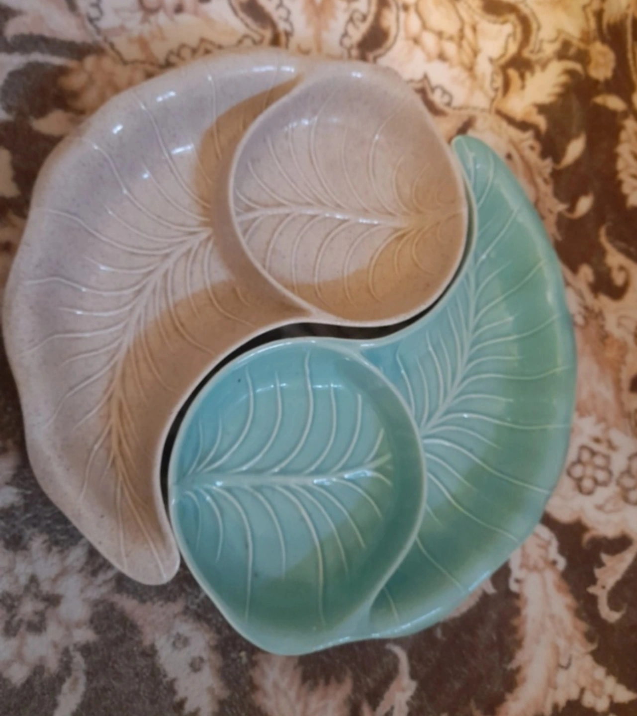 The set comprises multiple crescent-shaped dishes designed to fit together, forming a larger, often circular, serving arrangement. The dishes are in shades of beige and turquoise/aqua, featuring a leaf-like or cabbage leaf pattern.