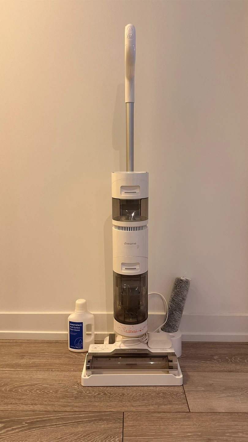 Dreame wet dry vacuum cleaner. It comes with a bottle of multi-surface floor cleaner. This unit is great for tackling spills and cleaning floors simultaneously!