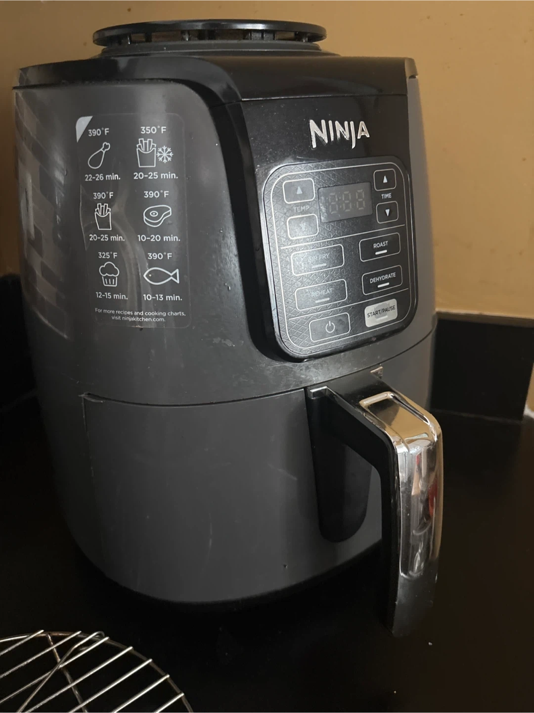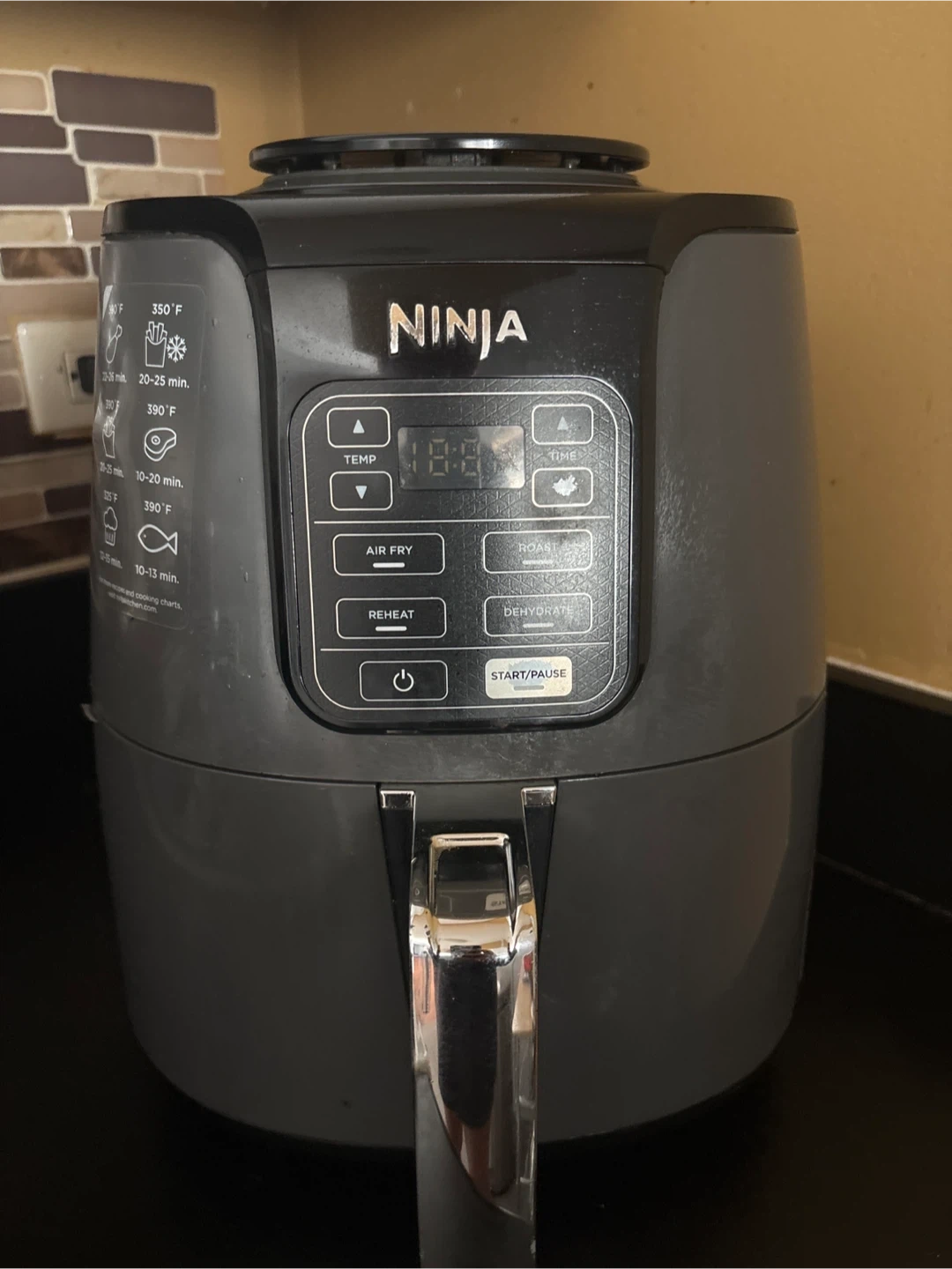 This Ninja air fryer has multiple cooking functions. It's black and includes a cooking chart with time and temperature suggestions. Perfect for quickly preparing family meals!