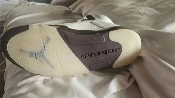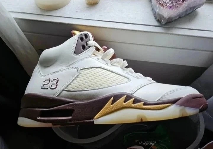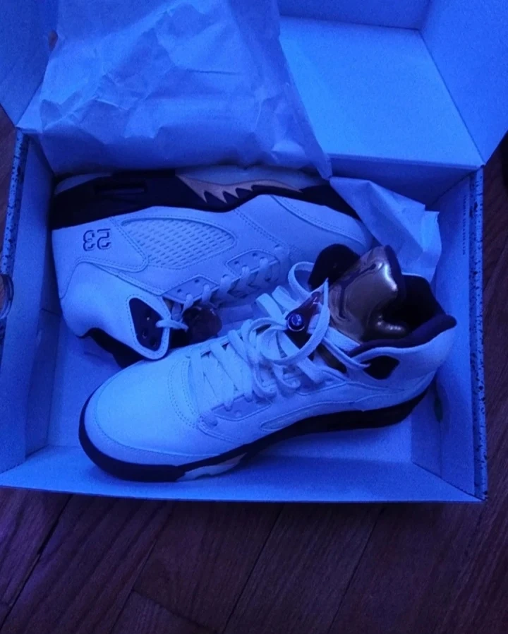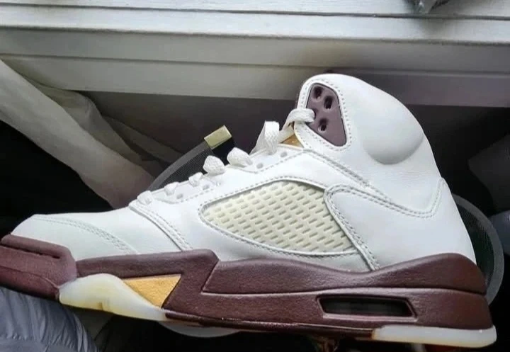 White leather Air Jordan 5 Retro sneakers with gold and brown accents. Features the iconic "23" on the side. Comes with original box. They're in a white and burgundy colorway and the iconic Jumpman logo is visible on the tongue. These are brand new. Never used or worn. Price is negotiable.