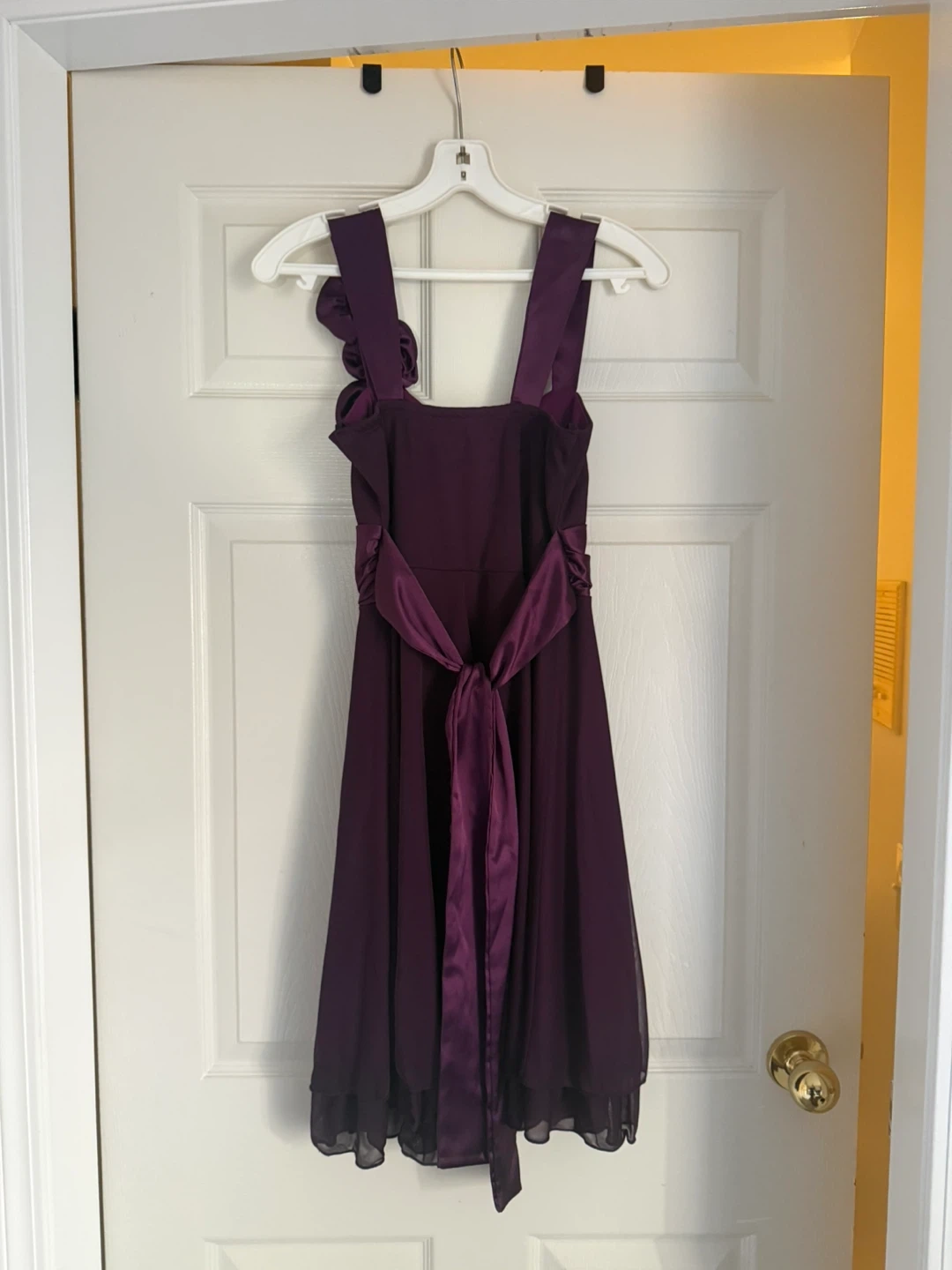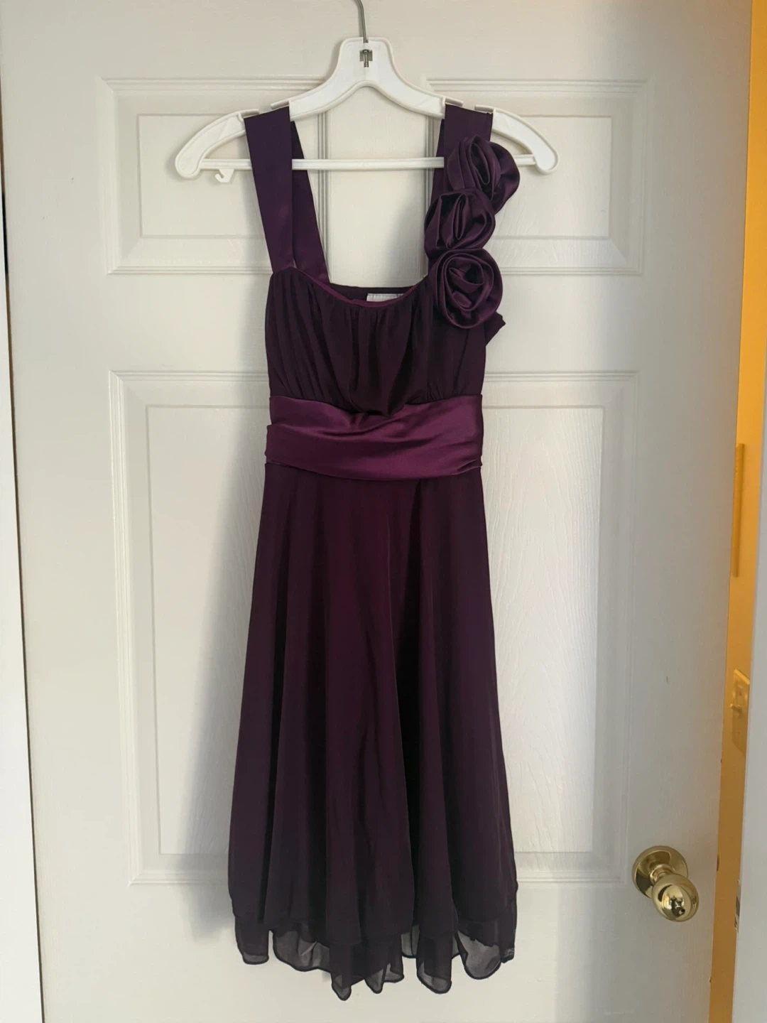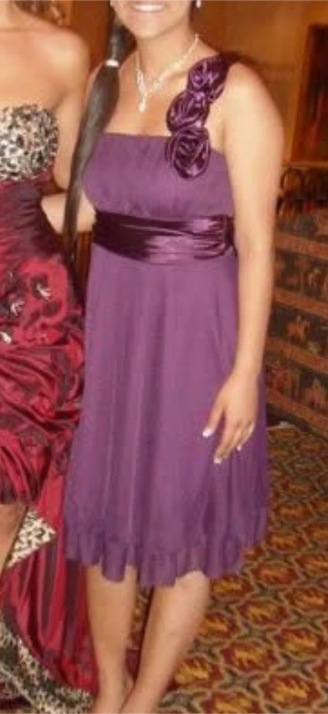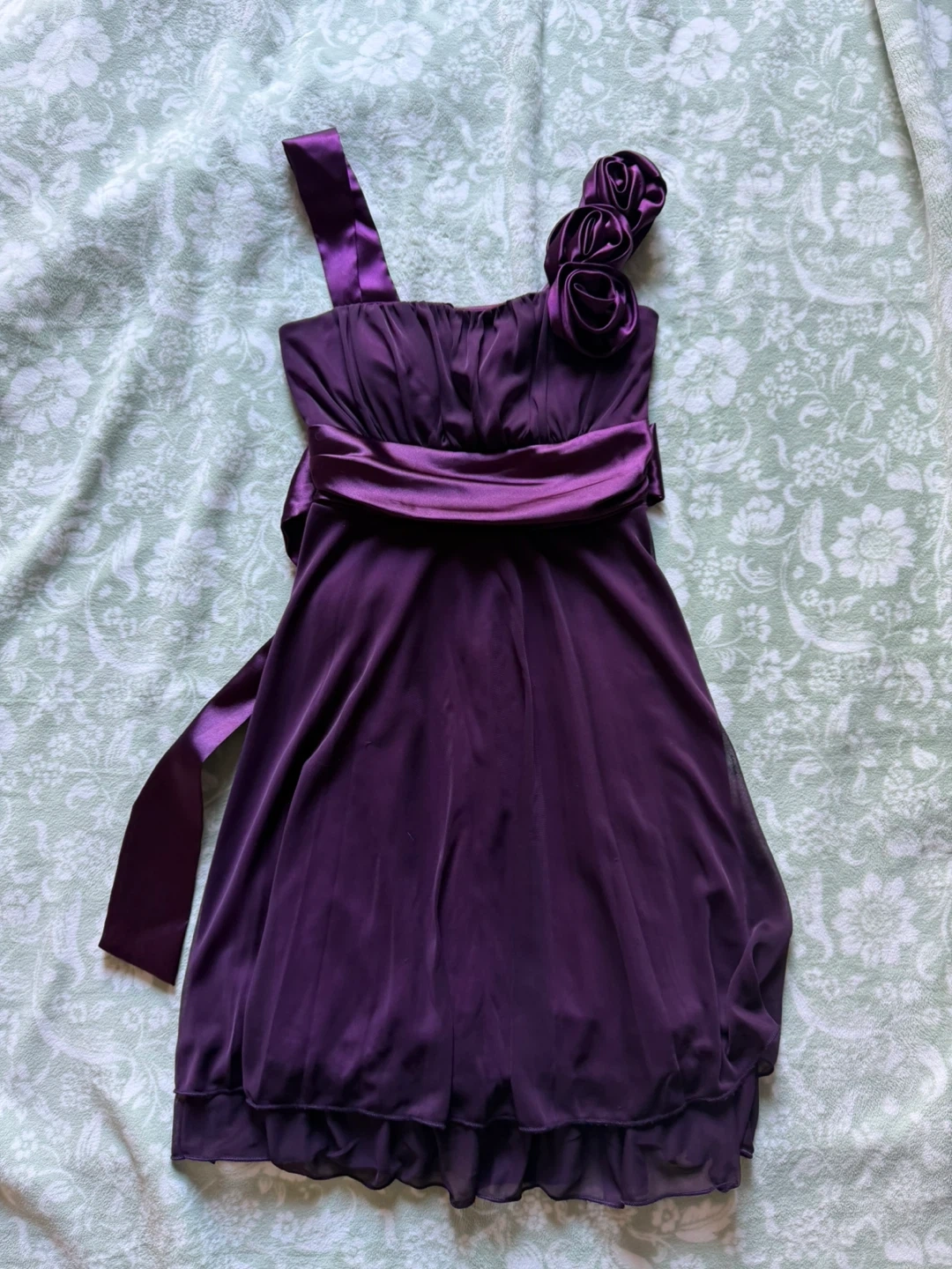 This is a purple party dress featuring a satin sash and floral embellishments on one shoulder strap. It's made with a chiffon overlay and has a ruffled hem. This dress would be great for special occasions or a night out!