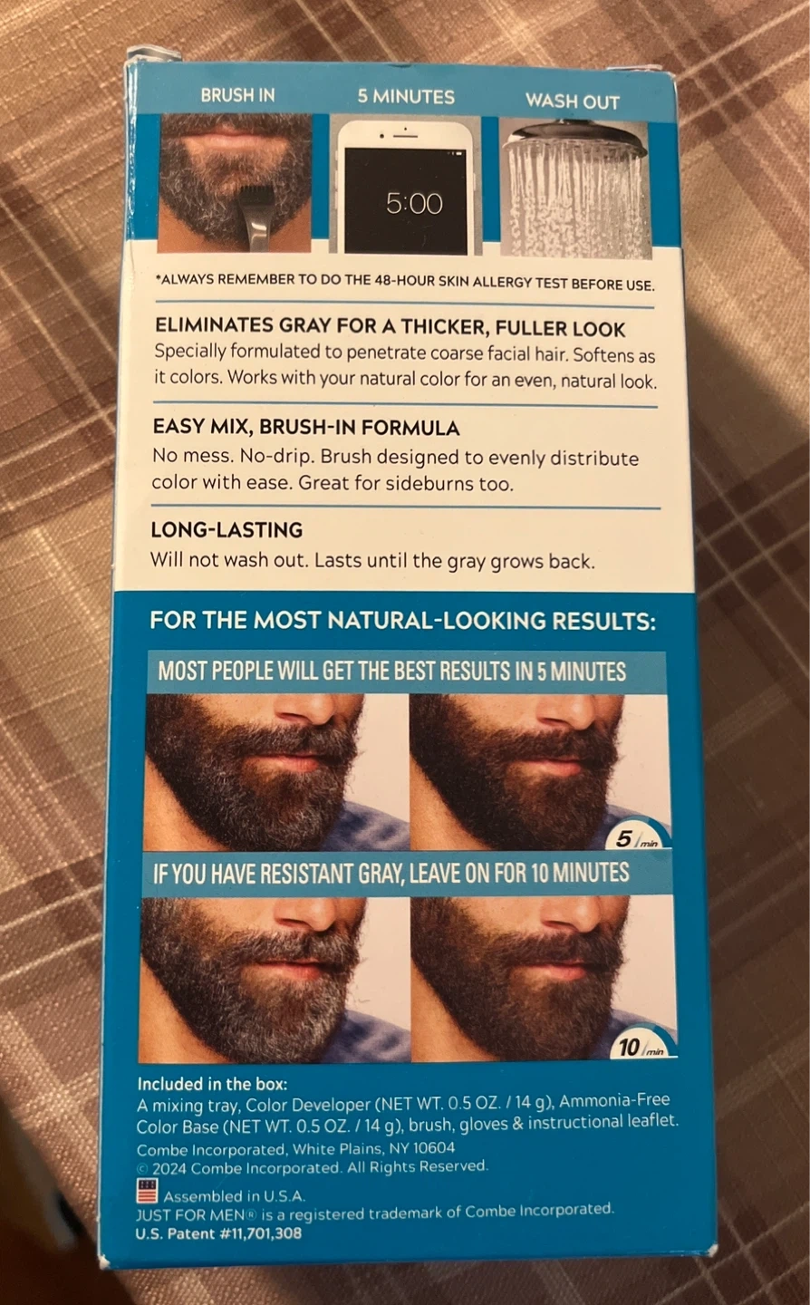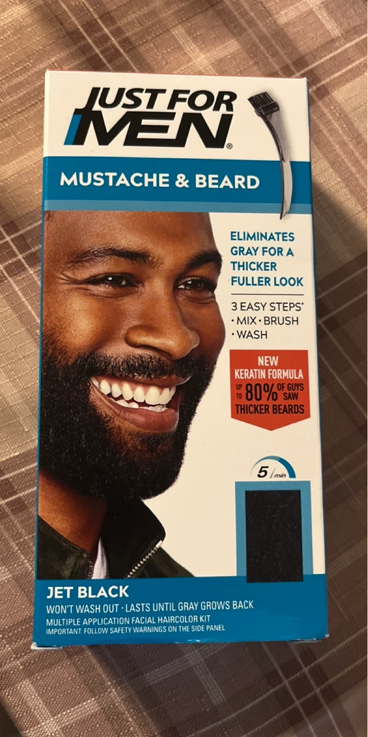 Just For Men Mustache & Beard haircolor kit in Jet Black. Eliminates gray for a fuller look with a no-mix, no-drip formula. Includes a mixing tray, color base, developer, brush, gloves, and instruction leaflet. Most results in 5 minutes!