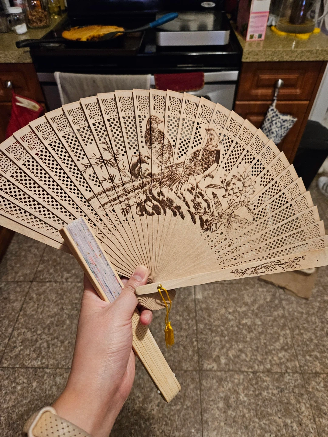 Selling a lovely wooden hand fan featuring a delicate bird design. It's perfect for adding a touch of elegance to any occasion or just keeping cool on a warm day