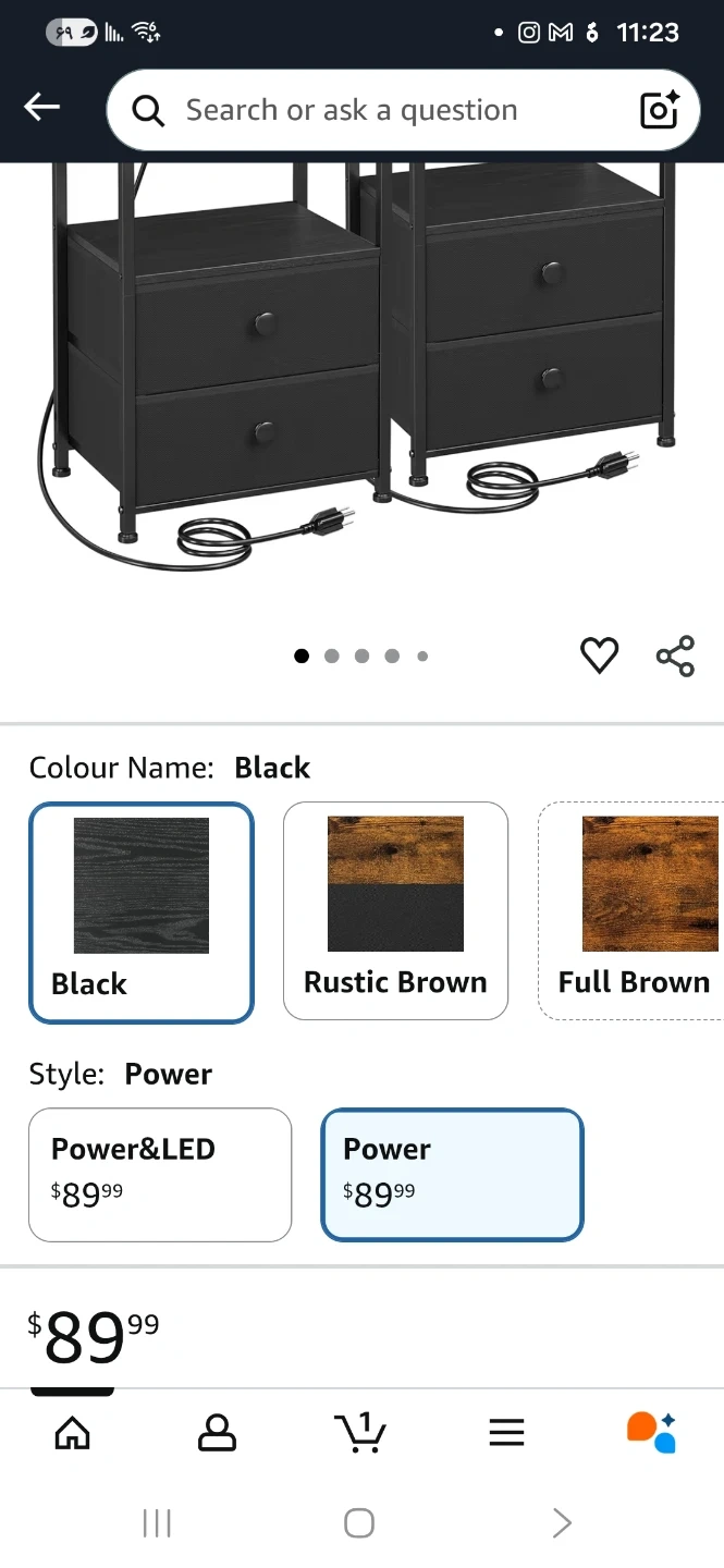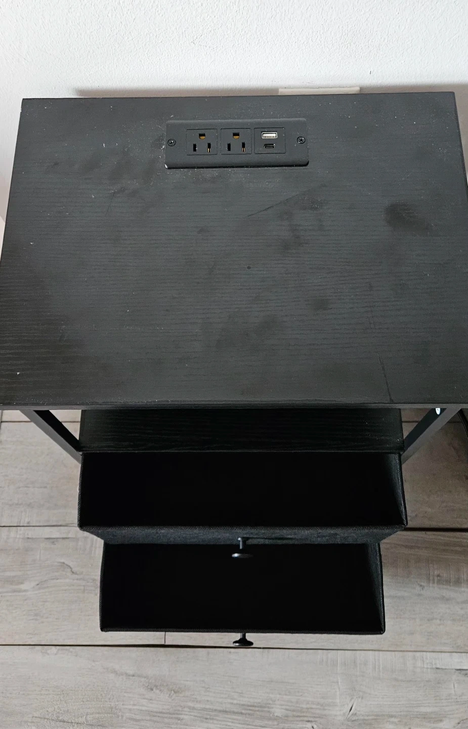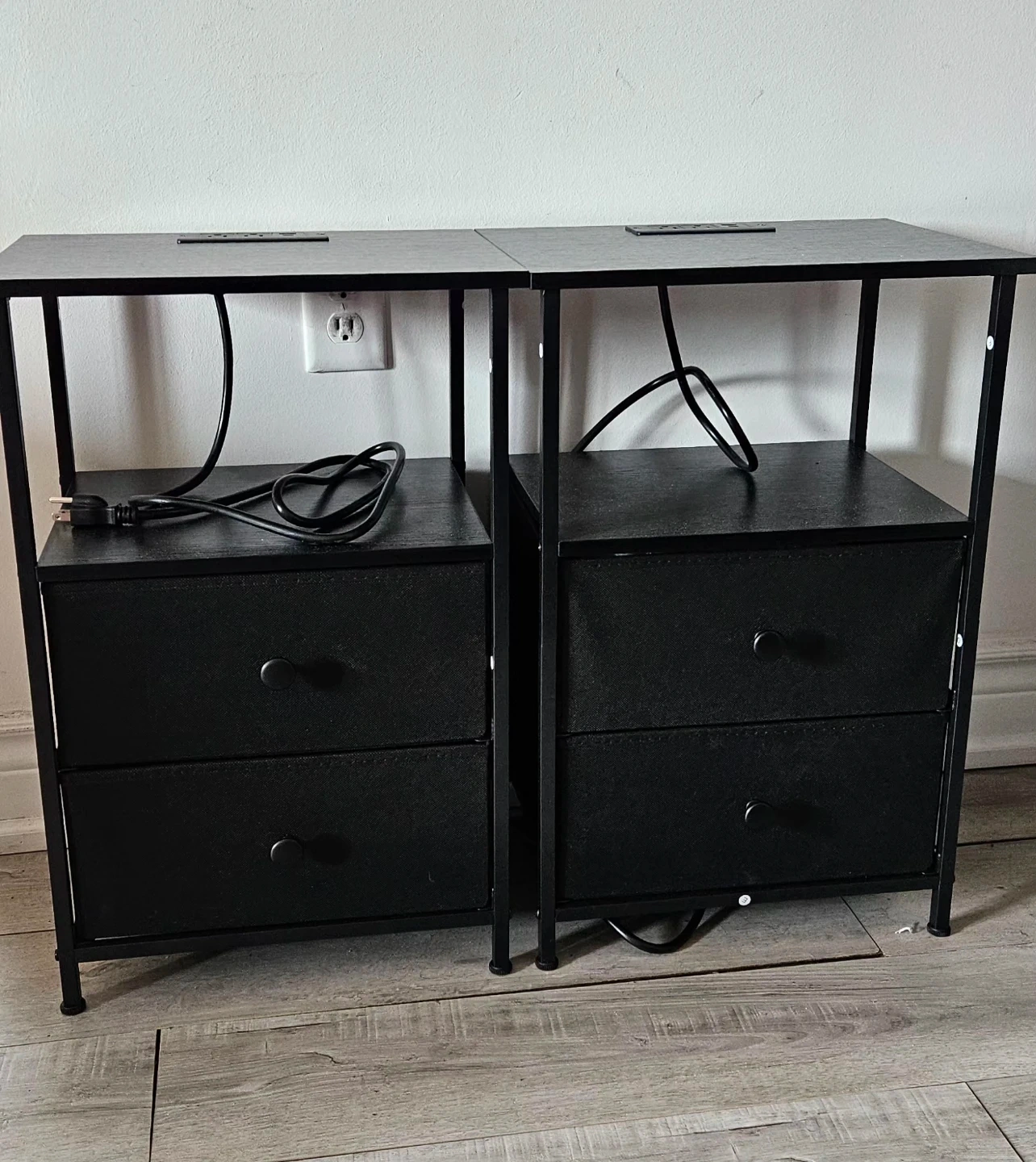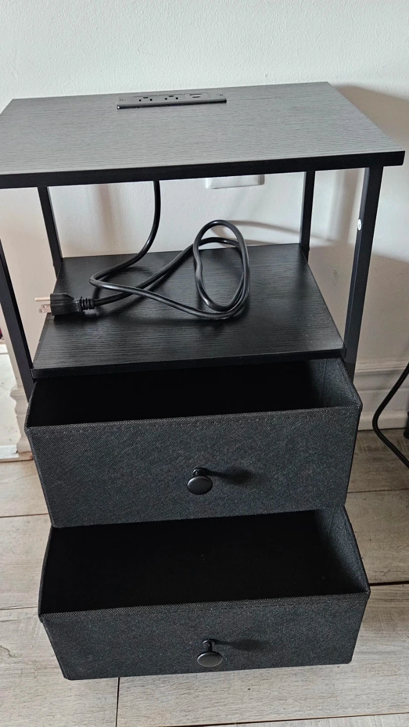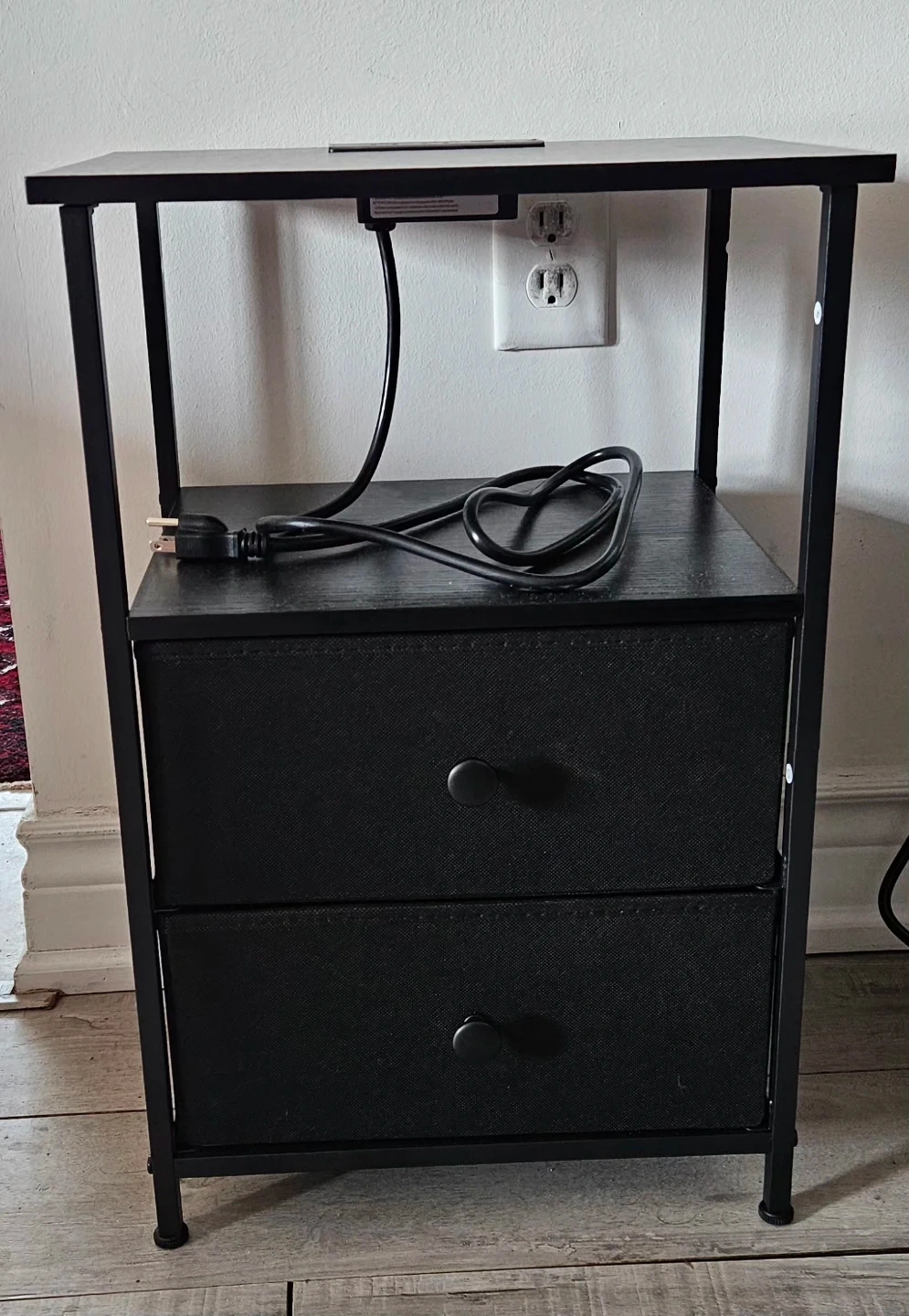 This black nightstand has two fabric drawers and a built-in power strip with two AC outlets and two USB ports. It's great for charging devices right beside your bed. Metal frame construction. Plugs into a standard wall outlet.