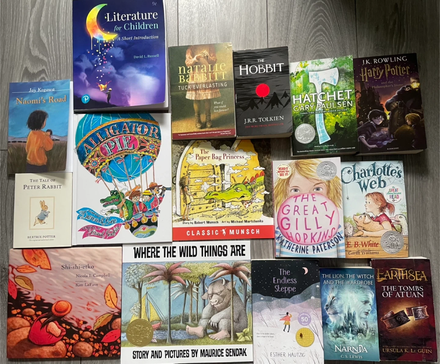 Collection of popular children's books including J.K. Rowling's Harry Potter, J.R.R. Tolkien's The Hobbit, and E.B. White's Charlotte's Web. Also features titles like Tuck Everlasting, Hatchet, The Tale of Peter Rabbit, and Where the Wild Things Are. Perfect for young readers exploring classic literature and fantasy adventures.