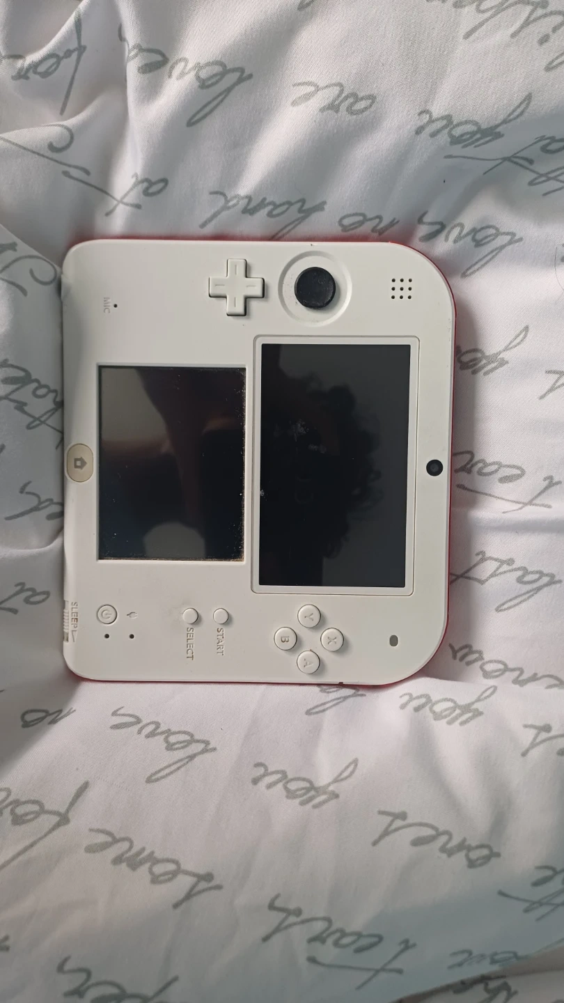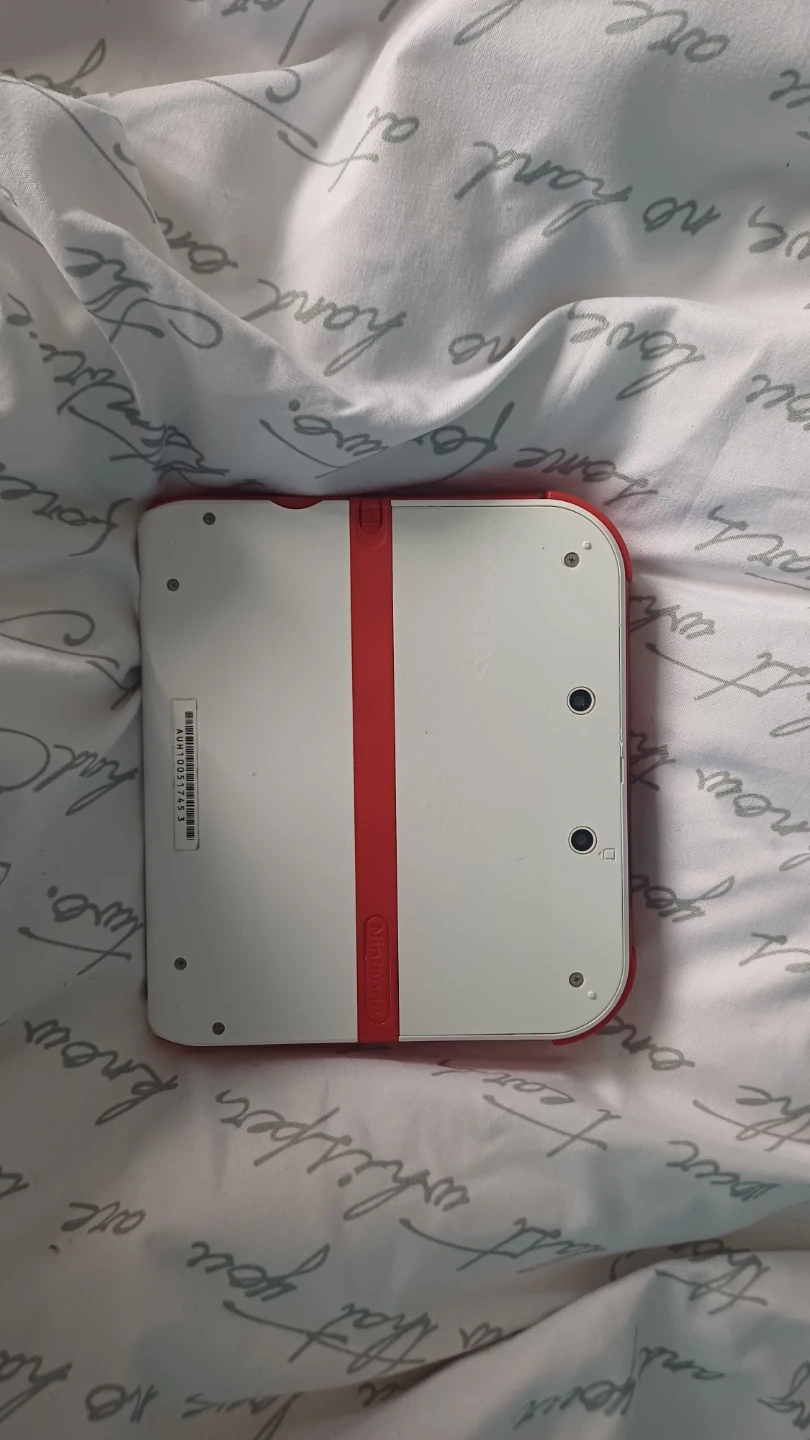 White and red Nintendo 2DS handheld gaming console. It's great for gaming on the go and accessing Nintendo's library of games. This device is perfect for younger gamers or anyone looking for a portable gaming experience.