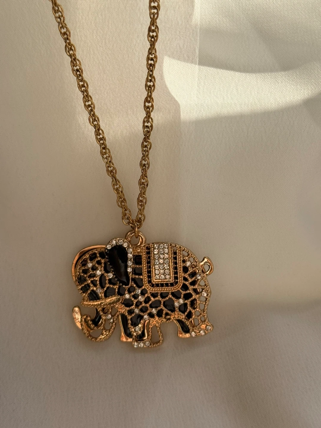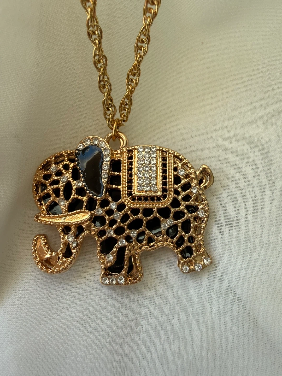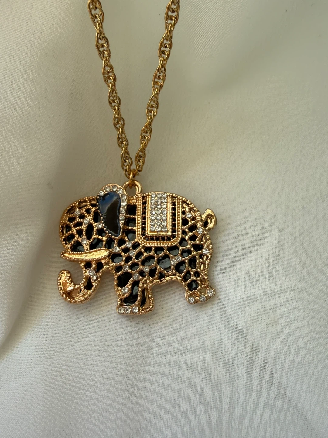 This necklace features a gold-tone chain with a decorative elephant pendant. The elephant is adorned with black enamel and clear rhinestones. It's a fun statement piece!