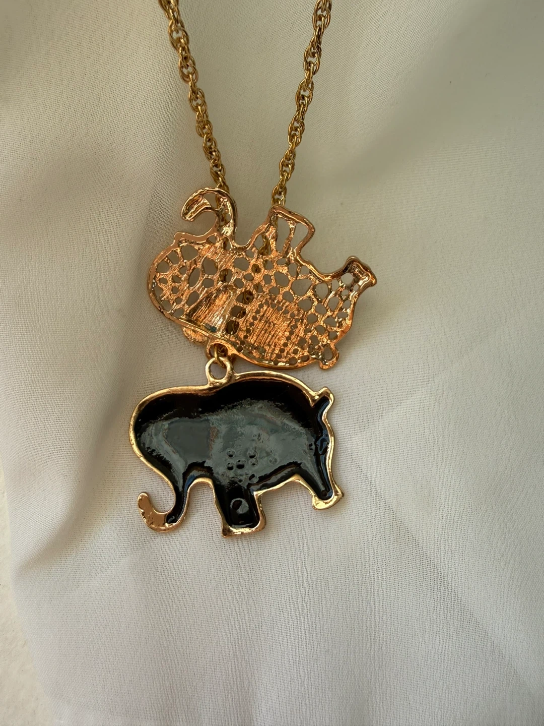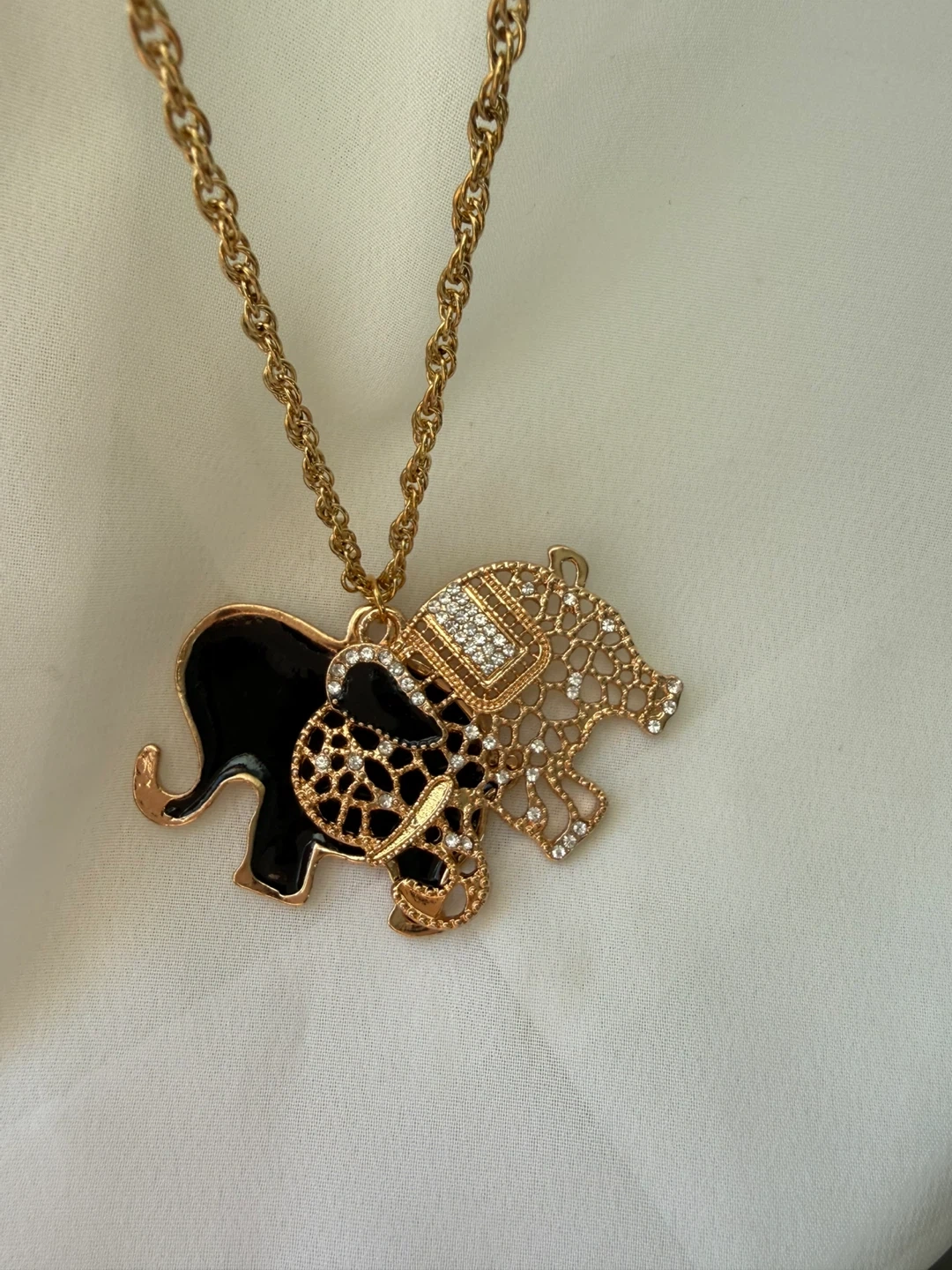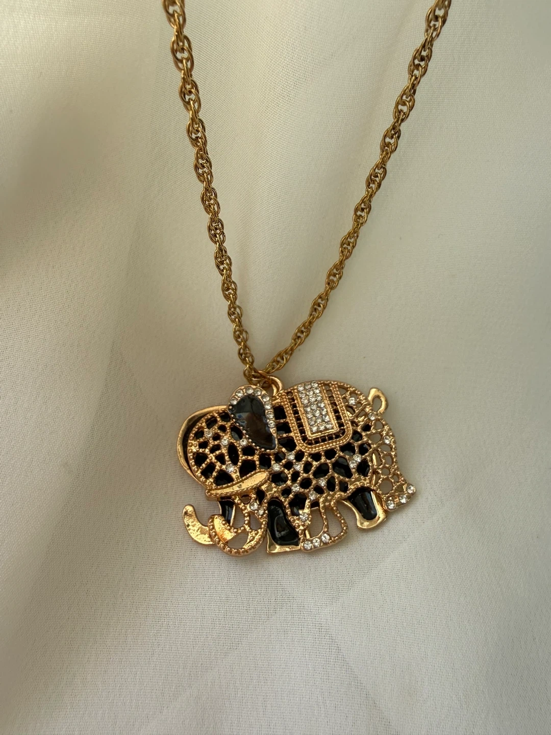 This necklace features a gold-tone chain with a decorative elephant pendant. The elephant is adorned with black enamel and clear rhinestones. It's a fun statement piece!