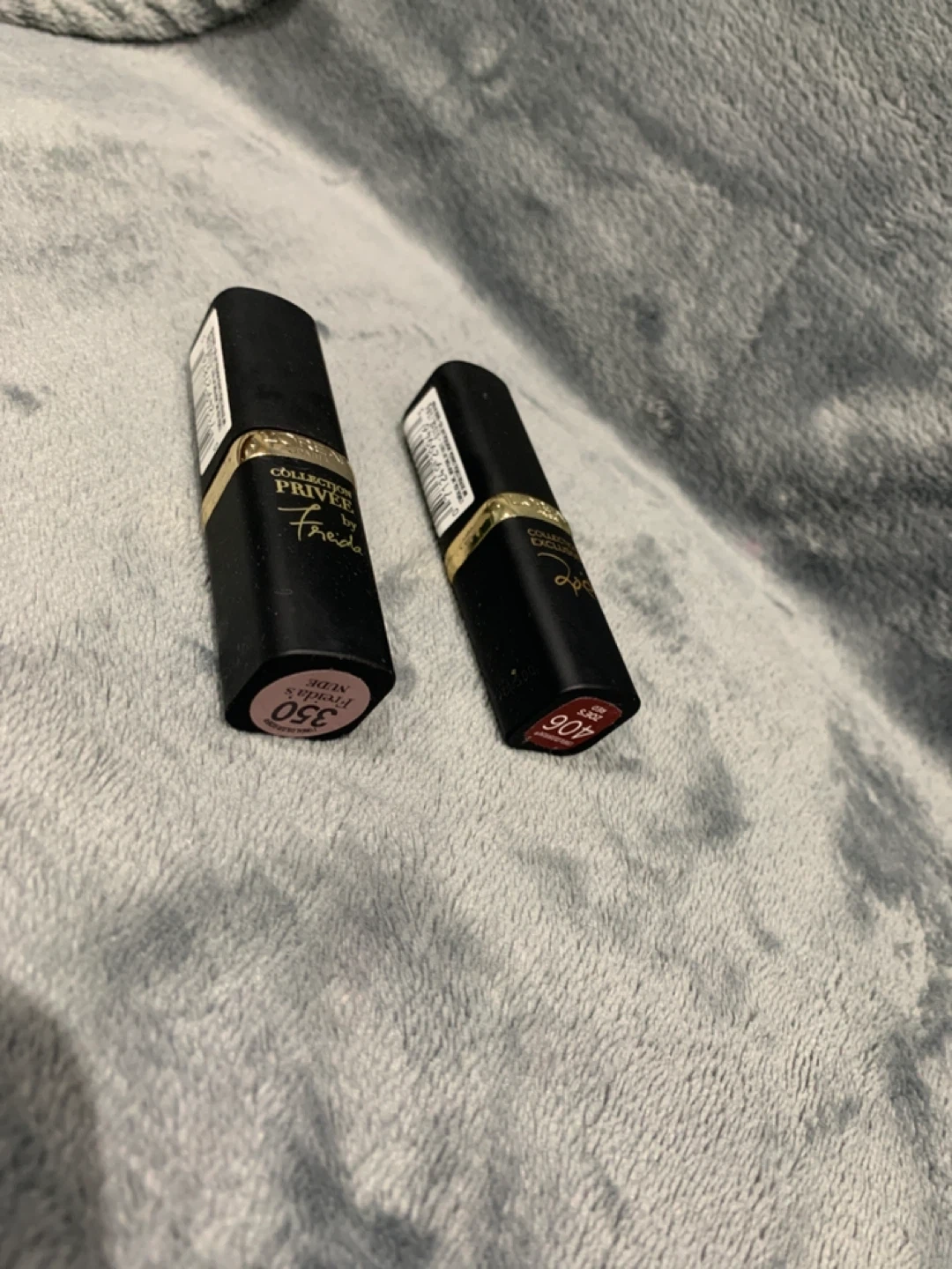 Two L'Oréal Paris lipsticks from the Collection Privée. One is shade 350 'French Touch' and the other is shade 406 'Doutzen'. Both are matte finish lipsticks.