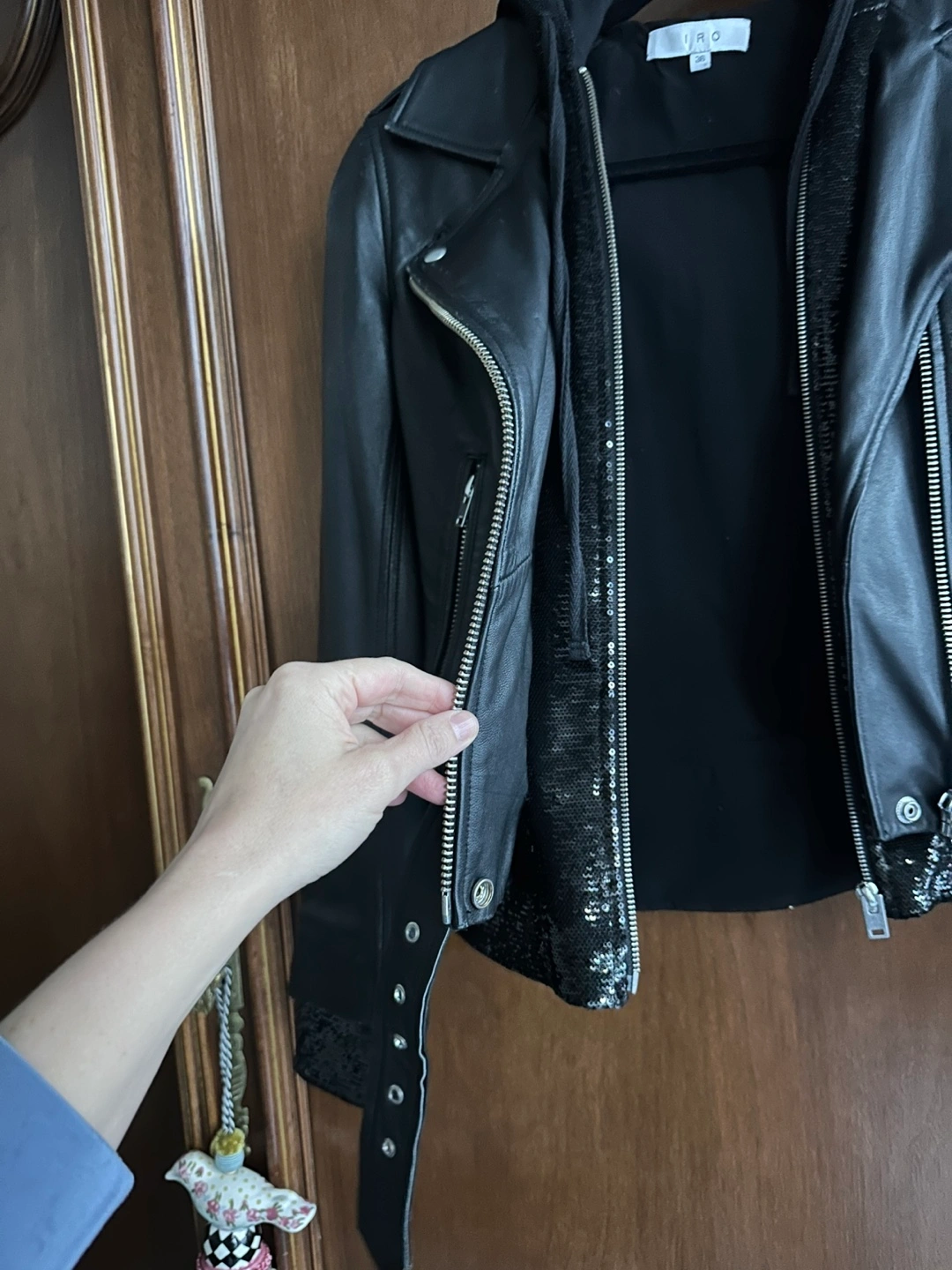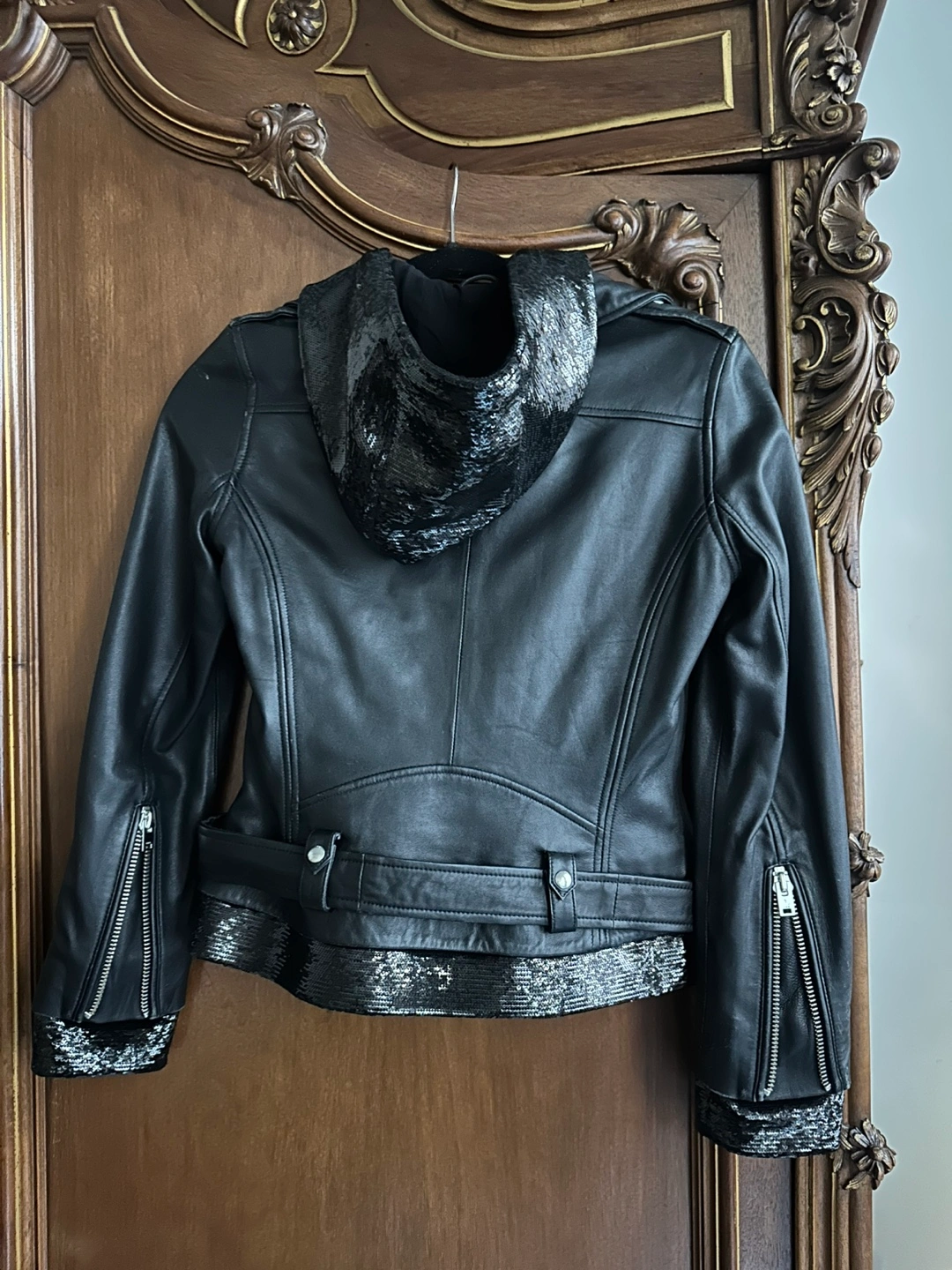 Soft lamb leather with sequin details along the arm cuffs, waist band along the zipper closure and a fully sequin hood. Can we worn open, zipped up to expose sequins or double zipper.