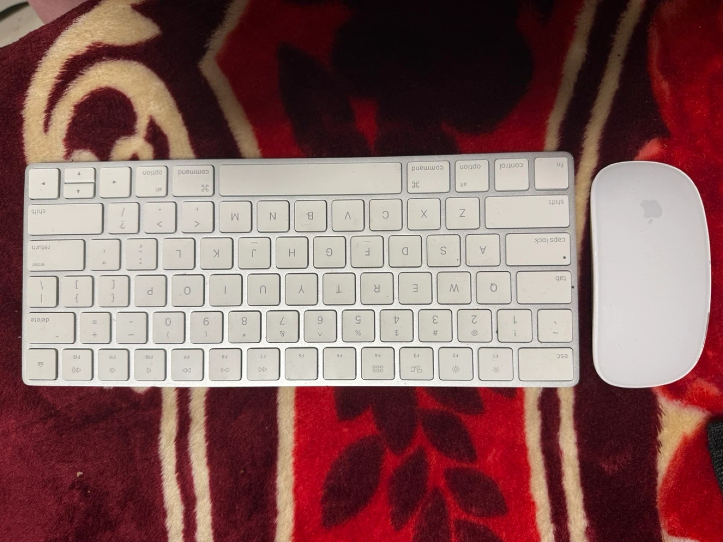 Wireless keyboard and mouse set. Includes Magic Keyboard and Magic Mouse. Both are white and feature the Apple logo.