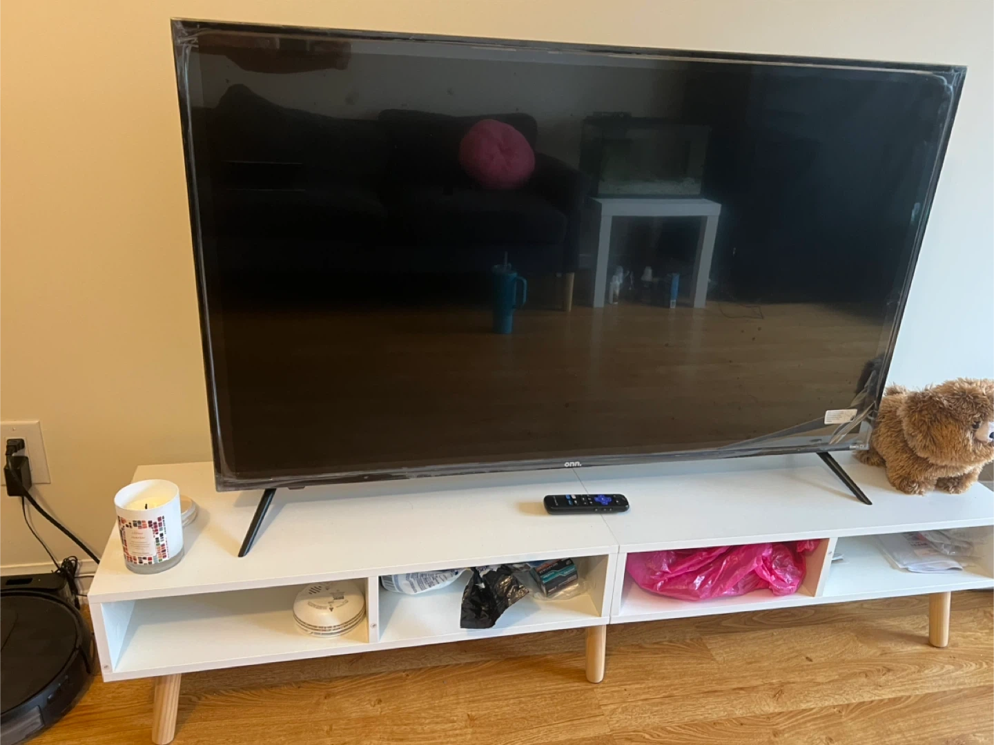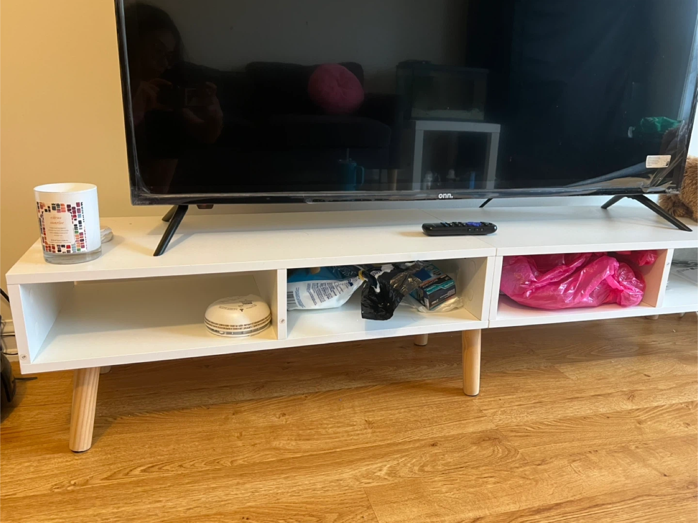 Selling a white TV stand! It has a clean look with wooden legs. There are open shelves for storage or decor. It's in great shape and ready for a new home