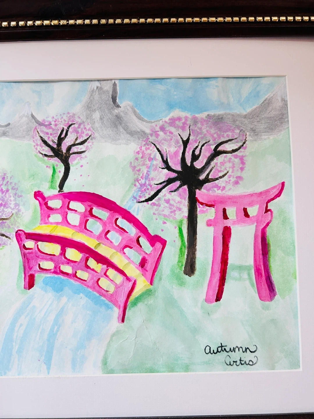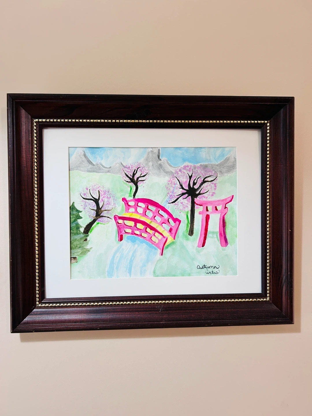 This is a charming framed watercolour painting depicting a serene Japanese garden scene with cherry blossoms, a torii gate, and a bridge over a waterfall. The artwork is signed 'Autumn Curtis'. It's framed in dark wood with a gold beaded inner trim and a white matting. Adds a touch of tranquility to any space!