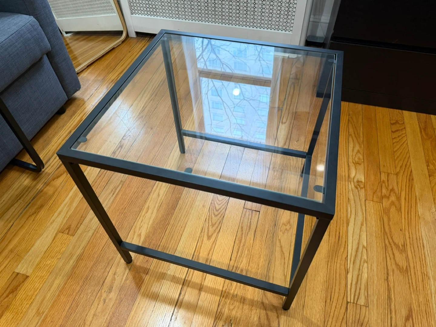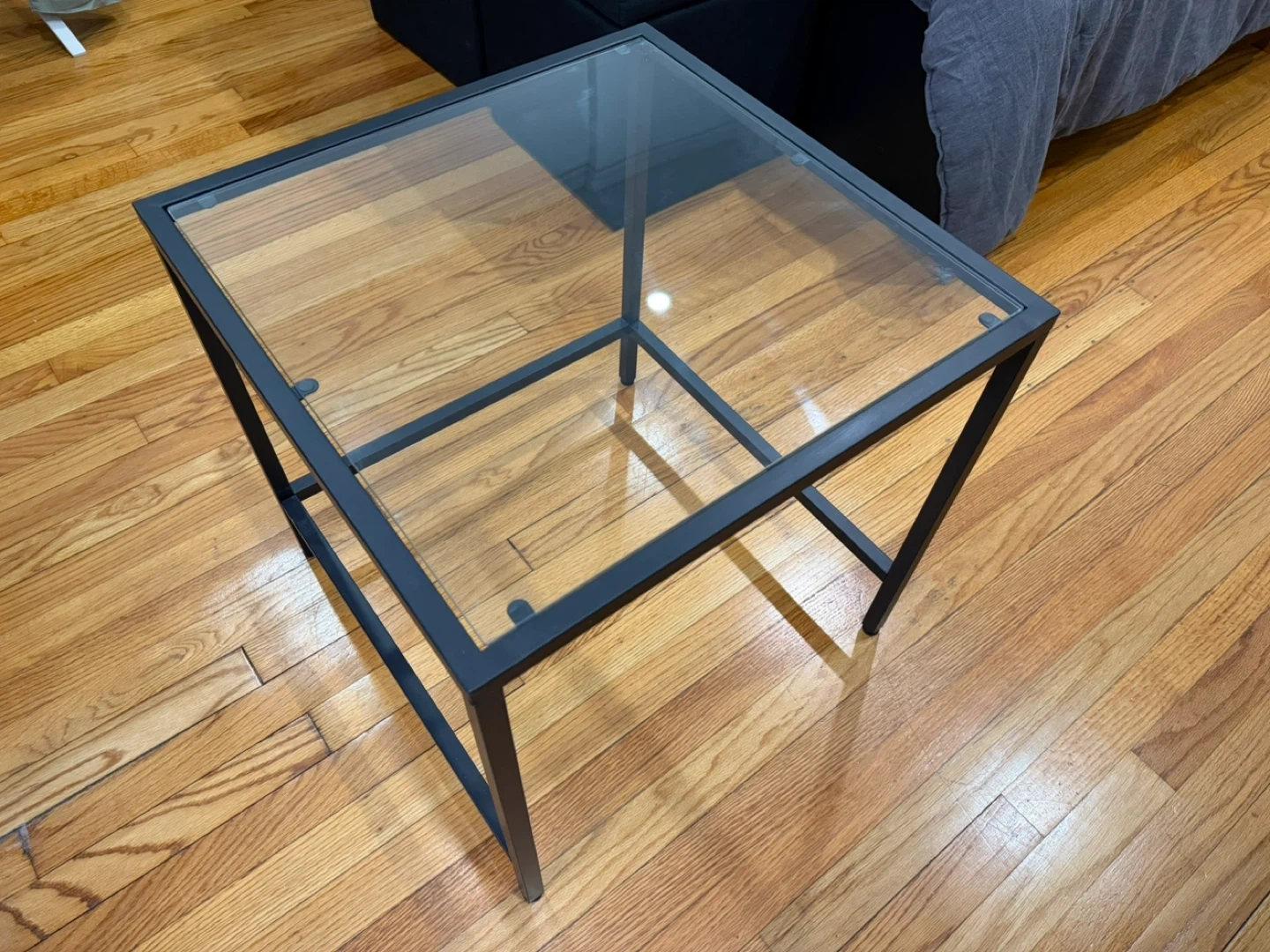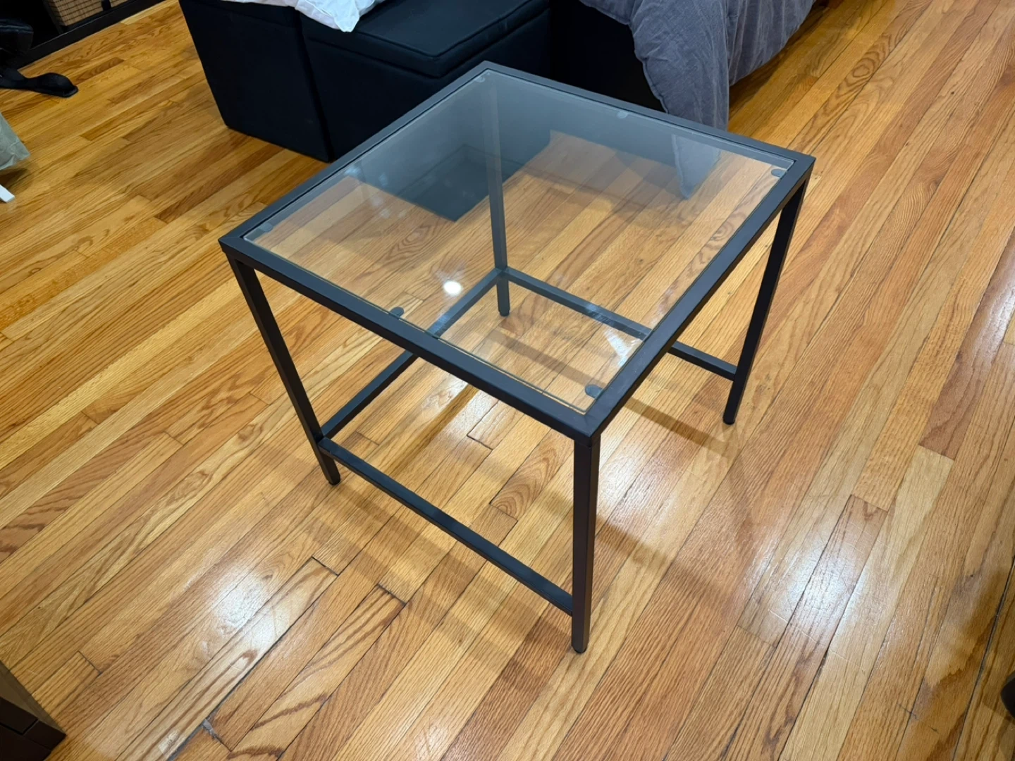 Simple square end table with a clear glass top and a black metal frame. It's approximately 19 inches tall and 19 inches wide. This table's design is minimalist and functional, fitting well in various spaces.