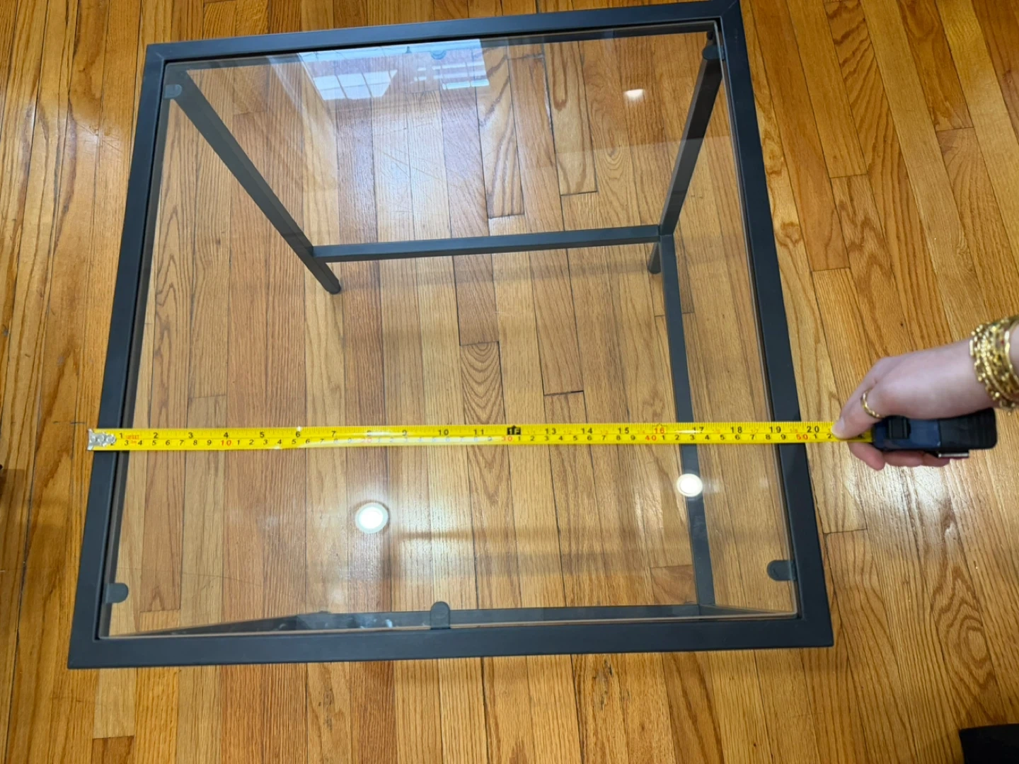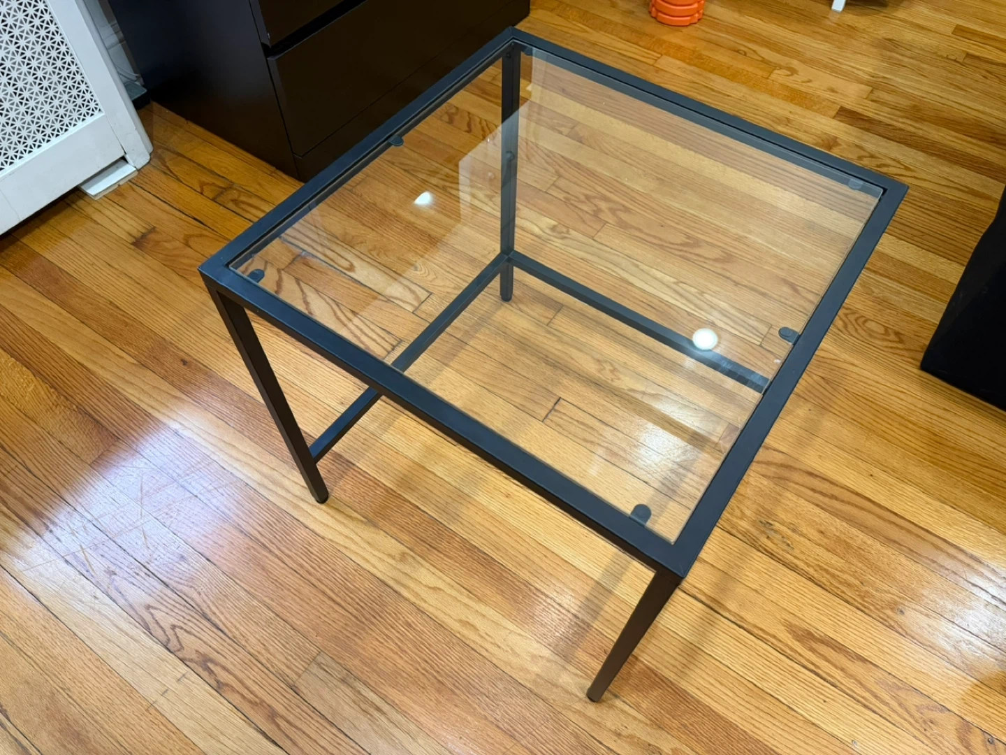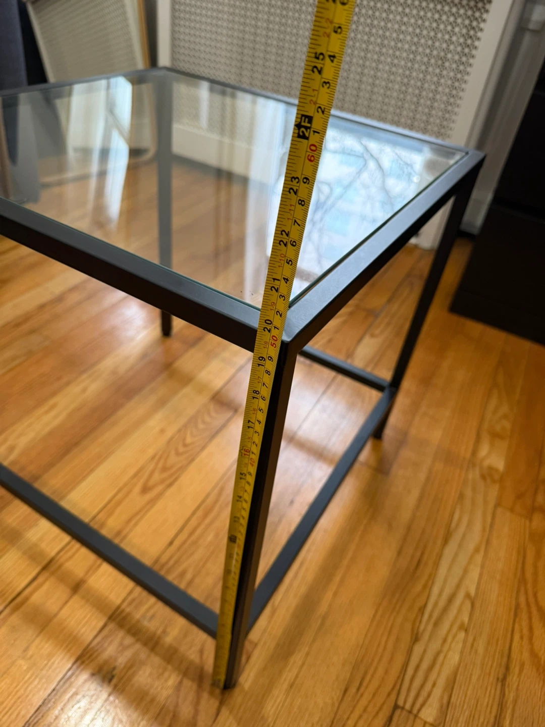 Simple square end table with a clear glass top and a black metal frame. It's approximately 19 inches tall and 19 inches wide. This table's design is minimalist and functional, fitting well in various spaces.