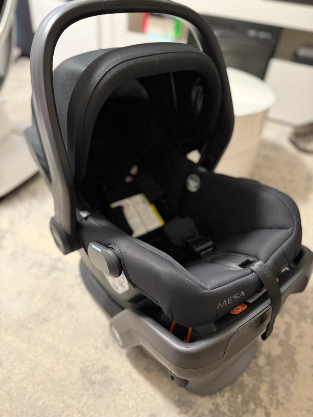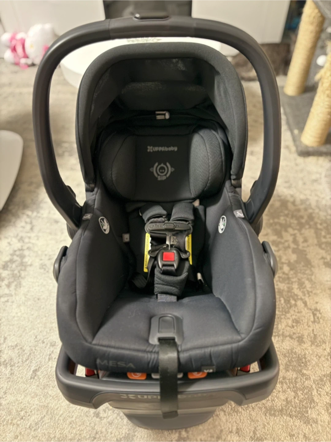 A cozy Uppababy infant car seat. Features a five-point harness. The seat is black in color. Perfect for bringing your little one home safely. Weighing at only approximately 9 lbs and a comfortable size for your newborn that is not too tight compared to many car seats that are too uncomfortable for your little one. Base is included as well. Sold as is. Exp: 08/2031