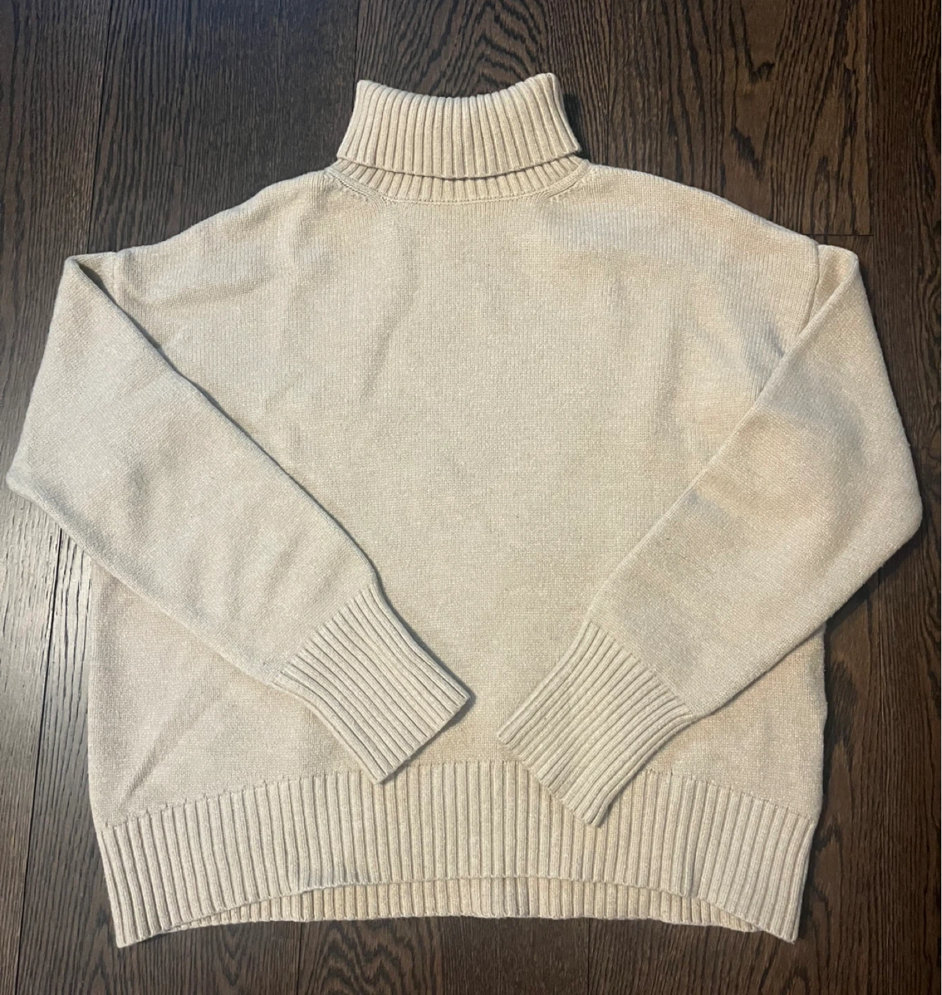 Cozy up in this beige turtleneck sweater! It's a classic piece that's perfect for layering during the colder months. The neutral colour makes it easy to pair with any outfit. It's in great condition and ready for a new home