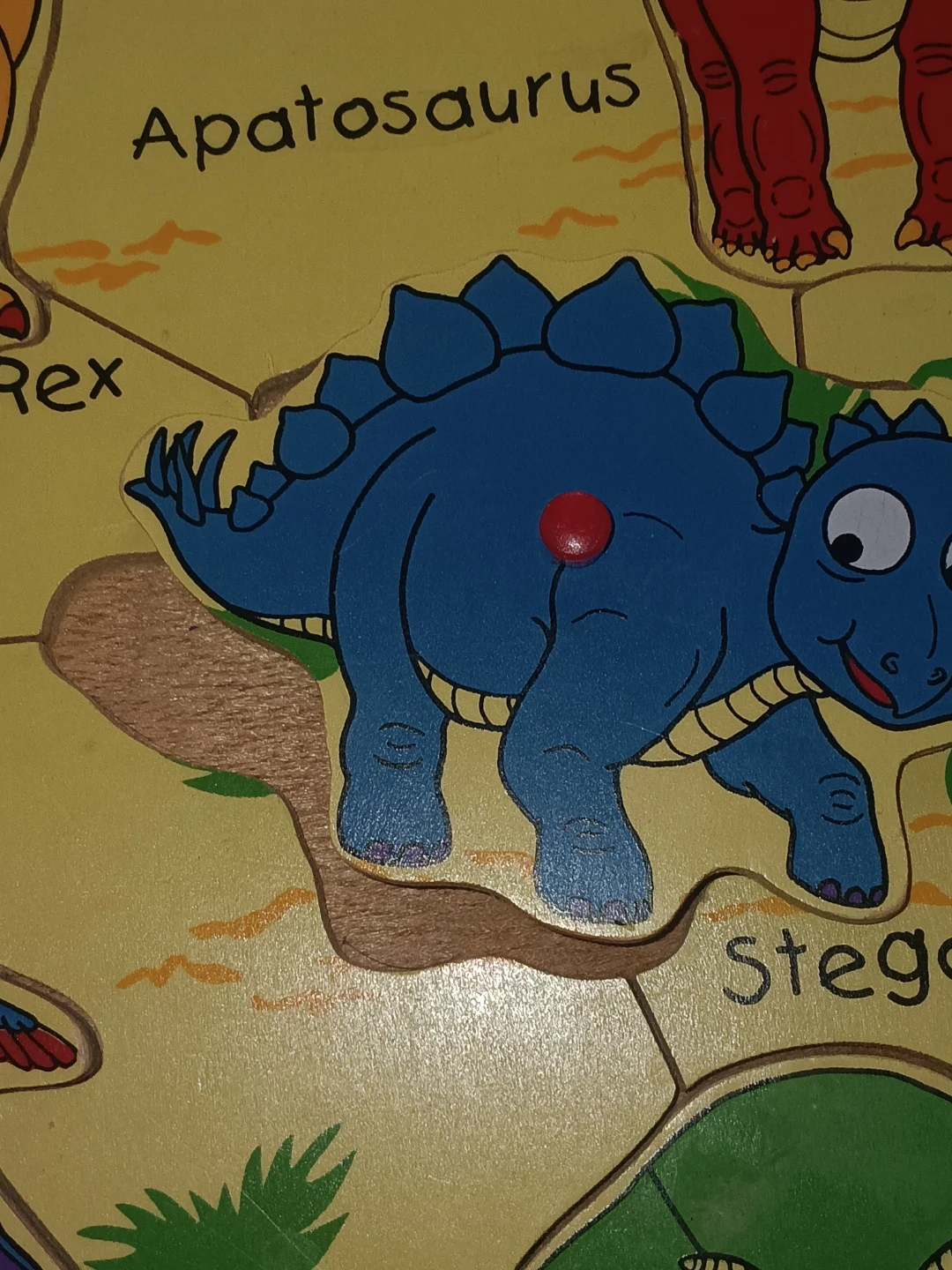This wooden puzzle features five different dinosaurs: Tyrannosaurus Rex, Apatosaurus, Stegosaurus, Parasaurolophus, and Triceratops. Each piece is shaped like a dinosaur and fits into its corresponding outline on the board. It's a fun way to learn dinosaur names!