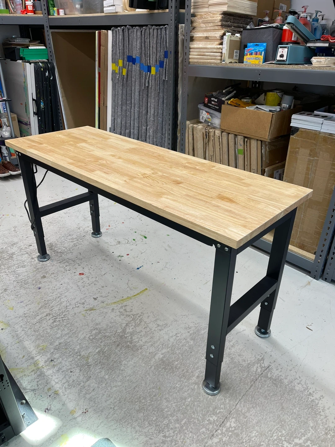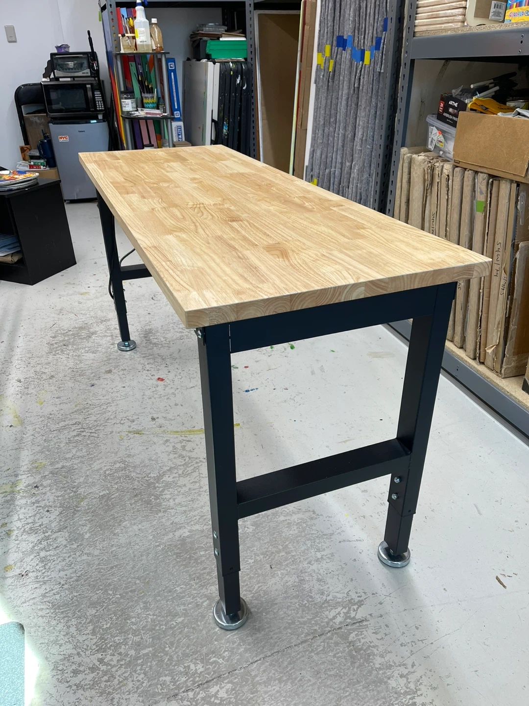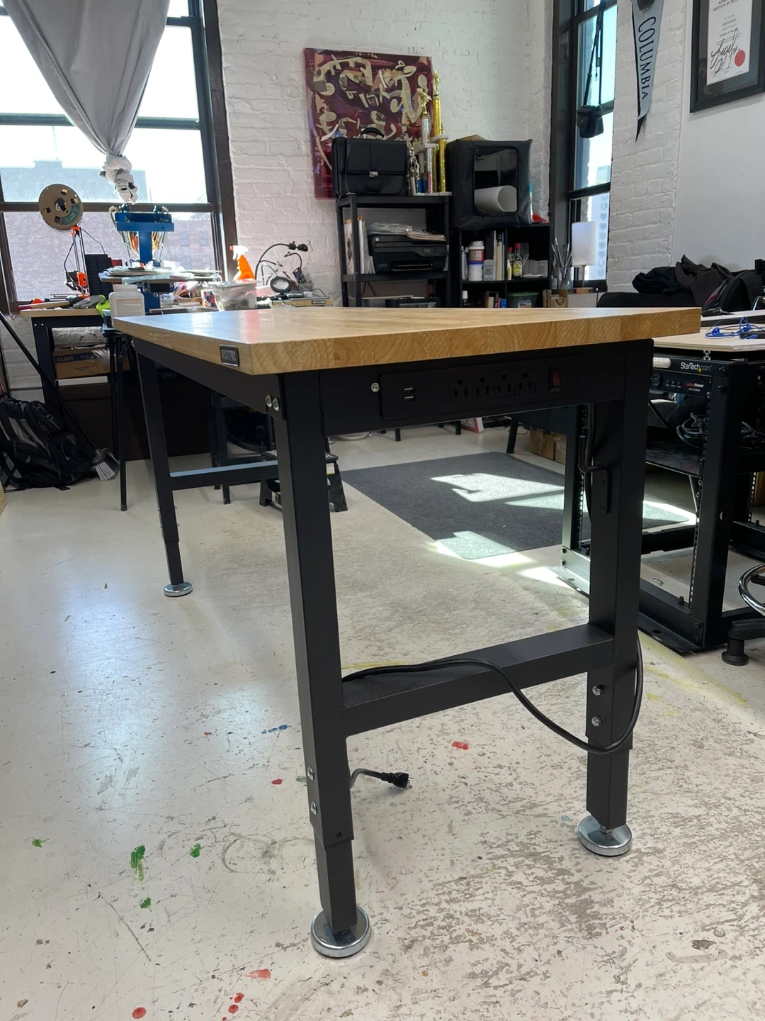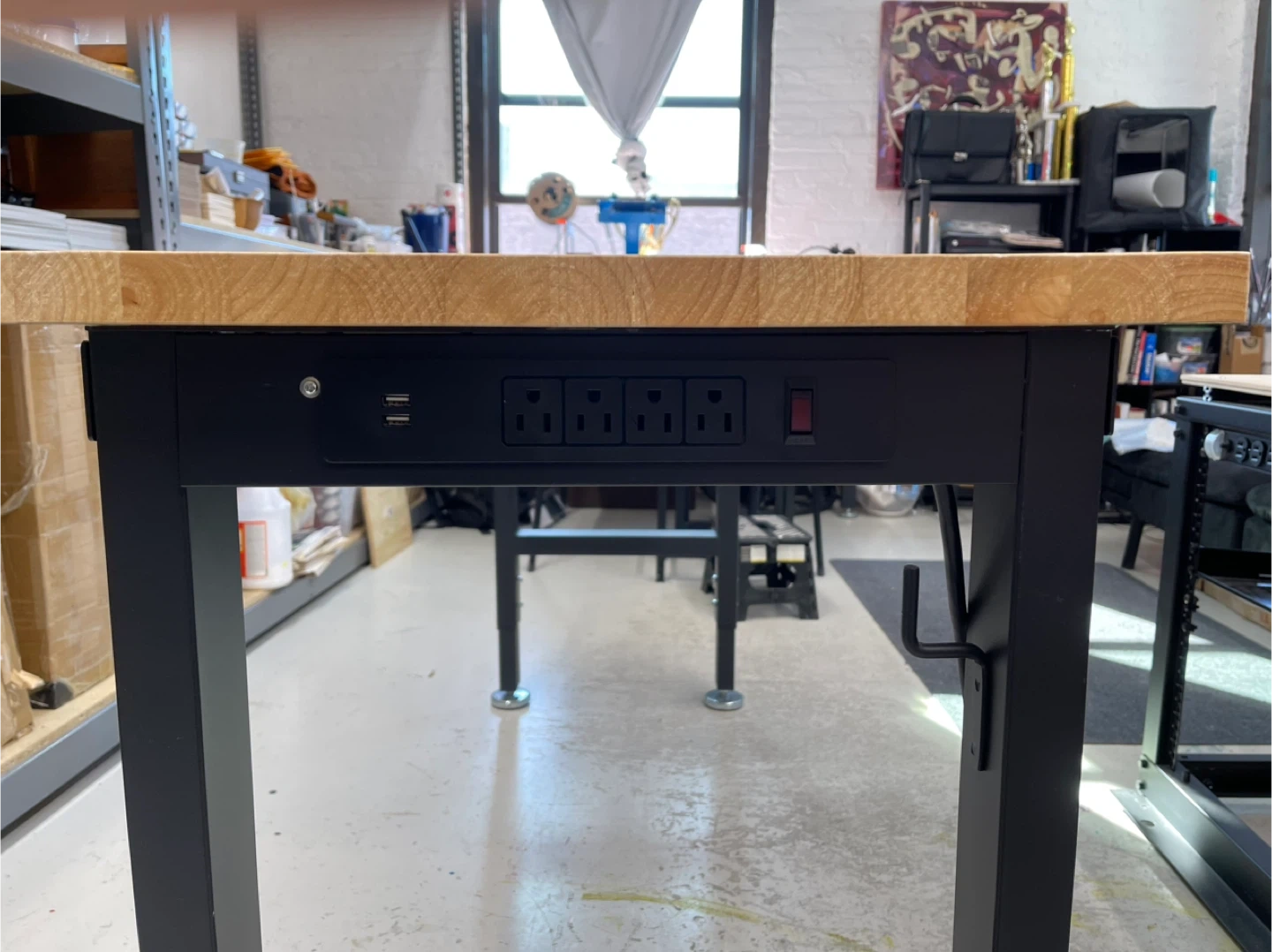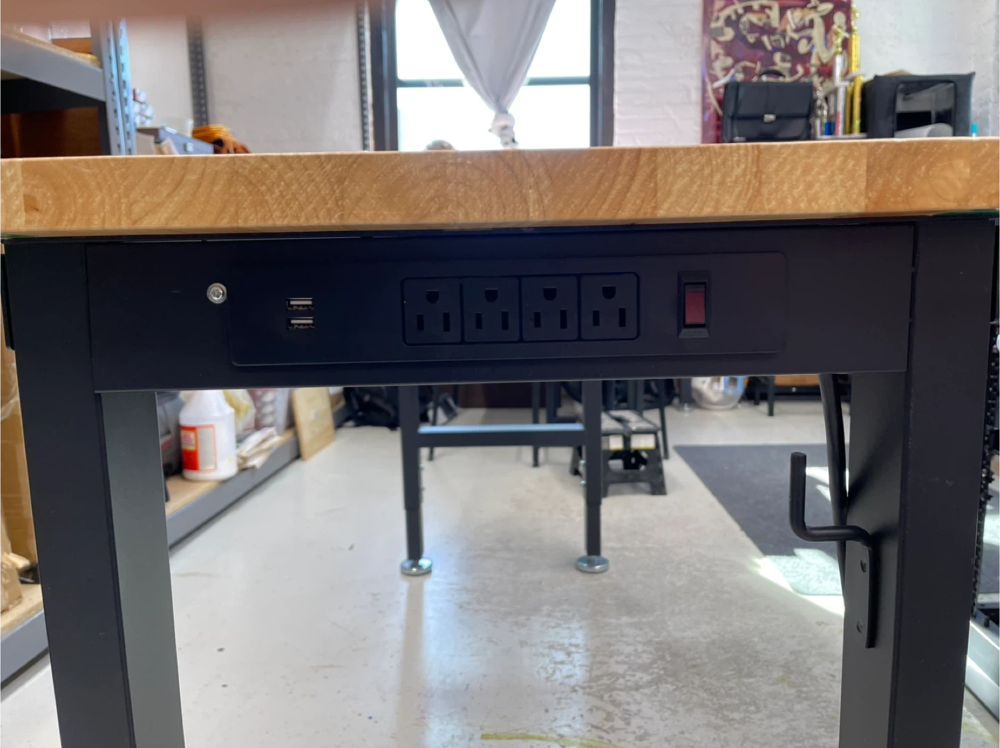 This workbench features a durable butcher block top and a sturdy black metal frame. It includes a convenient built-in power strip with four outlets and two USB ports. The adjustable legs ensure stability on any surface. It's great for workshops or garages!