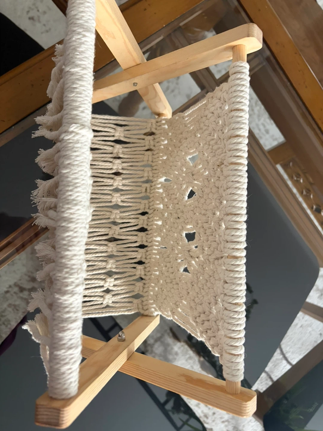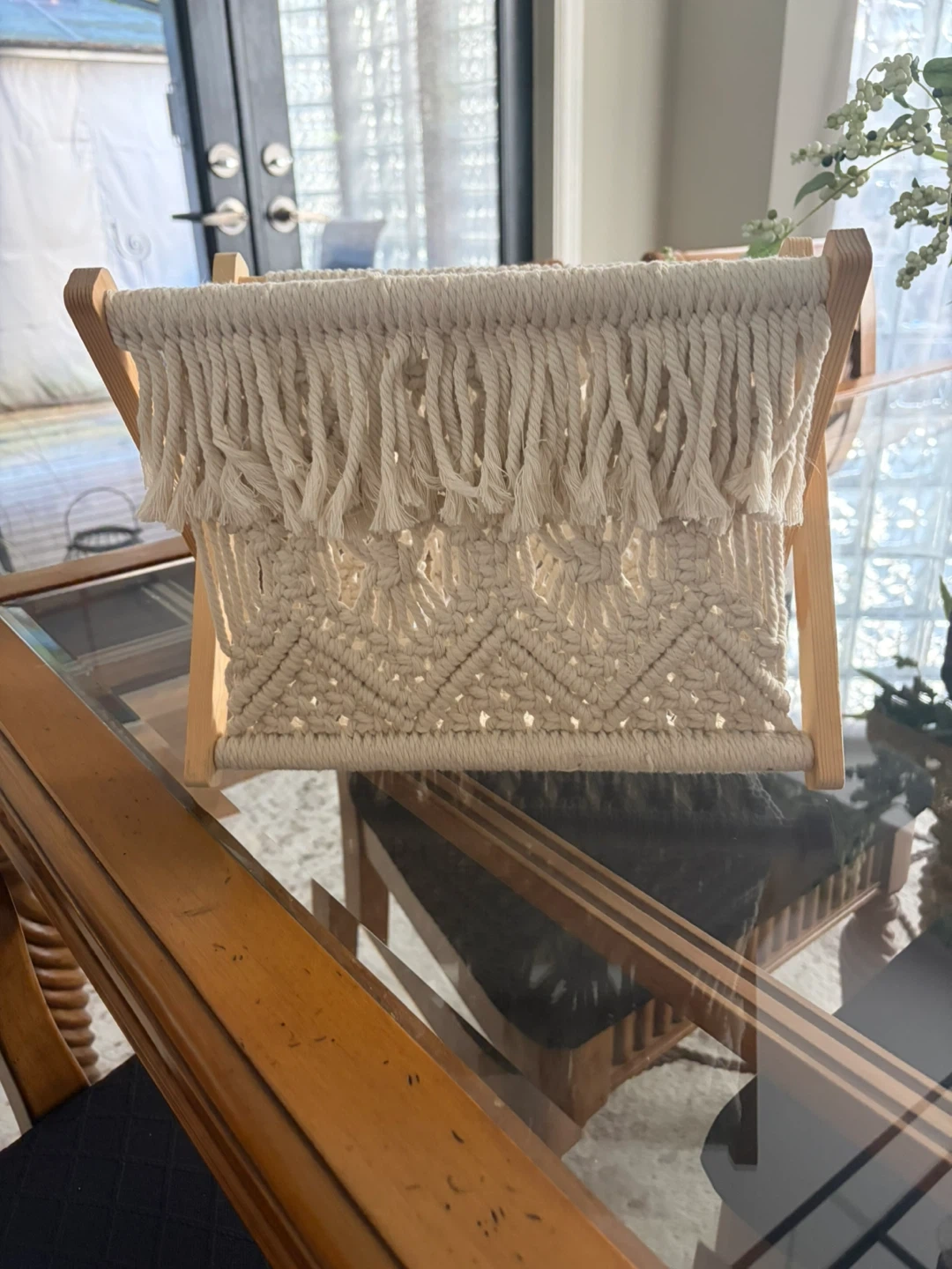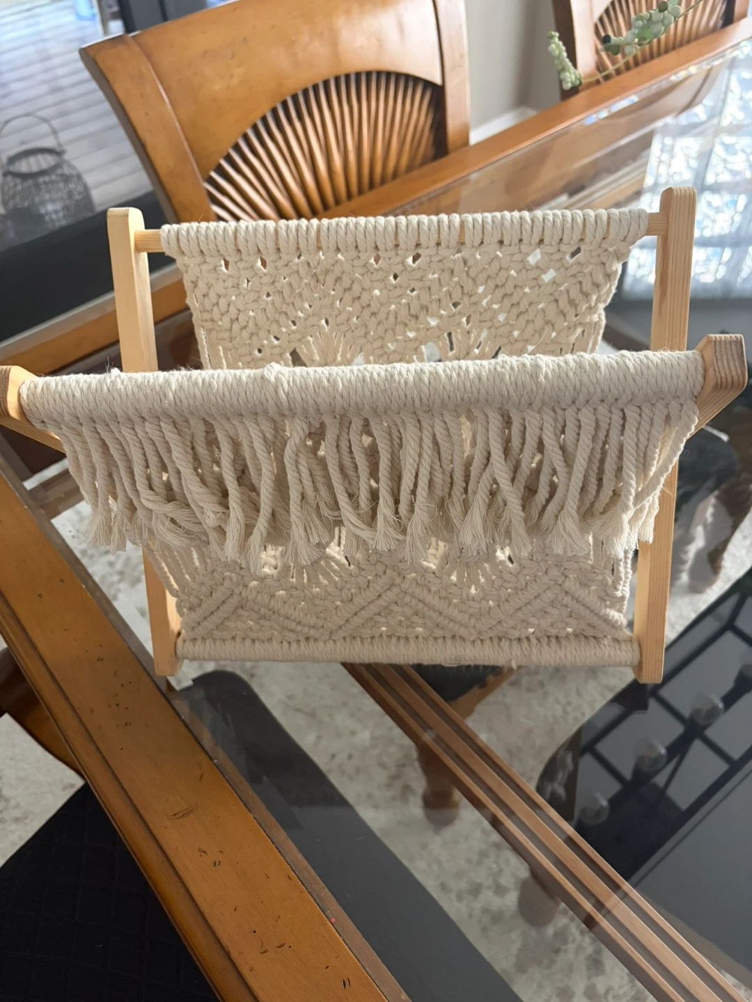 This is a macrame magazine holder with a wooden frame. It features two tiers of woven macrame, one with fringe details. Perfect for organizing magazines or lightweight decor. It's a stylish addition to any living space!