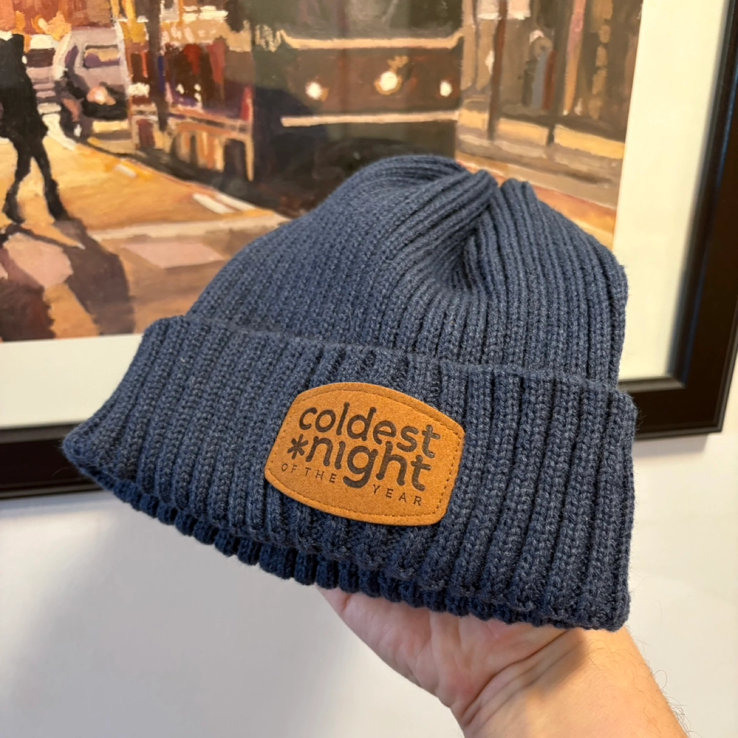 Navy blue ribbed knit toque. Features a brown leather patch with the Coldest Night of the Year logo. Cozy and warm. Worn once on the night of the walk.