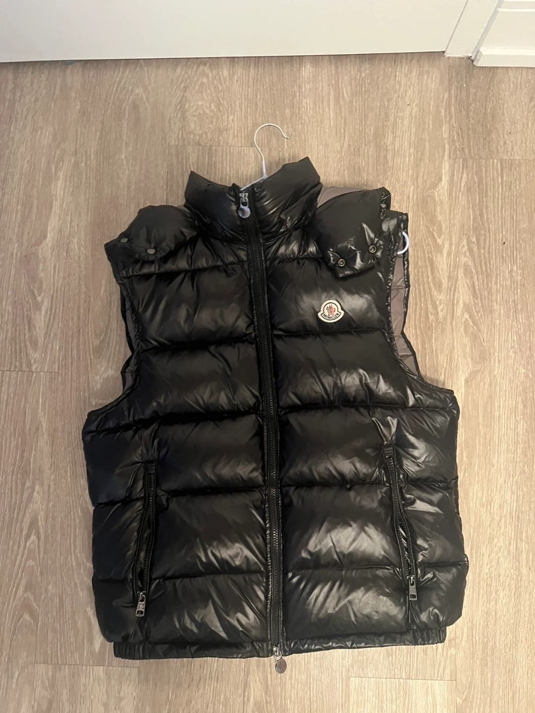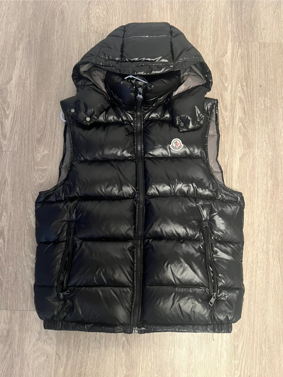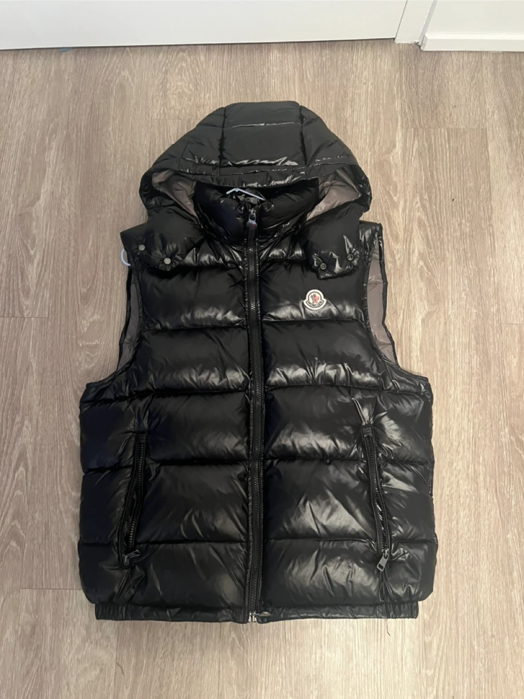 Moncler hooded puffer vest in black. It's a stylish and warm outerwear piece. This vest is shiny and has a zip-up front closure.