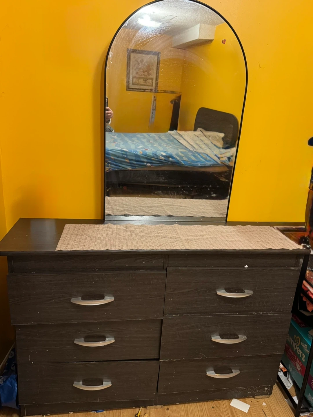 This dresser features six drawers for ample storage. It's made of dark brown wood-look material with silver-toned handles. A matching arched mirror is attached. It's great for a bedroom.