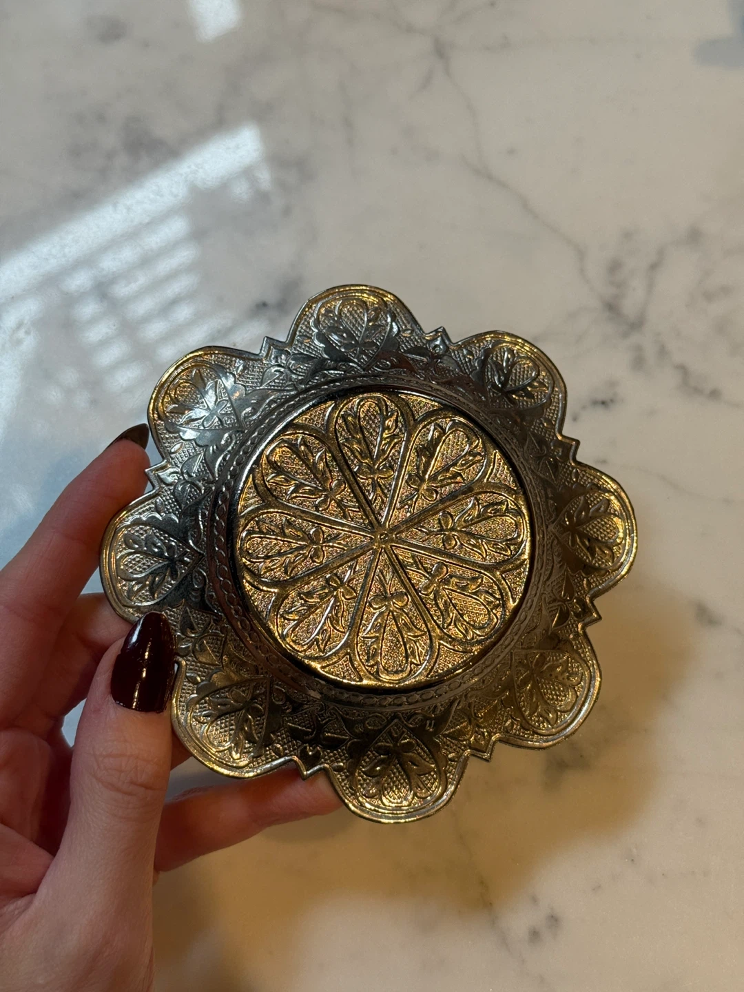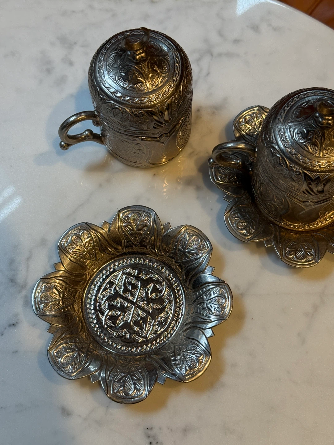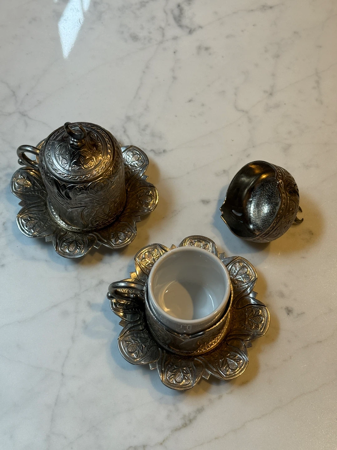 These two ornate Turkish coffee cups come with matching saucers and lids. They're crafted from metal with intricate embossed designs. The cups feature white ceramic inserts for drinking. A beautiful addition to any coffee lover's collection!