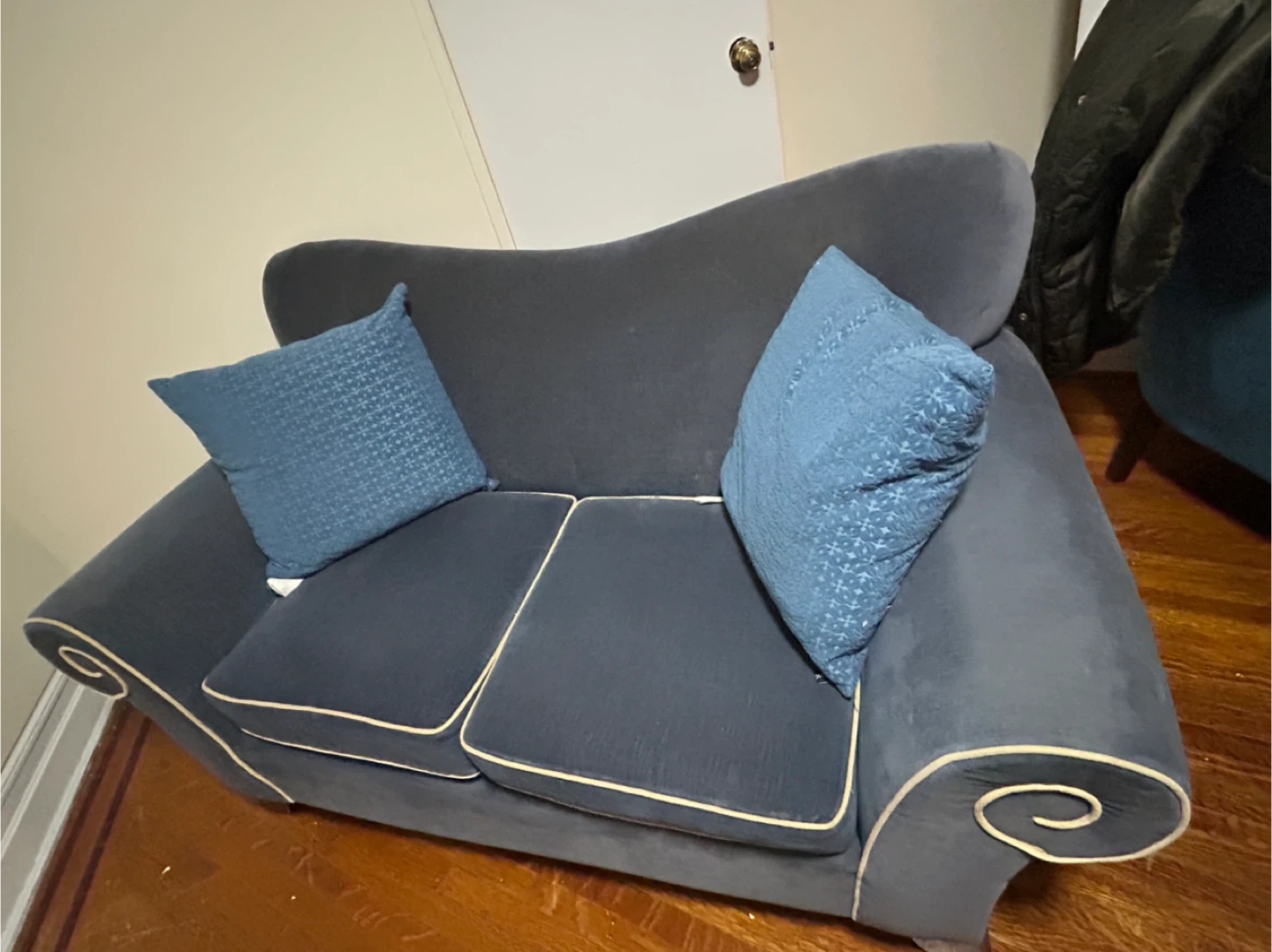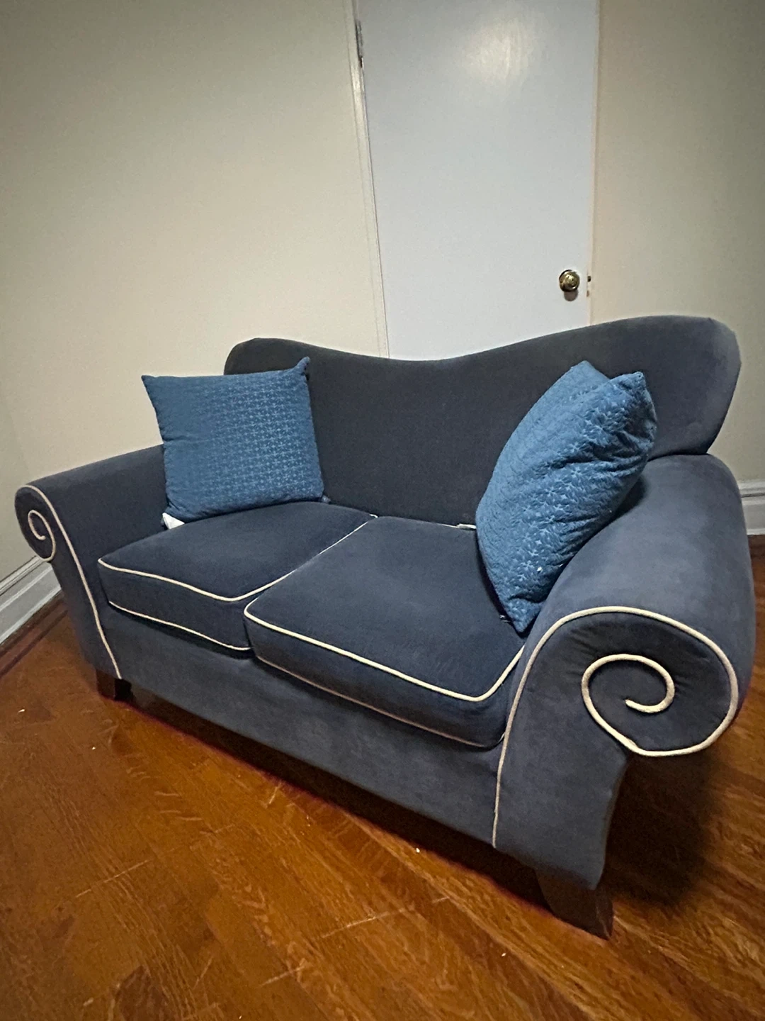 This dark blue loveseat offers comfortable seating for two. It features decorative piping along the edges. The two matching accent pillows not included. Its curved arms and scroll details give it a unique look.