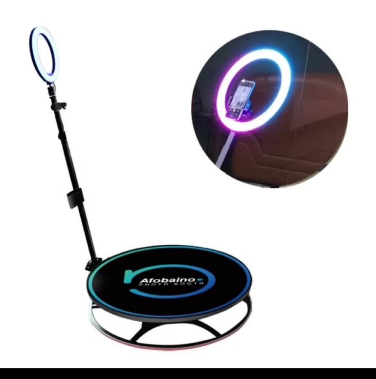 This is a 360 photo booth spinner platform by Afobaino. It's designed for events and parties to create unique slow-motion videos. Platform is made of durable material with integrated LED lighting.