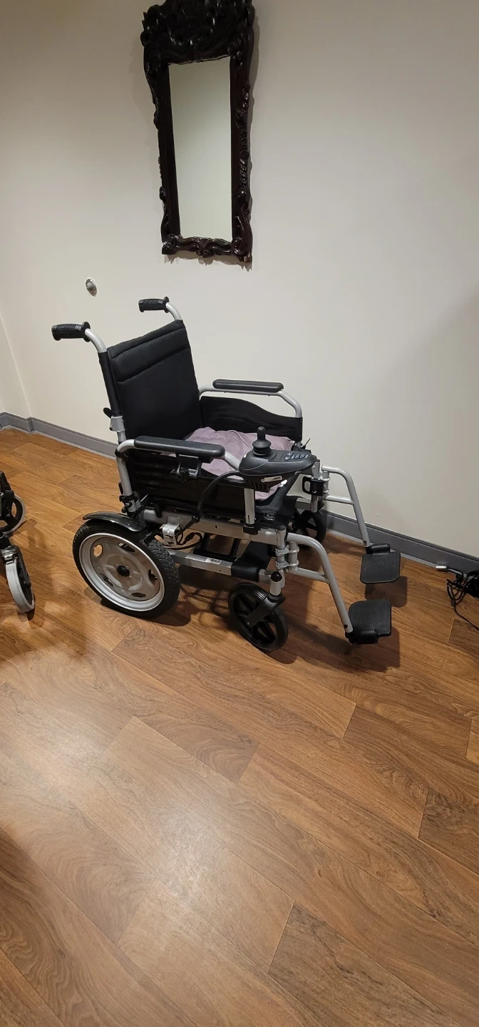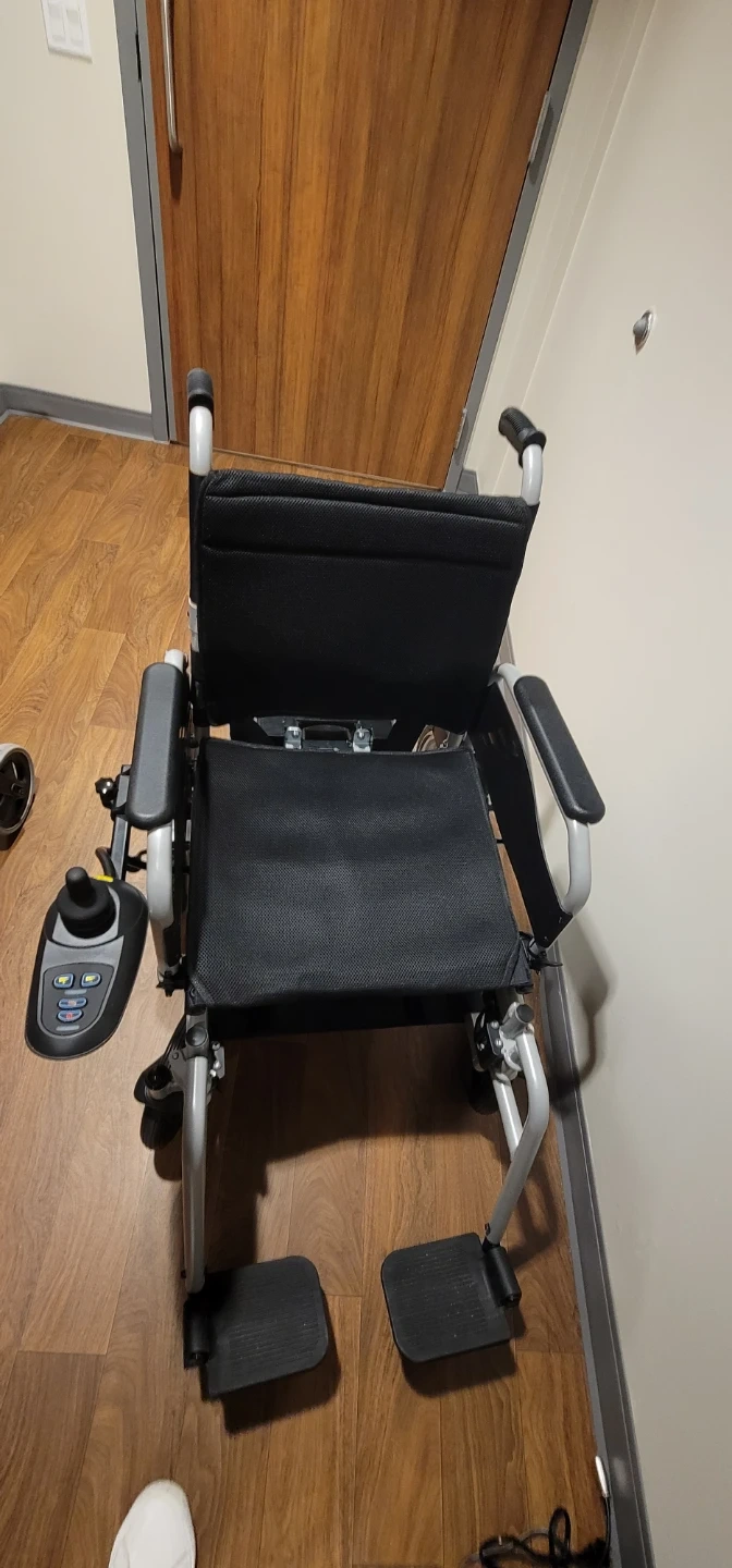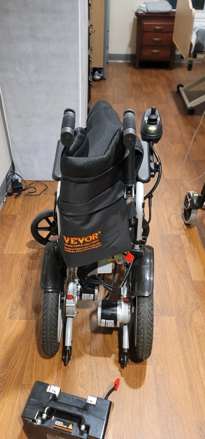 This is a Vevor electric wheelchair. It's black with silver accents. The wheelchair includes a joystick controller and footrests.
