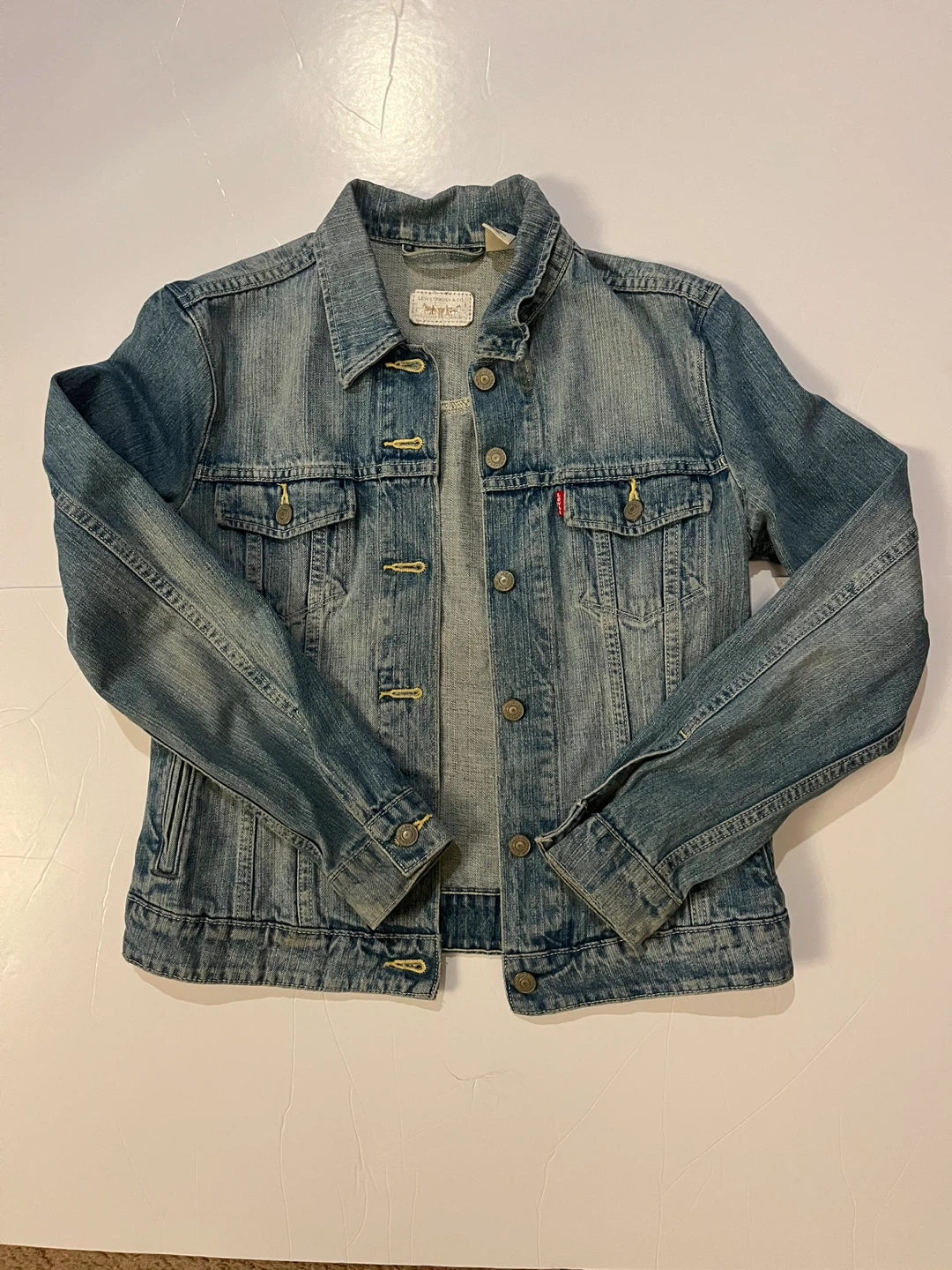 Classic Levi's denim trucker jacket in a blue wash. It's made of 100% cotton. This jacket is a versatile staple for any wardrobe. Medium size for women’s