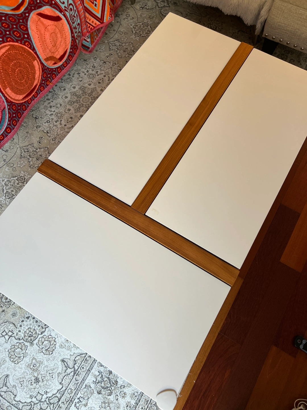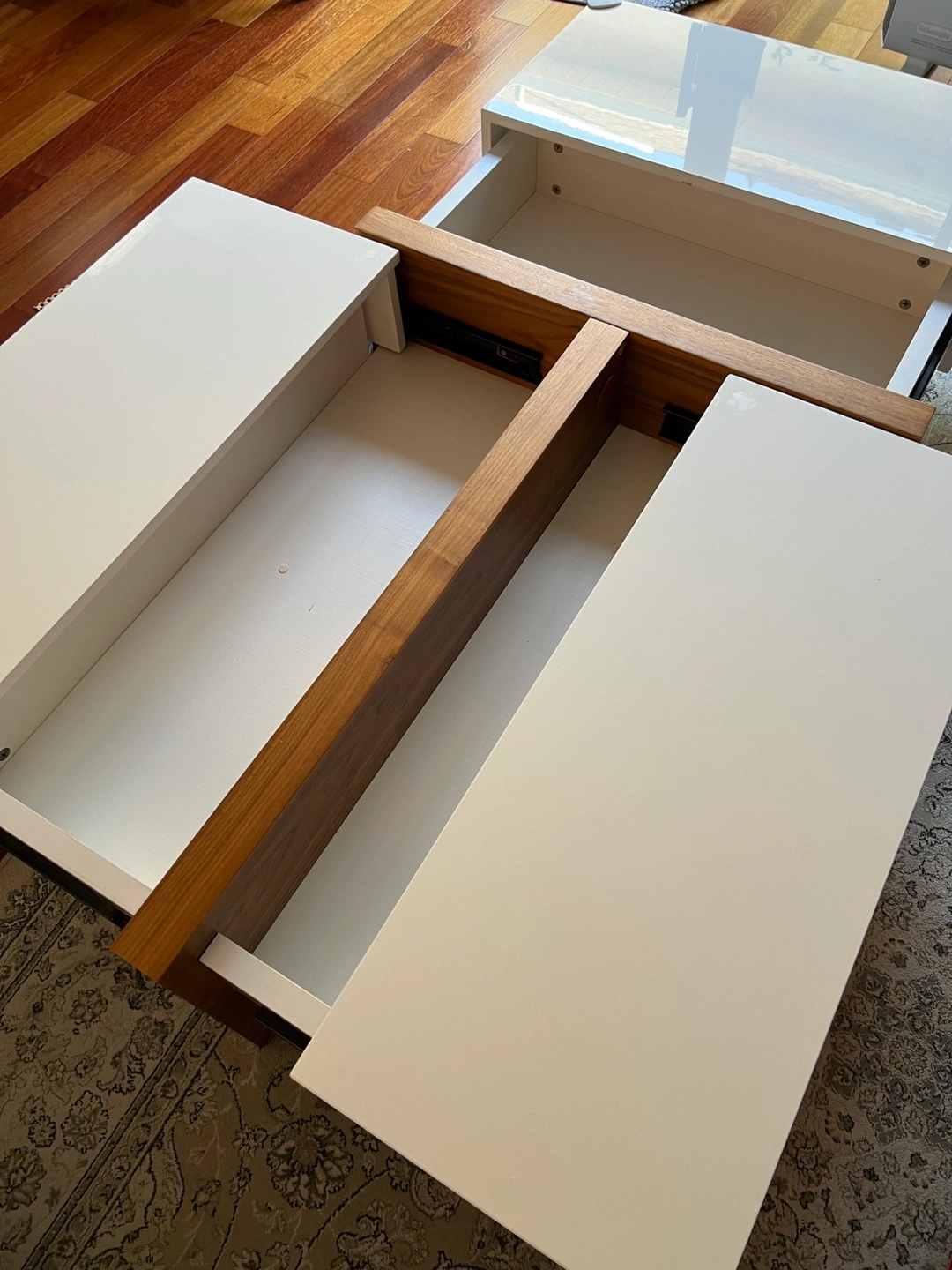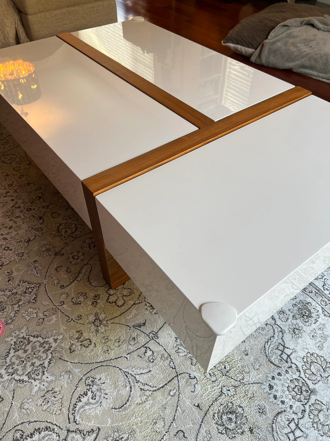 Stylish coffee table. White high-gloss finish. Walnut coloured wood accents. Features lift-top and storage compartments. Great for small spaces.